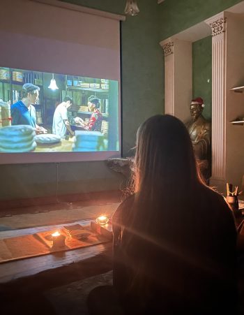 Также в чайной есть проектор и большой экран – Вы можете принести свою флешку с фильмом или попросить заранее нас скачать нужный фильм и устроить индивидуальный кинопоказ с чаем!