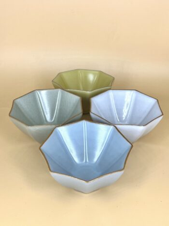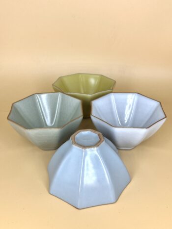 Классические правильные для глазури Жу Яо оттенки. Разный рисунок кракле в зависимости от состава (цвета) глазури. Полу-гляцевая глазурь. Имитация старинной технологии заливки глазурью – каёмка коричневого цвета под цвет глины.