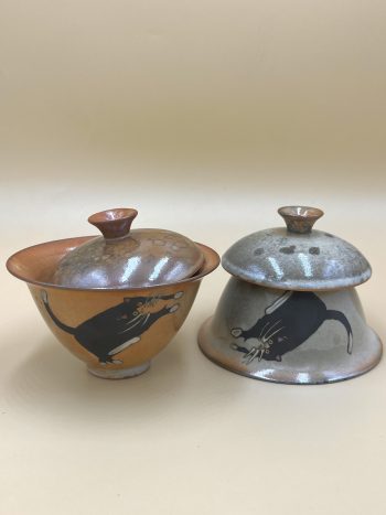 Яркая гайвань без блюдца с полу-глянцевой градиентой глазурью, мелкий рисунок кракле. Матовая шероховатая крышка на внутренней стороне. Украшена очаровательным чёрным толстым игривым котом, яркий градиент от кирпично-рыжего до серого, эффектный природный рисунок пятен и оттенков.