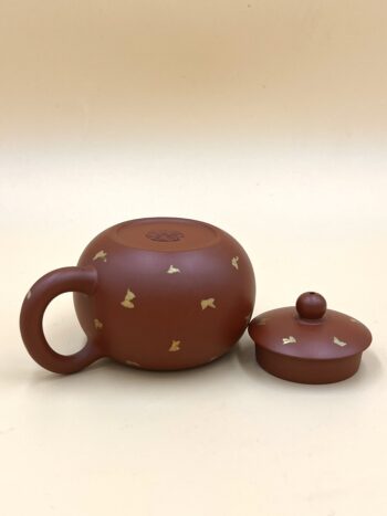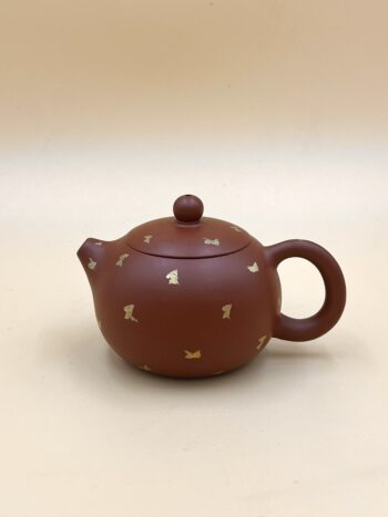 Аккуратный чайник-эгоист из исинской глины. Классическая форма Си Ши, золотые трафаретные рисунки по всему чайнику. Подходит под любые чаи. Рассчитан на 1-2 человек.