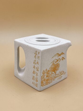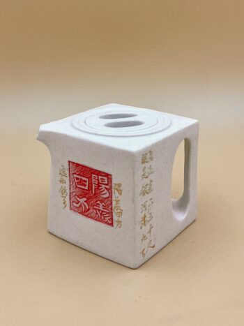 Квадратный чайник из белой исинской глины. На боковине красным название чайника – 四方阳羡, по бокам золотые надписи: слева что это ручная авторская работа, справа имя мастера Ли Лучуня.