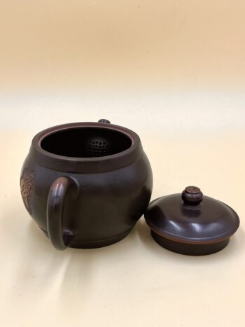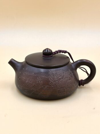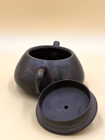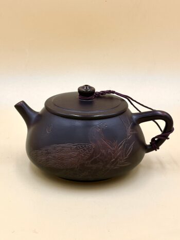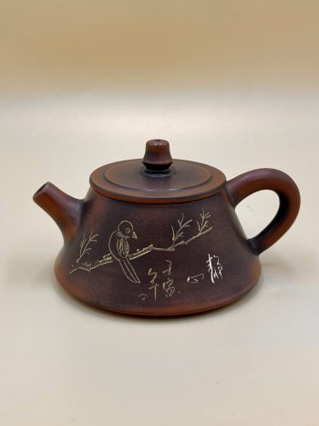 Классический по форме, но не по содержанию чайник из Исинской и Нисинской керамик, ручная работа с ручной резьбой птички на ветке. Полное название чайника “Плоский ковш для медитации” 静心扁瓢.