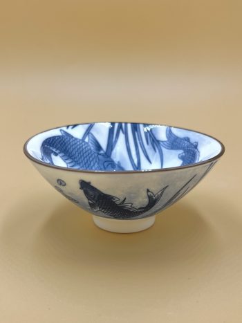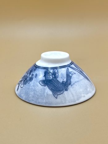 Классическая фарфоровая пиала средней толщины. Синяя печать изображения карпов в пруду внутри пиалы и снаружи.