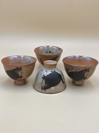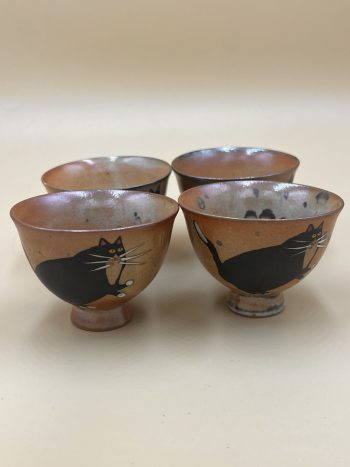 Тактильная, полу-рельефная глазурь гладкая и одновременно текстурная. Матовая внутри, полу-глянцевая снаружи. Яркие разводы и пятна кирпично-серого оттенка, чёрный матовый толстый кот на внешней стороне, на глазури имеется мелкий рисунок кракле.