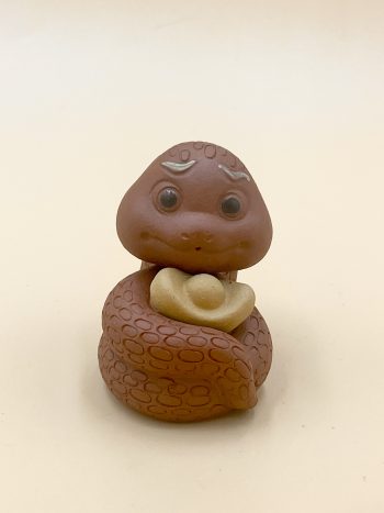 Удивленный змей кирпично-красного оттенка глины имеет детализированную текстуру шкурки, поднятые брови и слиток Юаньбао из желтой глины.