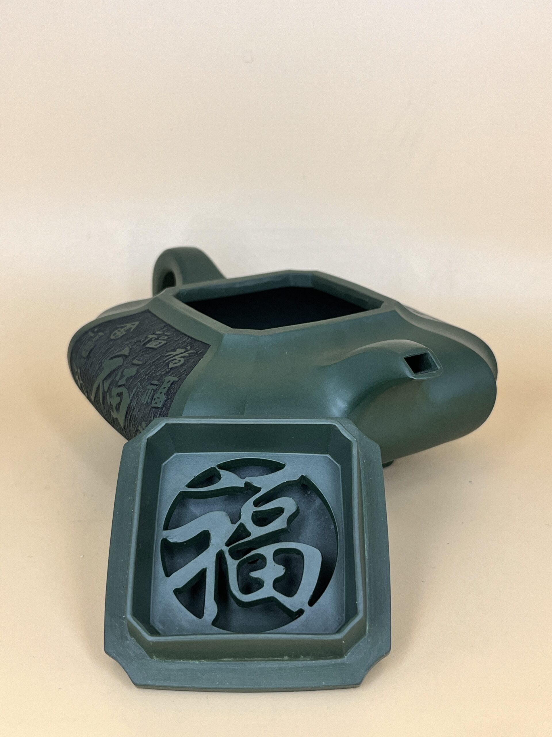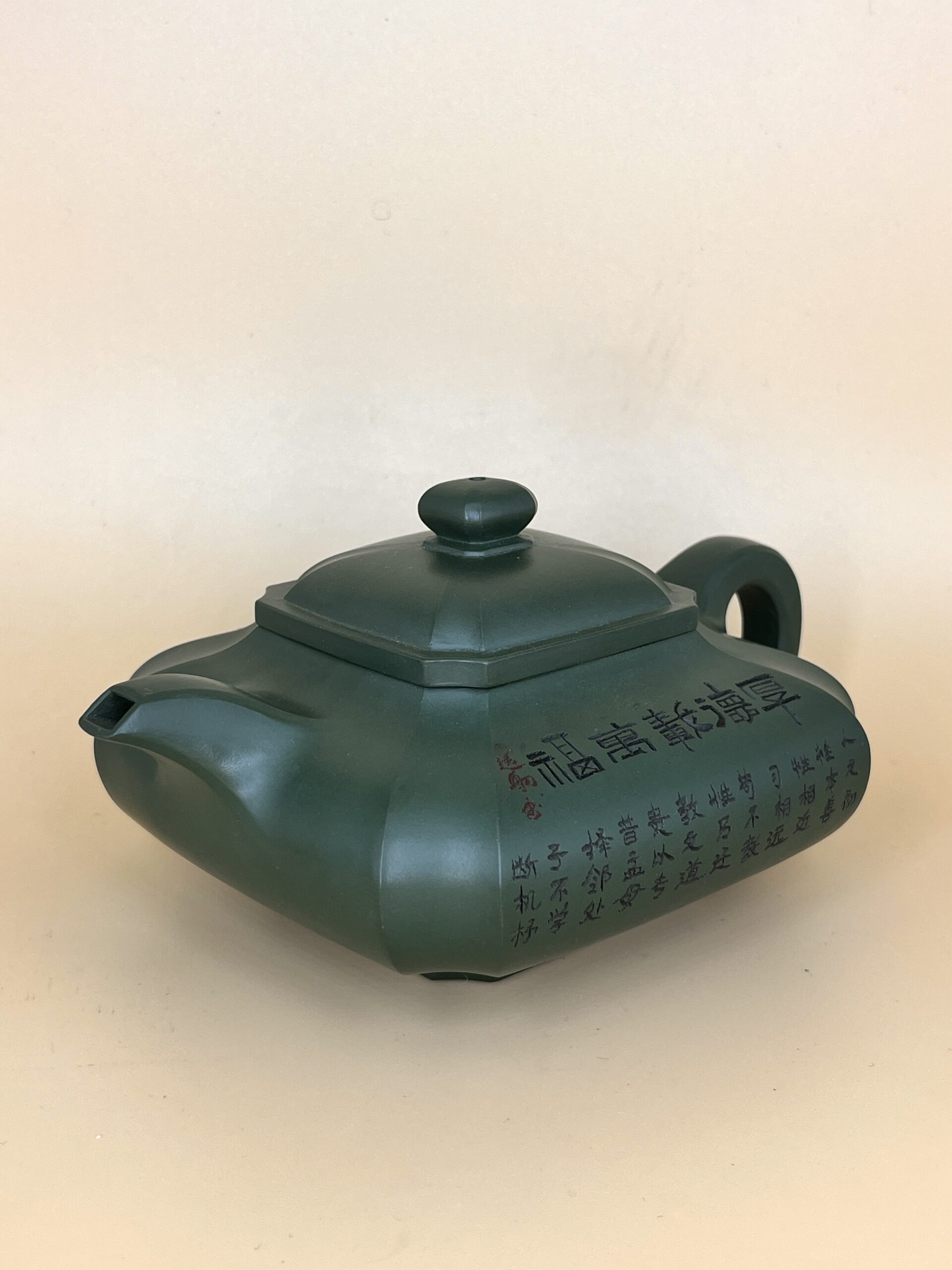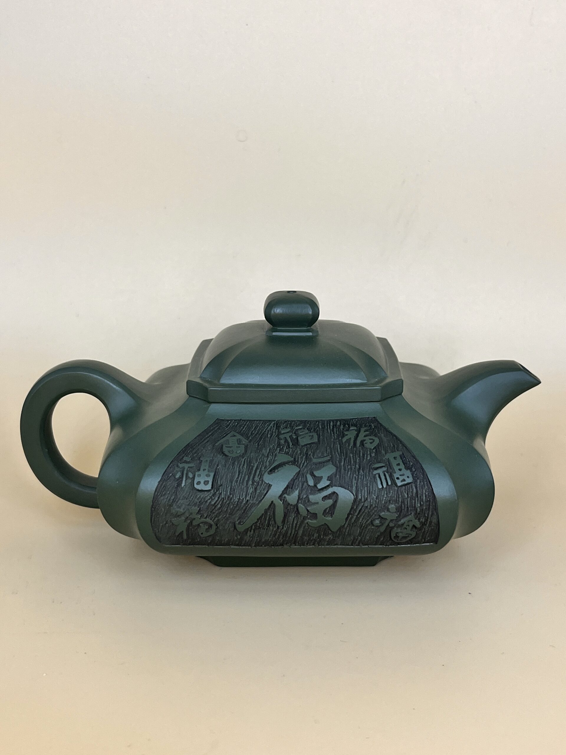 Сложный мастеровой чайник ручного производства. Геометричность сбалансированная округлостью. Близко по форме к Чоу Цзяо Цан Лю Фан или Чоу Цзяо Сюйбянь (抽角, чоу цзяо, – канавка или бороздка, технический прием, который зрительно округляет угловатость формы). Тяжёлый и основательный с явной Янской (мужской) энергией. Подойдет для чаепития на 3-10 человек.