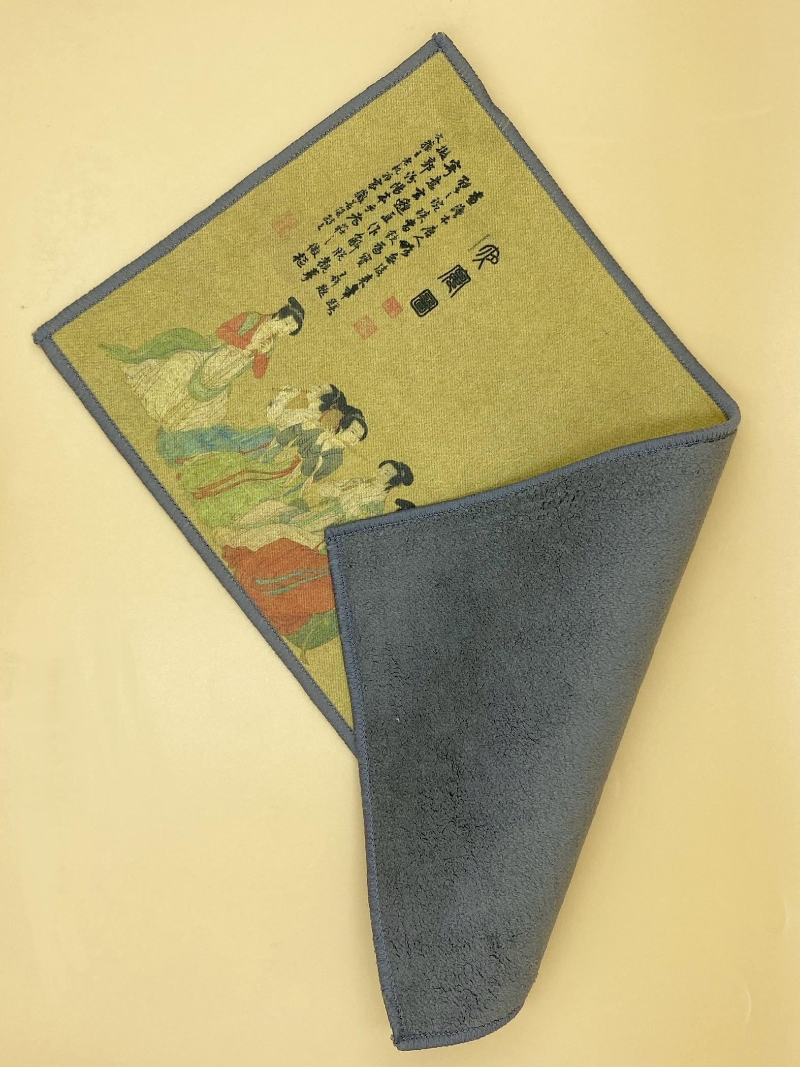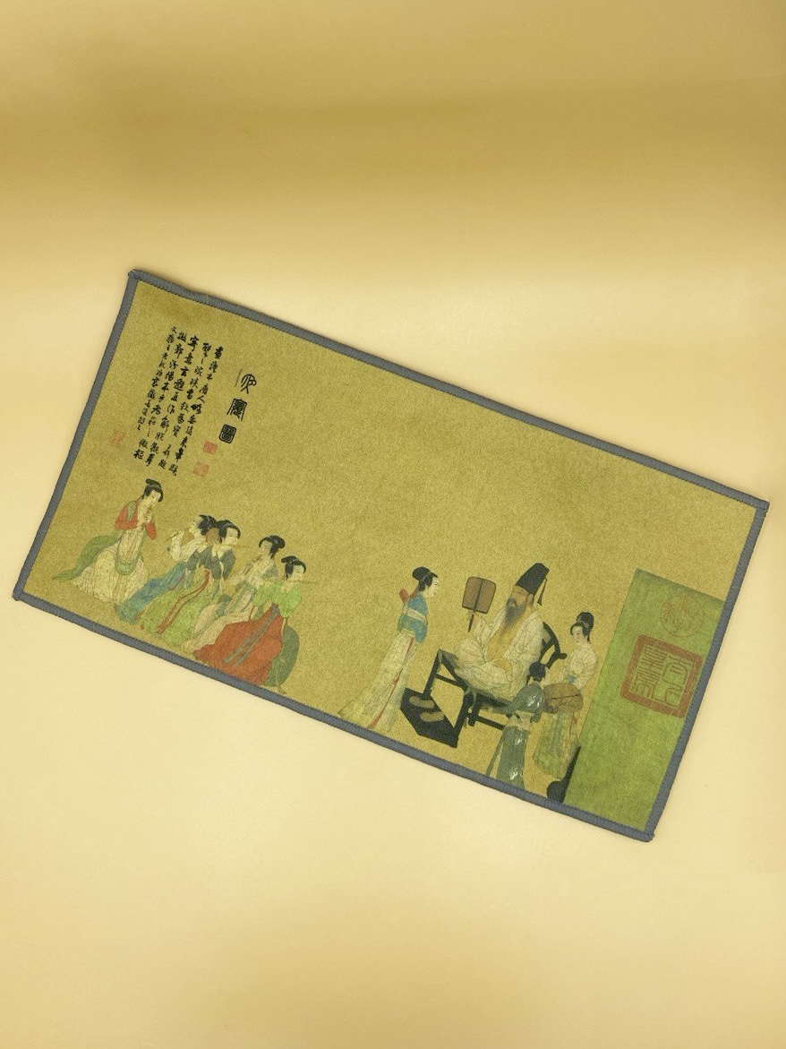 На полотенце изображена часть свитка династии Сун «Ночная Пирушка у Хань Сицзая». На оригинальном трехметровом свитке изображается пять сцен, полностью их можно увидеть в галерее товара