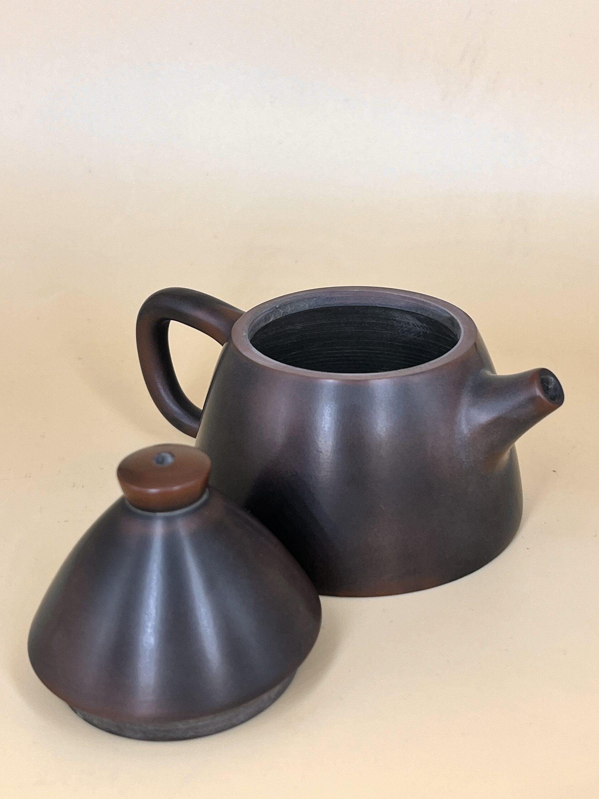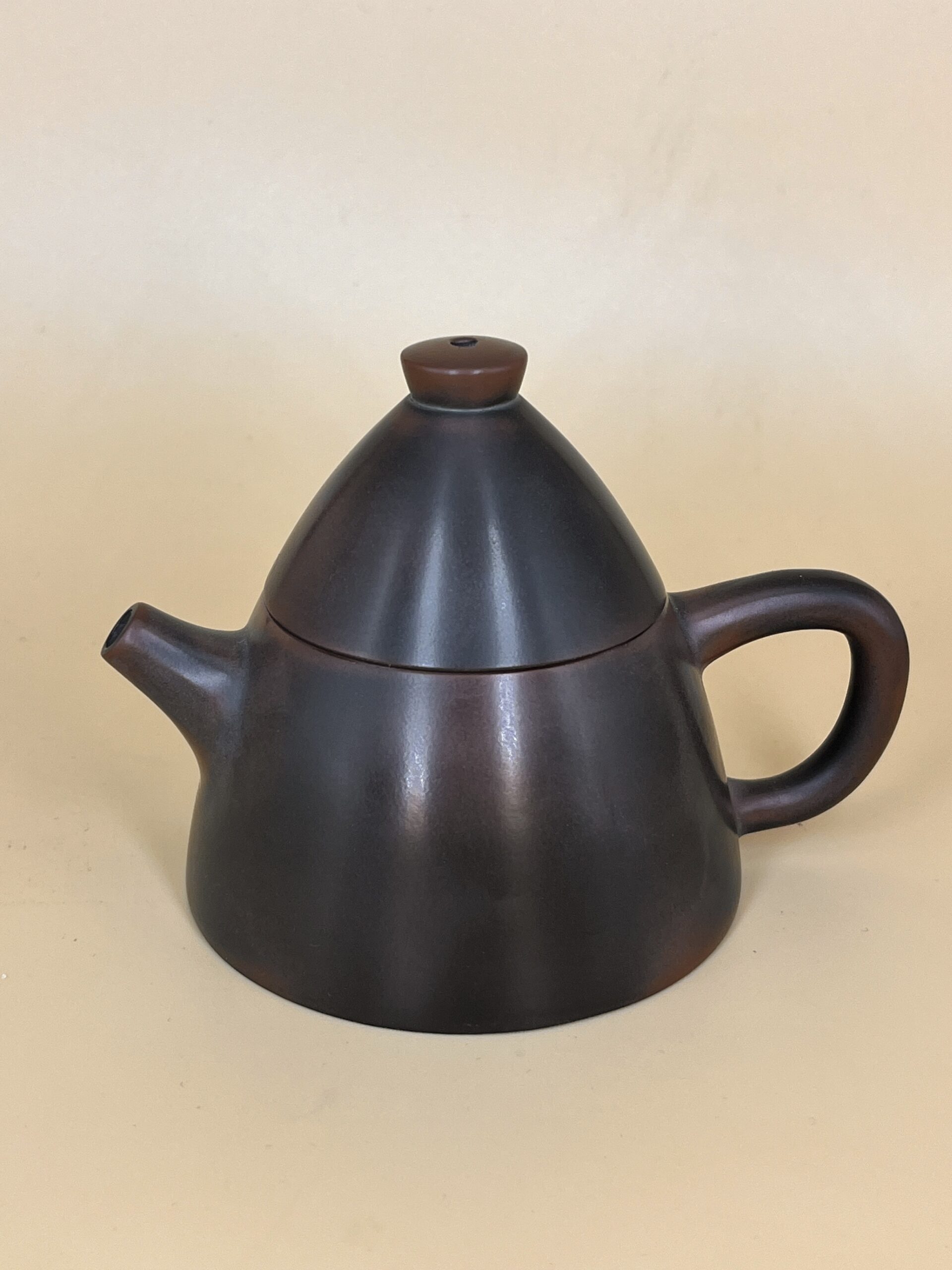 Классический по окрасу чайник керамики Нисин из Цзиньчжоу, провинция Гуанси. Авторская конусообразная интерпретация классической формы Ши Пяо – Каменный Ковш, с достроенной по геометрии чайника “шапочкой”.
