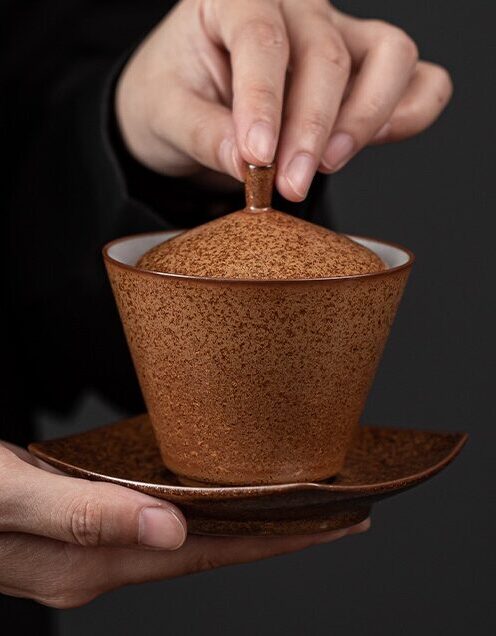 Гайвань нестандартной вытянутой геометричной формы, средняя толщина стенки, керамика Цзиндэчжэнь. Чёткие линии, строгая элегантность. Требует тонкого обращения, хорошо подойдёт для небольшой руки. Церемониальный яркий вариант, делает заваривание плавным и аккуратным.