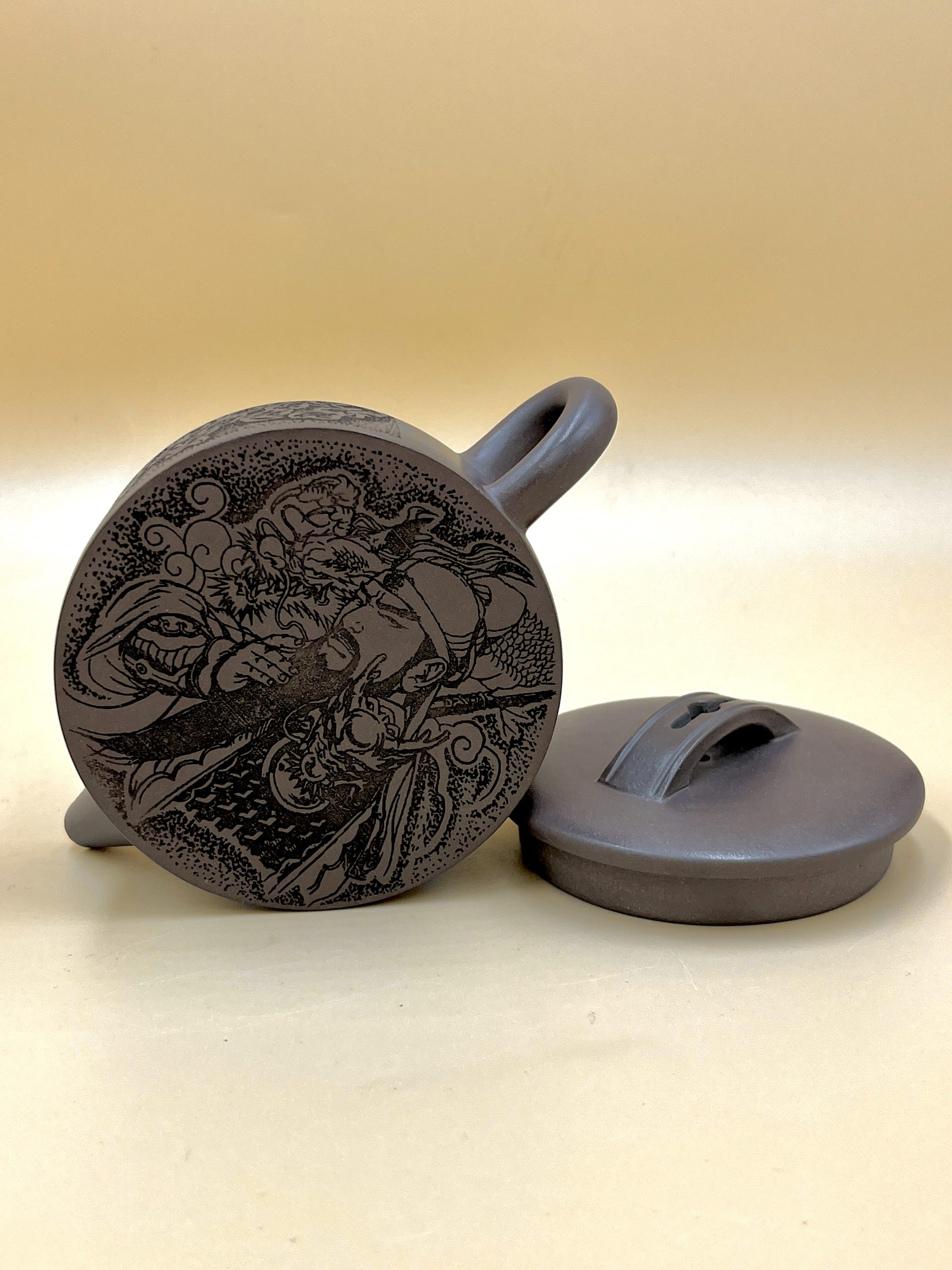 На дне чайника гравировка с изображением полководца Гуань Гун (Гуан Юй кит. трад. 關羽, упр. 关羽, пиньинь Guān Yǔ) — военачальник царства Шу эпохи Троецарствия и один из главных героев средневекового романа «Троецарствие». В романе он выведен как идеал благородства, своего рода восточный Робин Гуд.