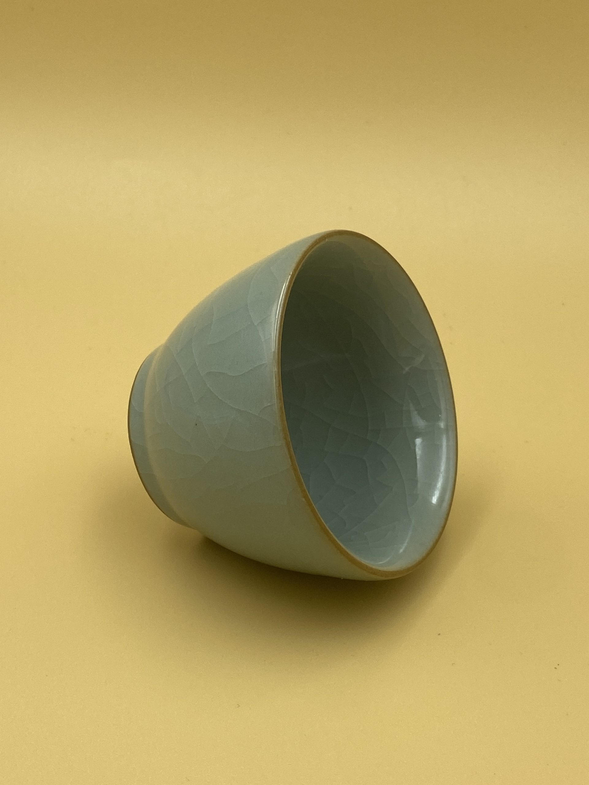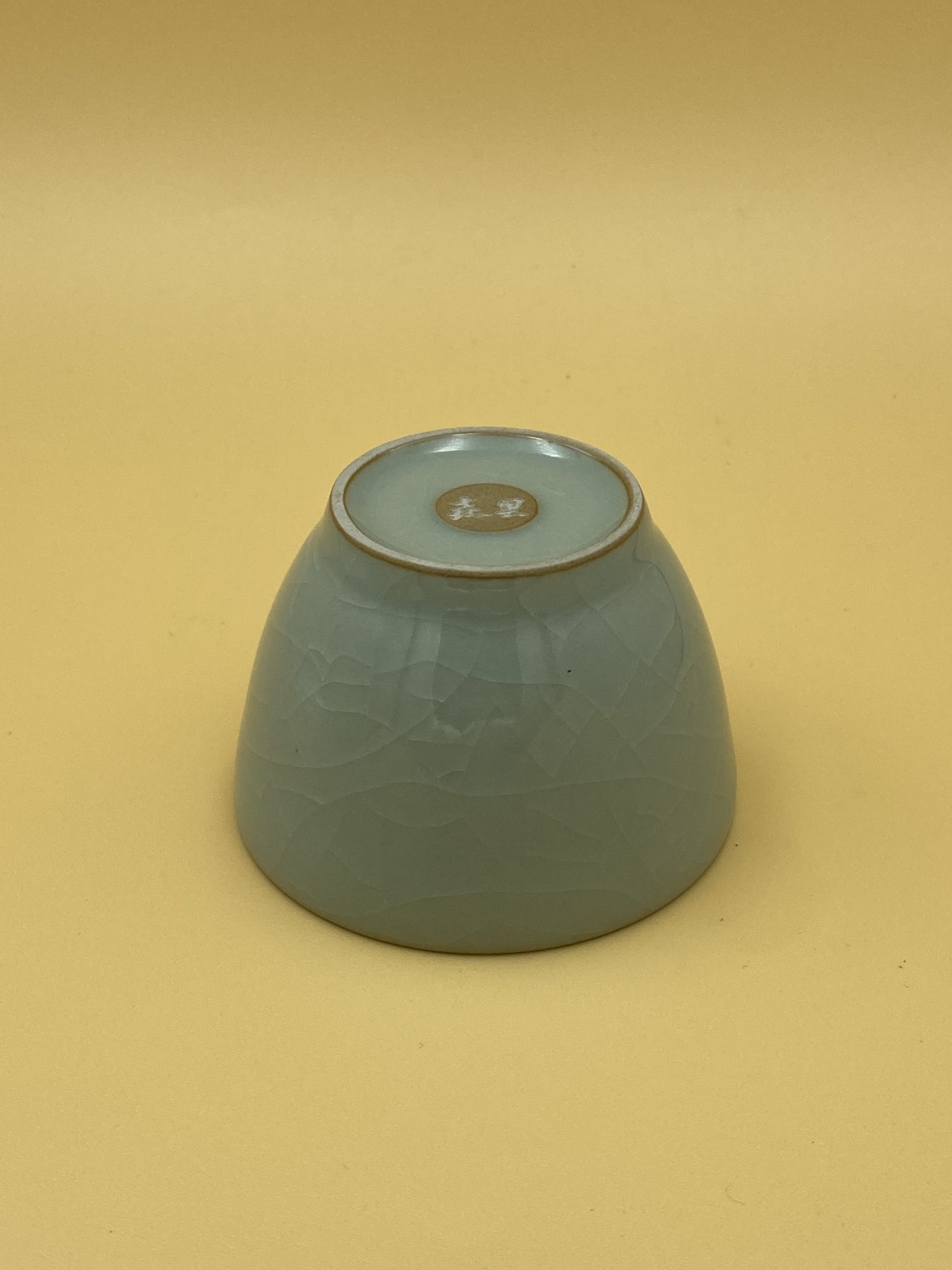 Чашка с толстыми стенками, светло-изумрудного цвета и эффектом кракле. Рисунок из трещинок на внешней стороне закрашен черной глазурью для создания эффекта наработанности.