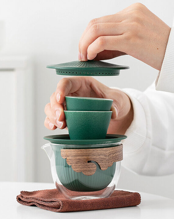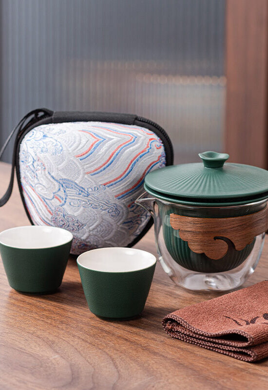 Компактный набор из 5 предметов в чехле: гайвань с крышкой-ситом, чахай (сливник), 2 пиалы. полотенце.