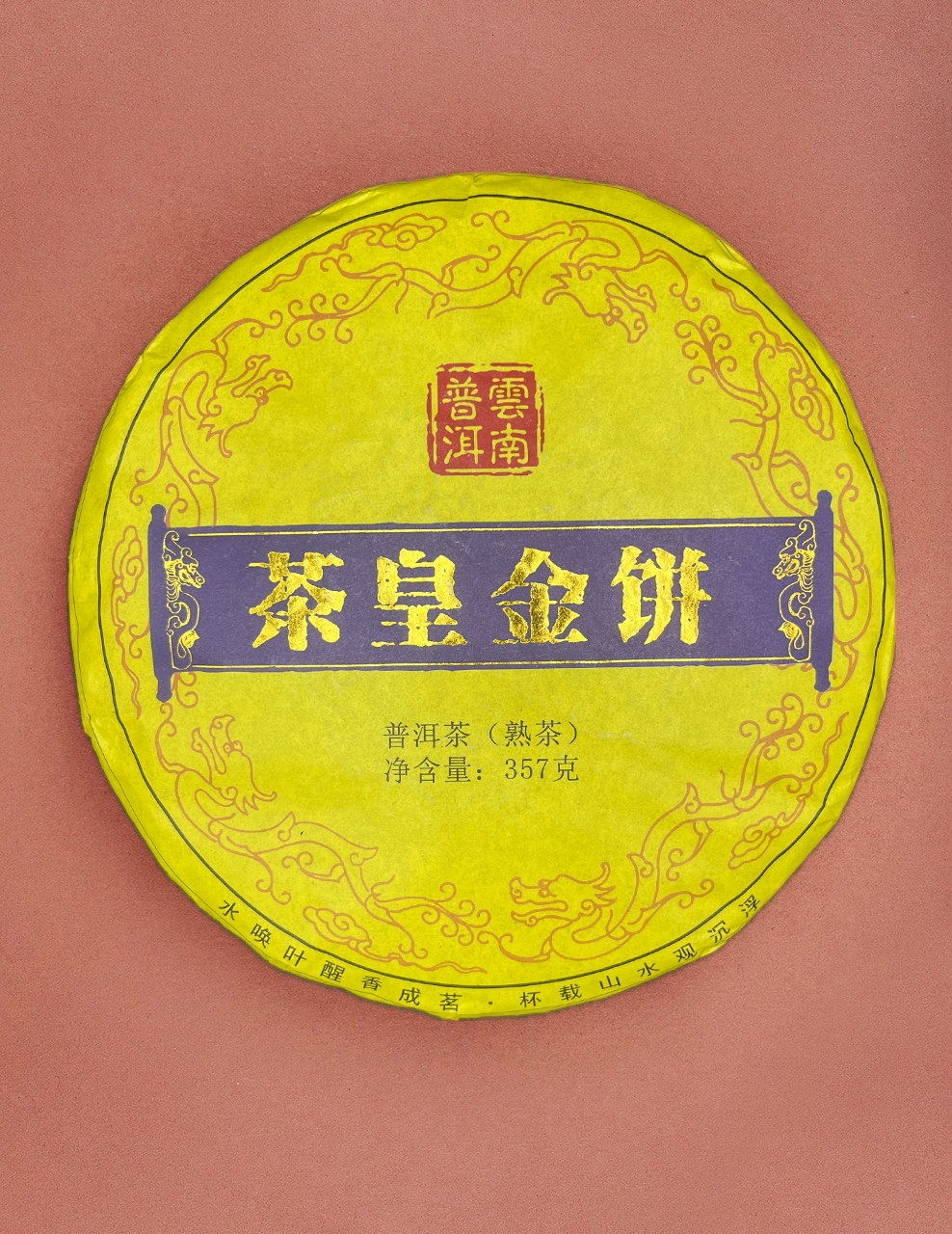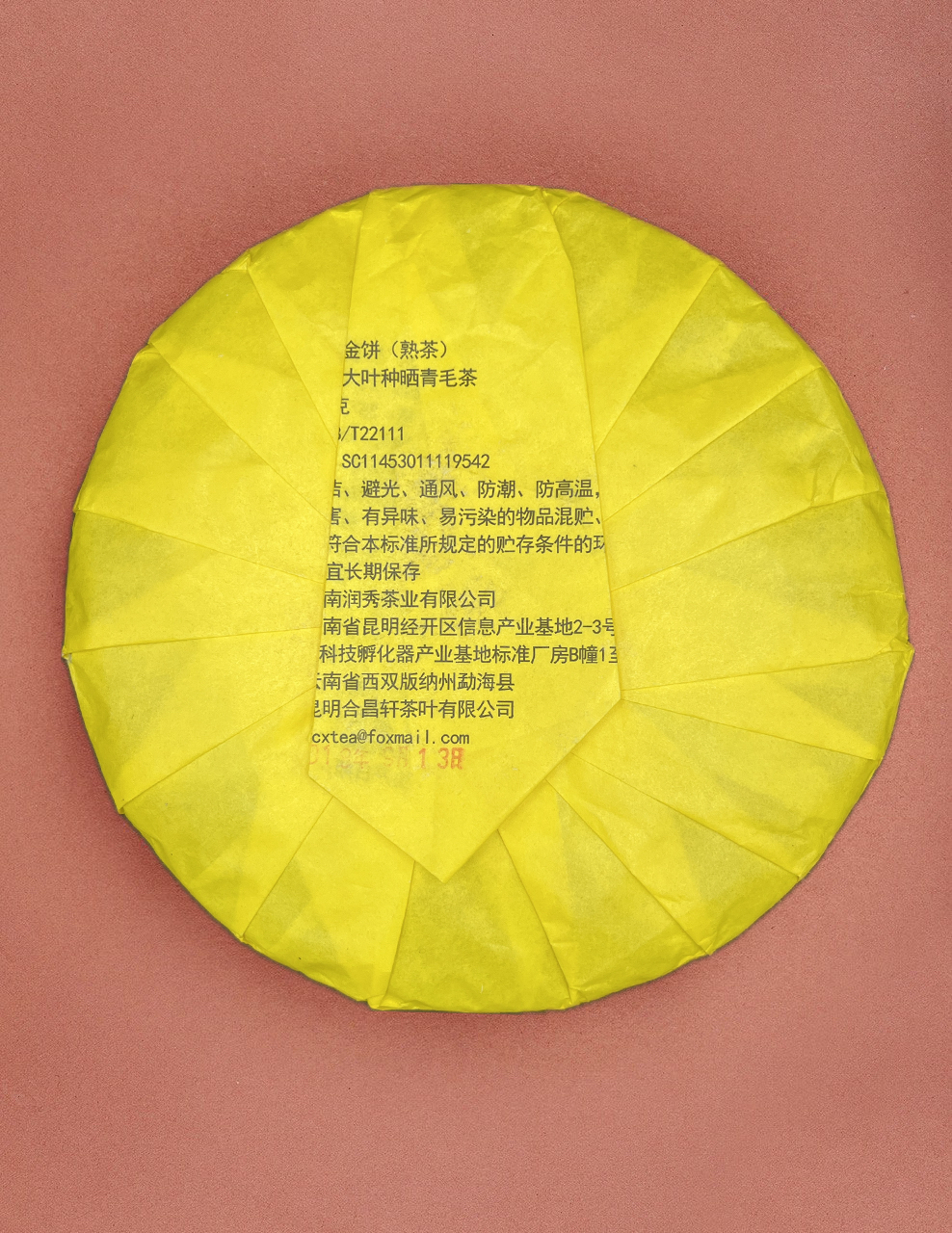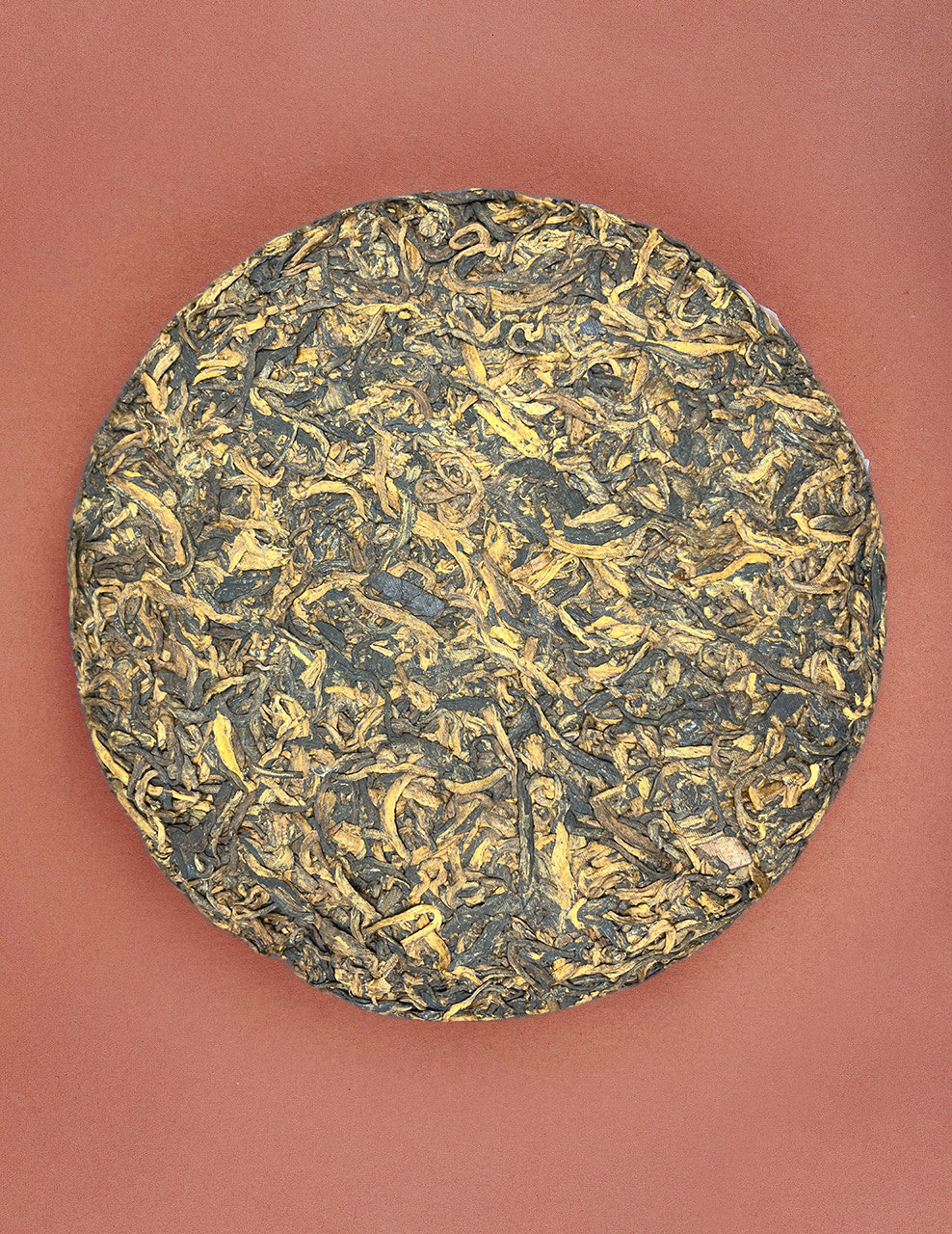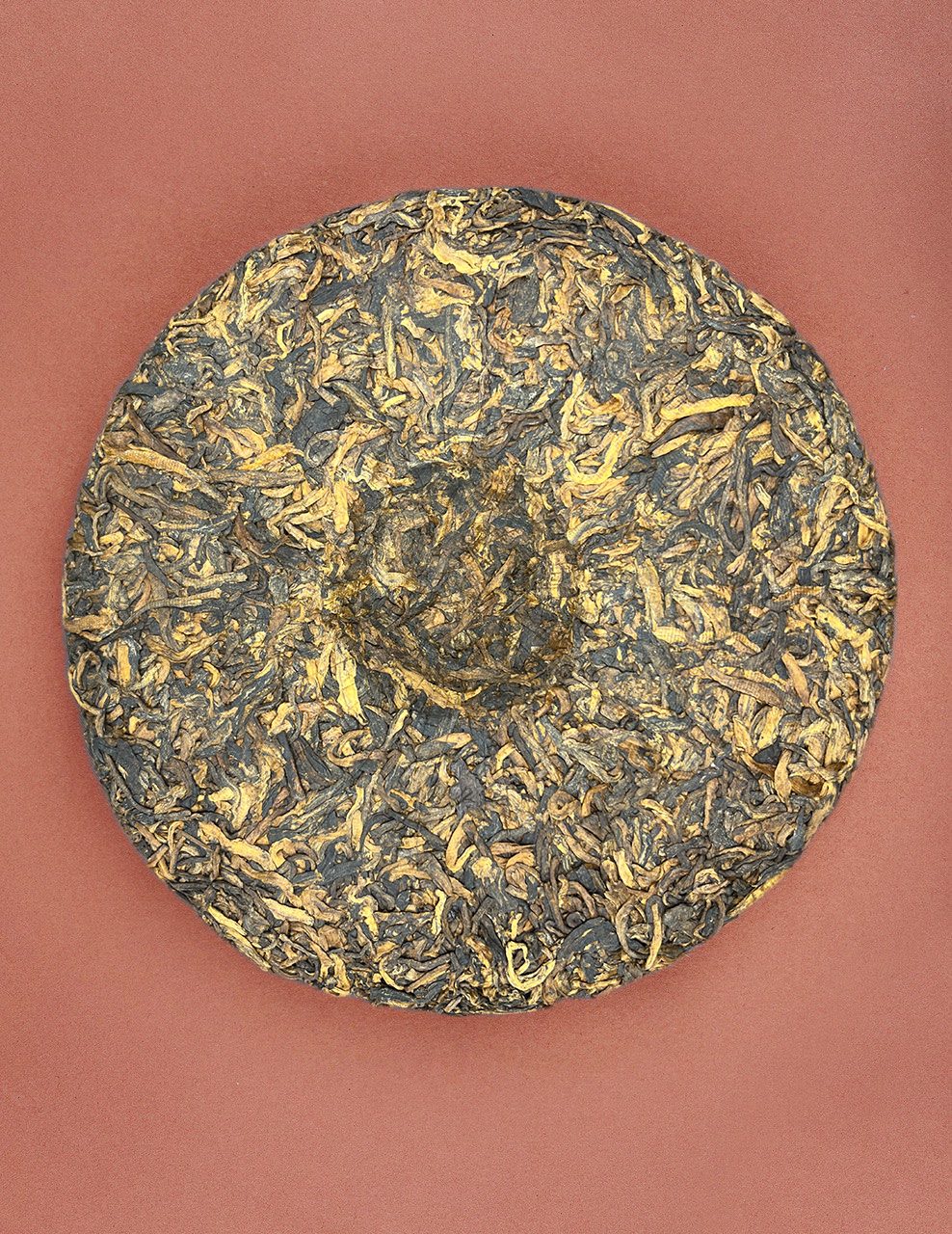 Необычное сырьё шу пуэра – крупные мясистые почки и листья мягкой ферментации, визуально блин похож на красный чай Да Я Цзинь Чжень или Золотой Феникс из-за сырья одного типа.