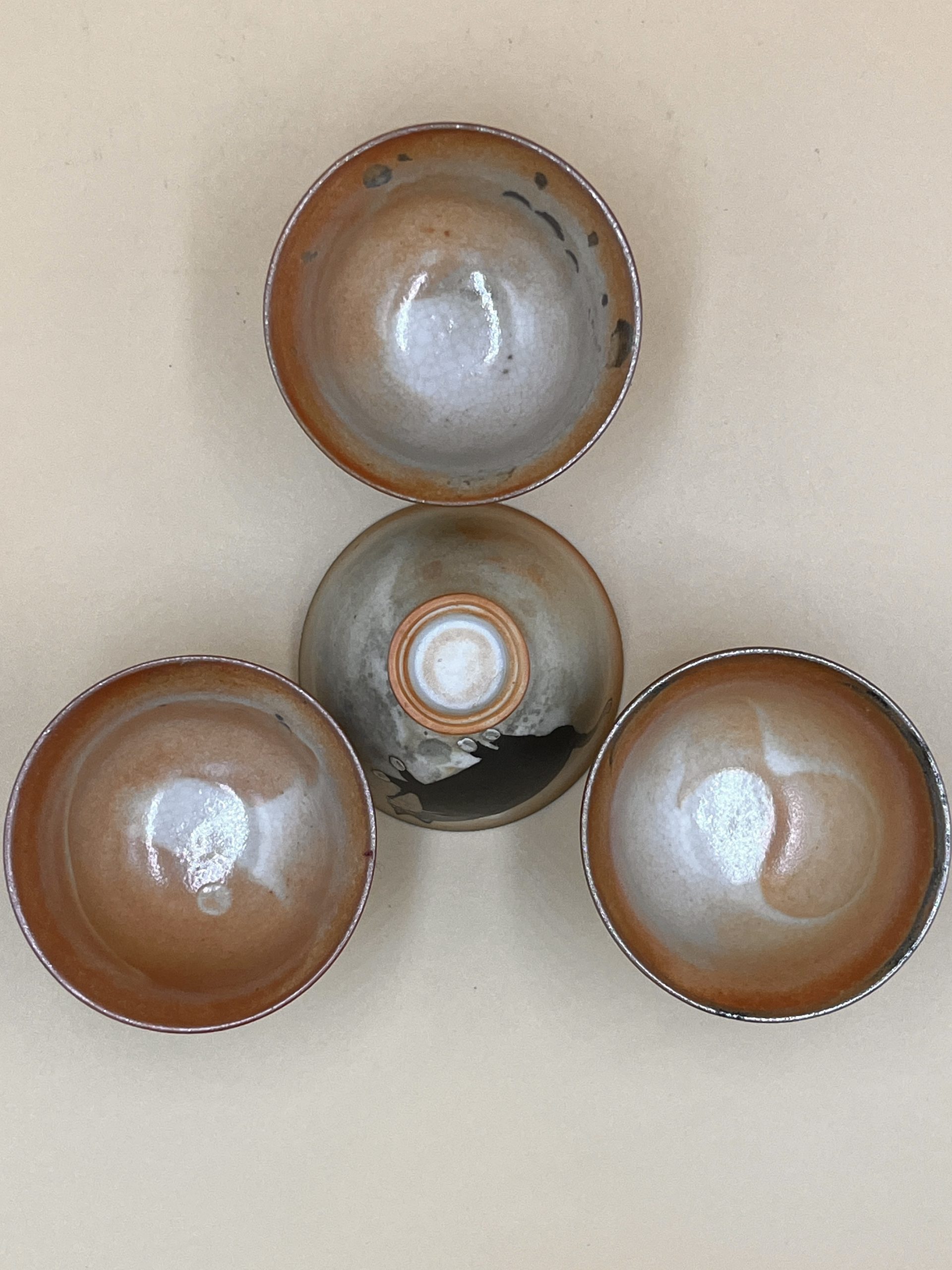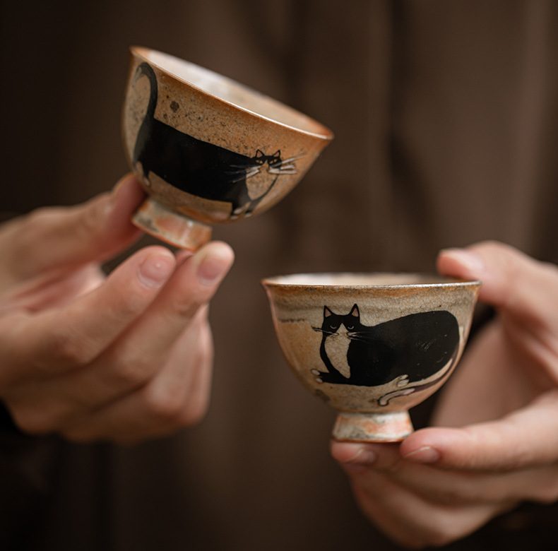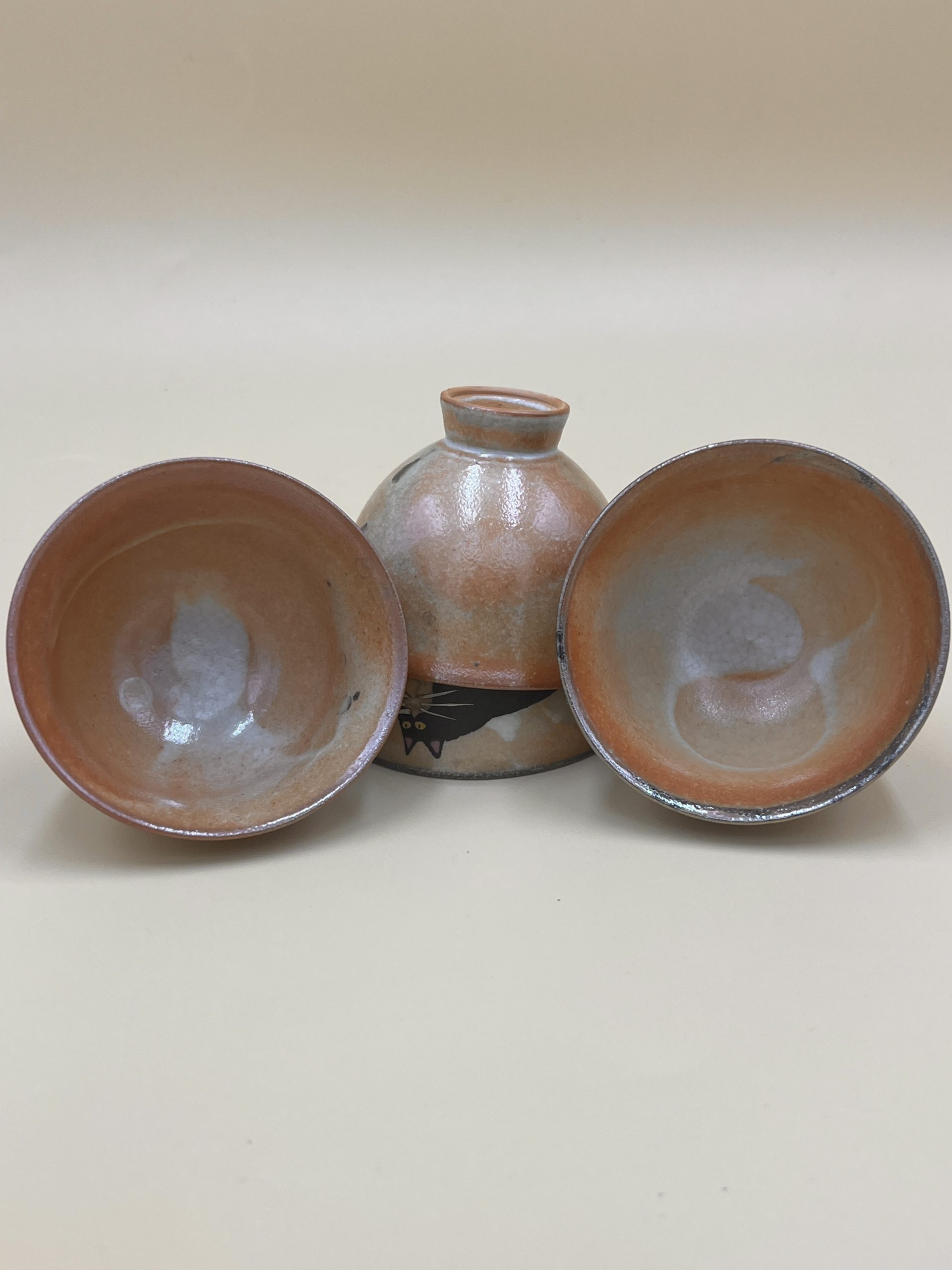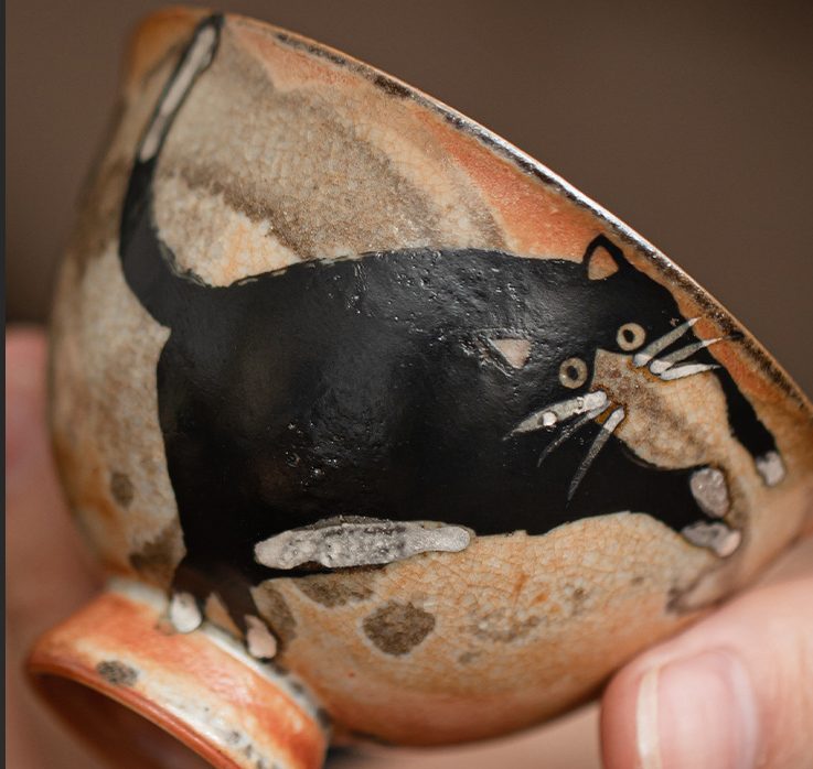 Тактильная, полу-рельефная глазурь гладкая и одновременно текстурная. Матовая внутри, полу-глянцевая снаружи. Яркие разводы и пятна кирпично-серого оттенка, чёрный матовый толстый кот на внешней стороне, на глазури имеется мелкий рисунок кракле.