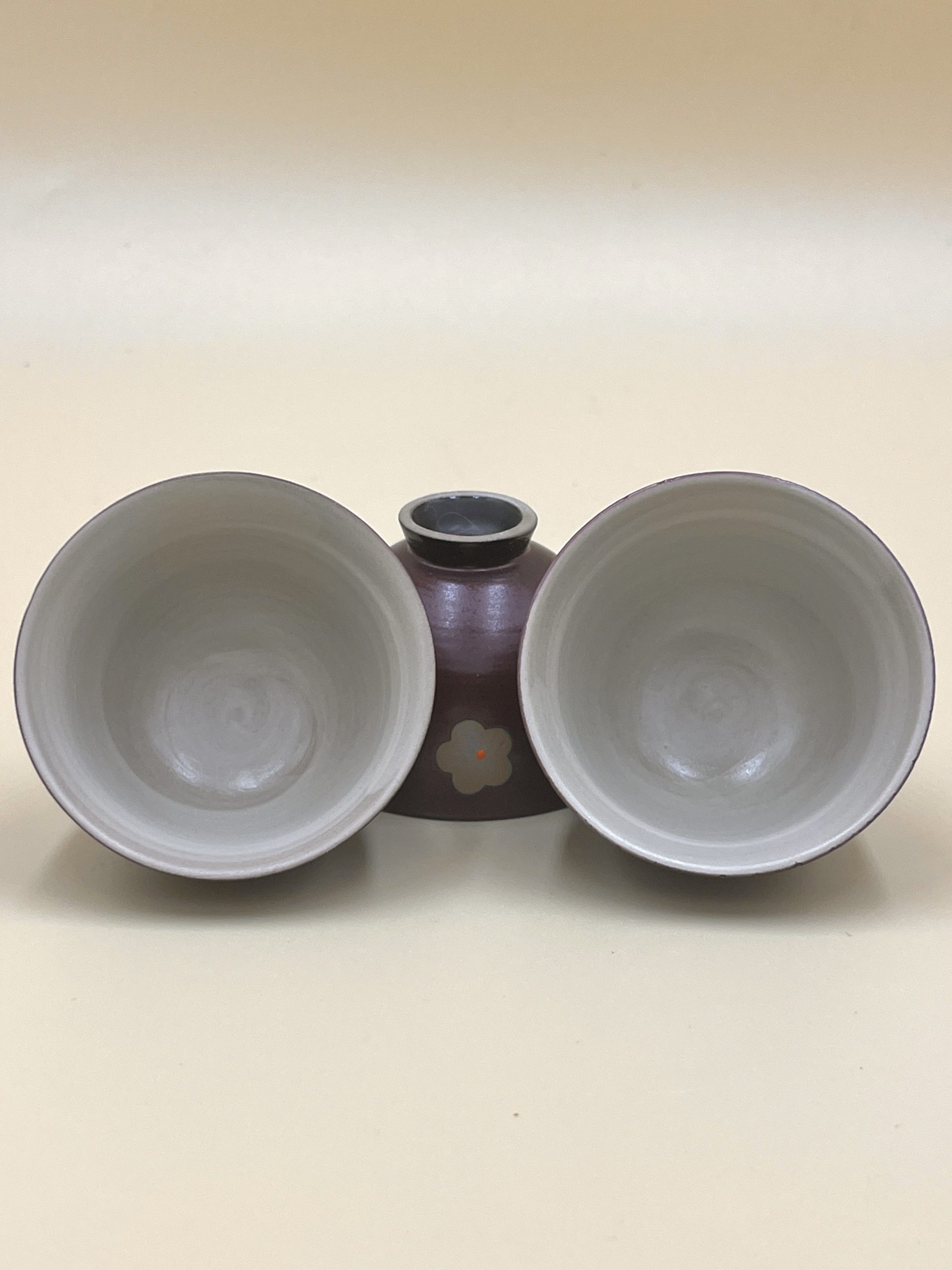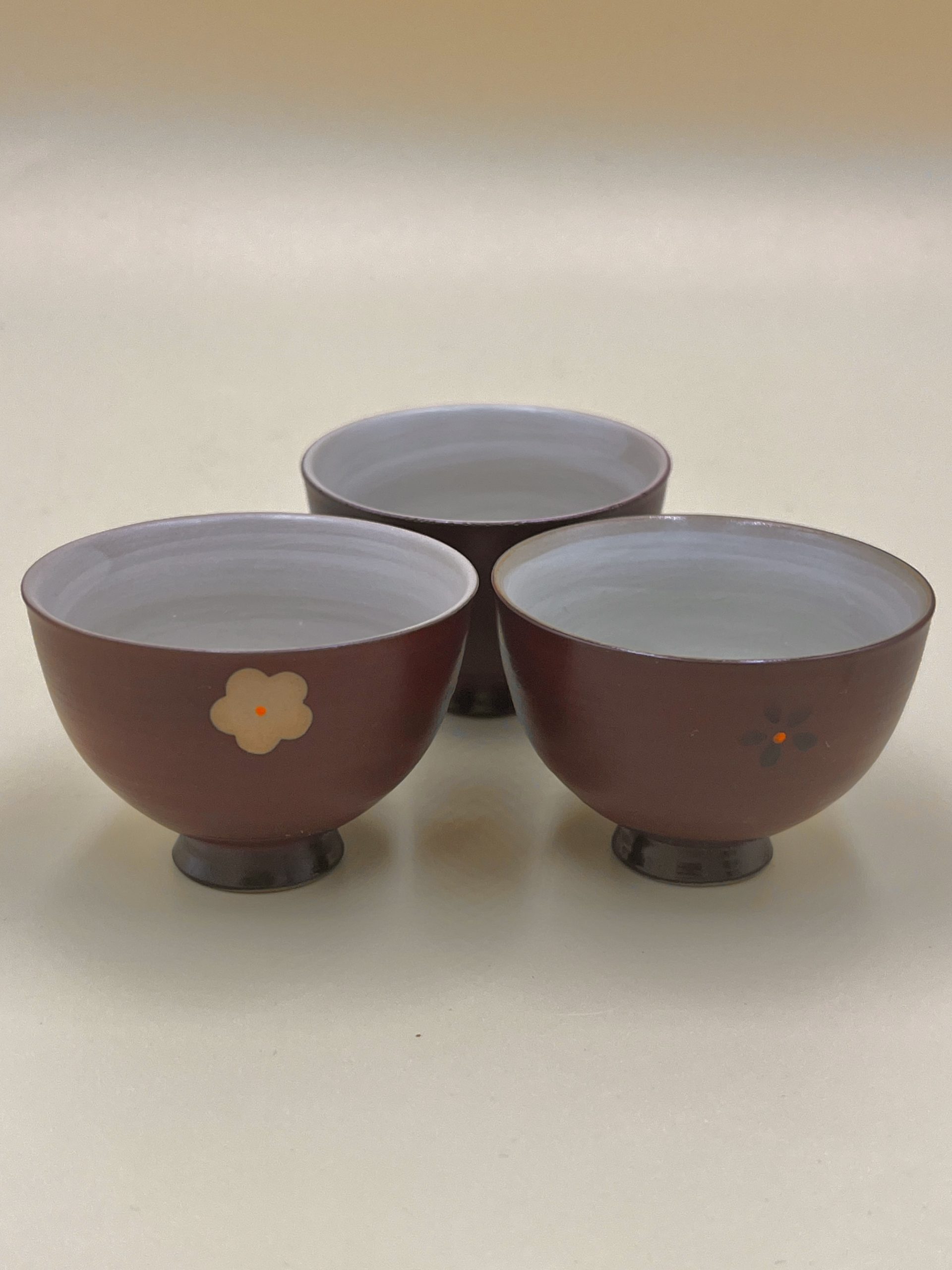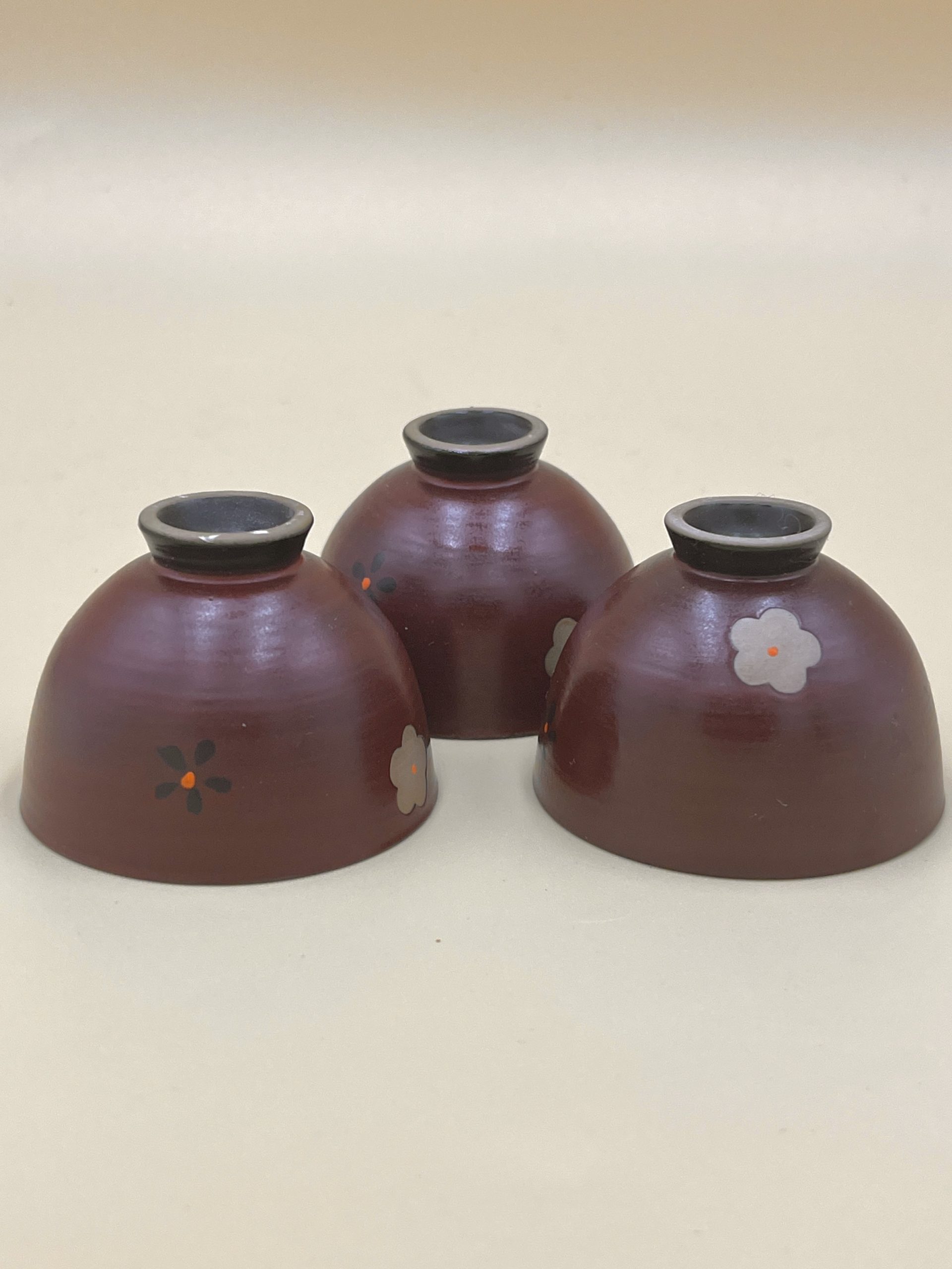 Бордовая пиала на ножке керамики Дэхуа с небольшими цветами. Матовая серо-бежевая глазурь внутри, бордовая полу-матовая глазурь мазками снаружи. Рельефные небольшие цветы.