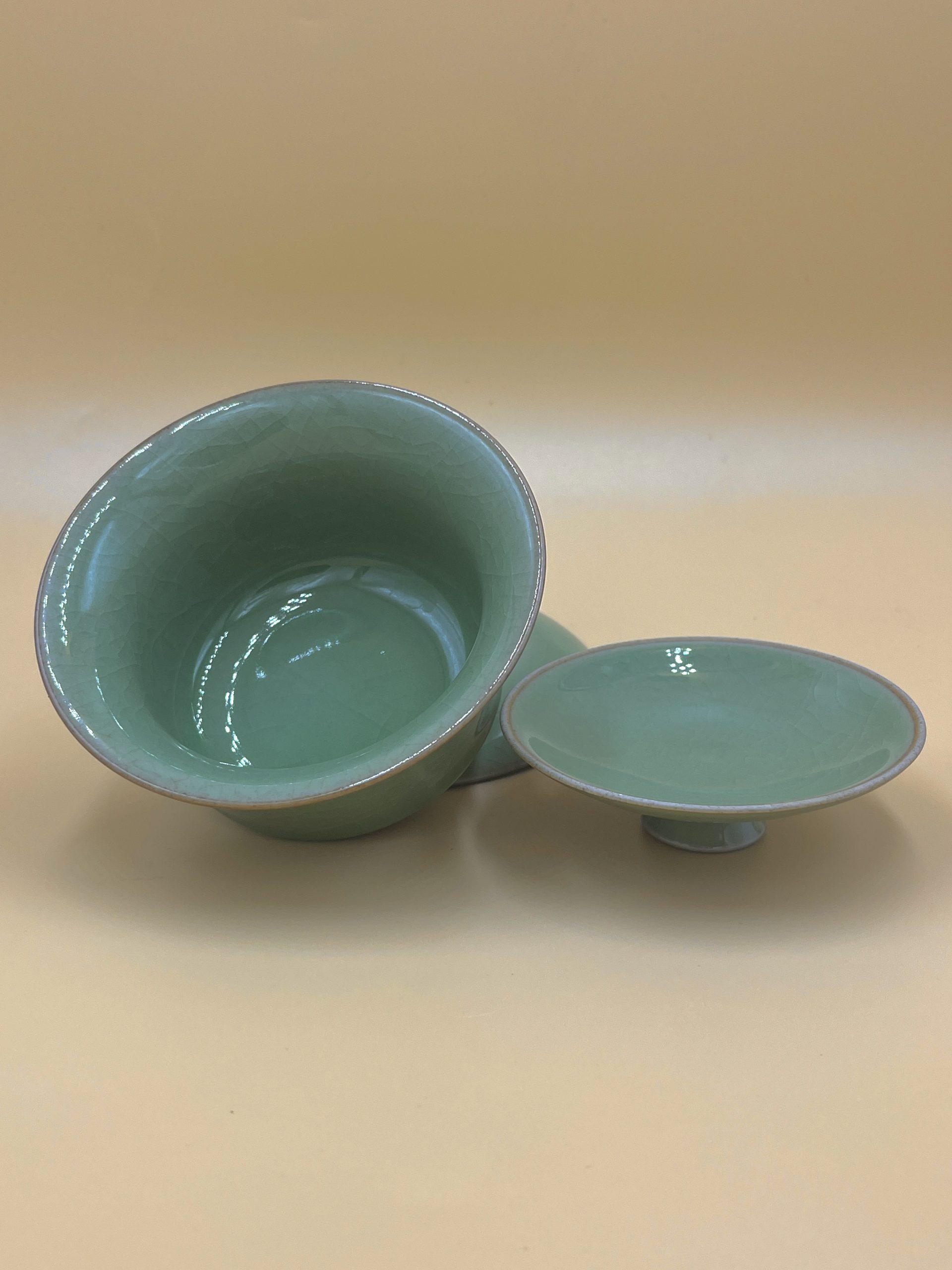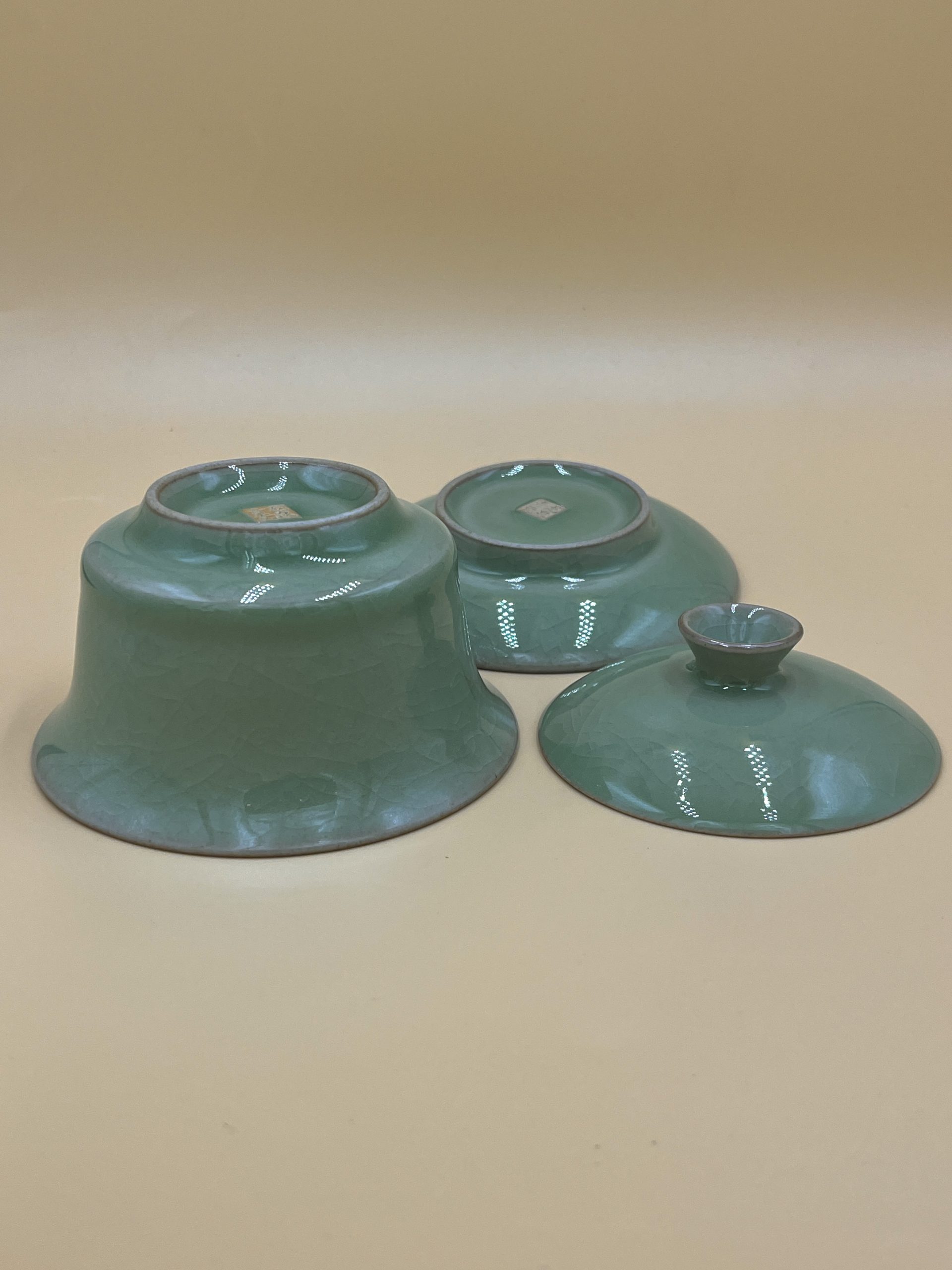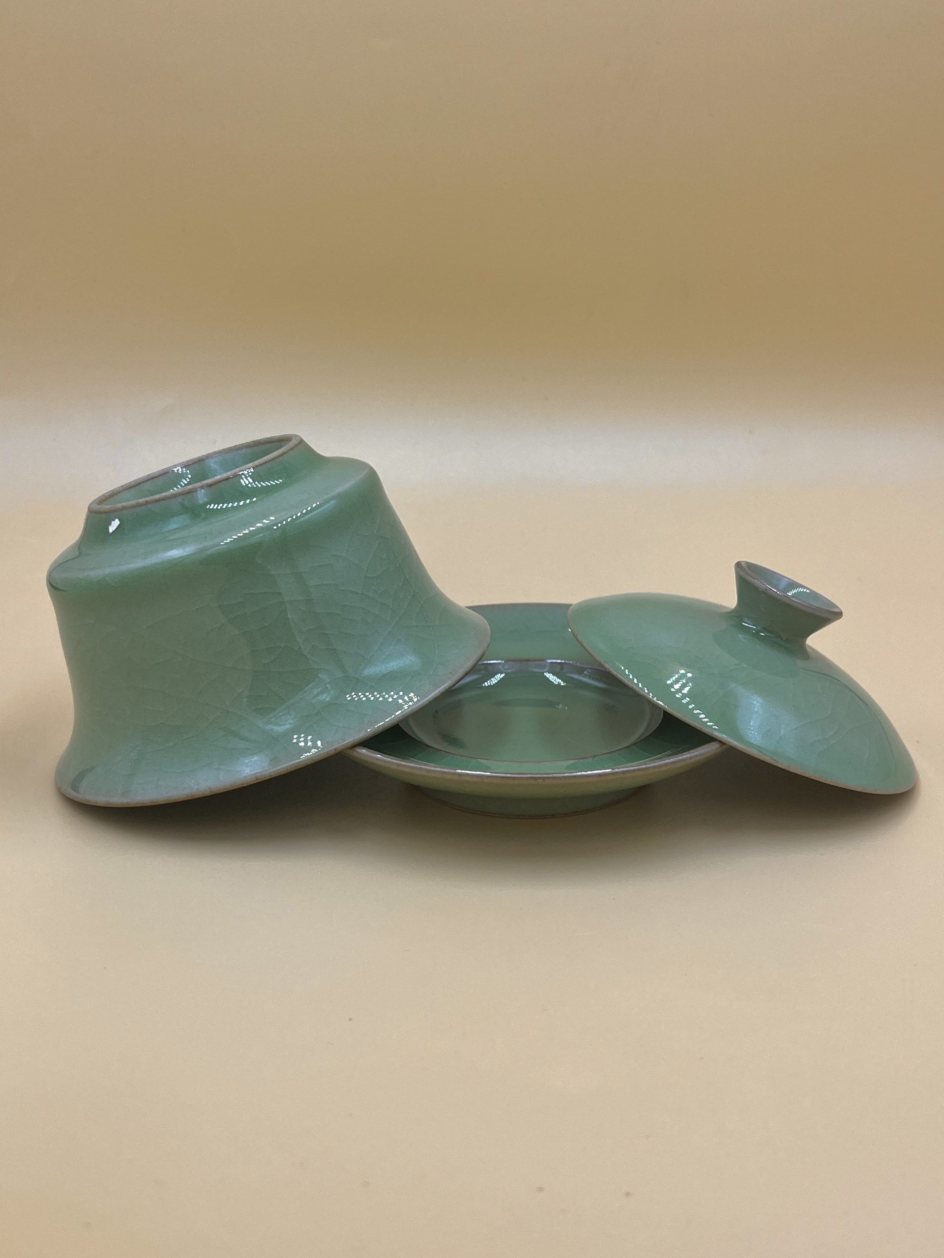 Классическая гайвань с блюдцем Императорской керамики Лунцуань.  Изумрудный оттенок, градиент цвета и кракле на глазури.