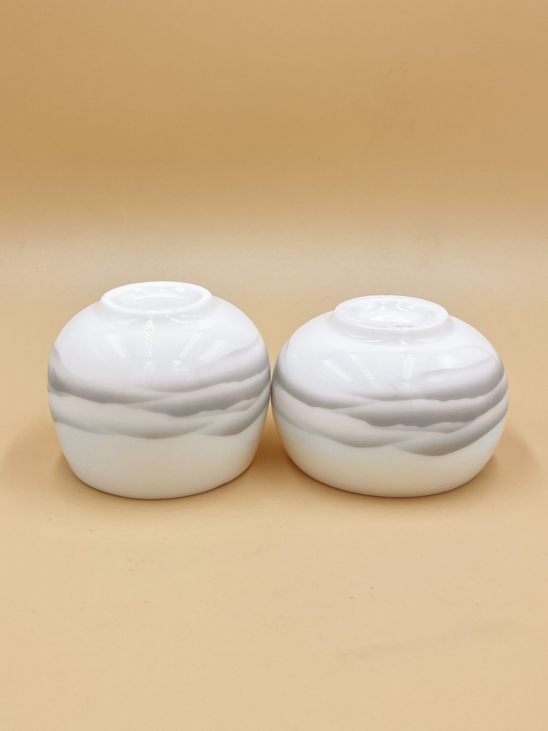 Толстостенные пиалы из белого гладкого глянцевого фарфора. Пропускают свет, фарфор отличного качества, средней звонкости.