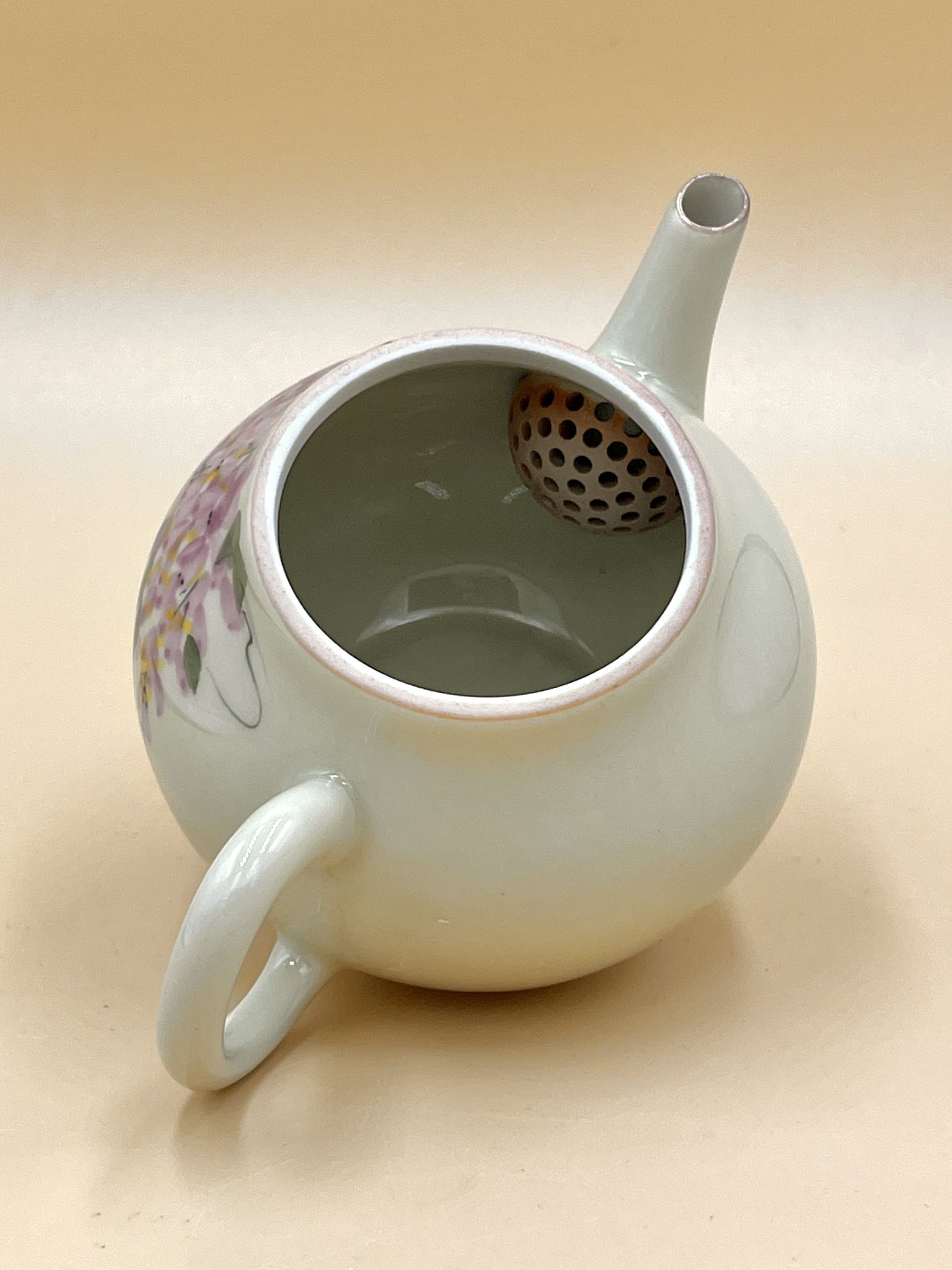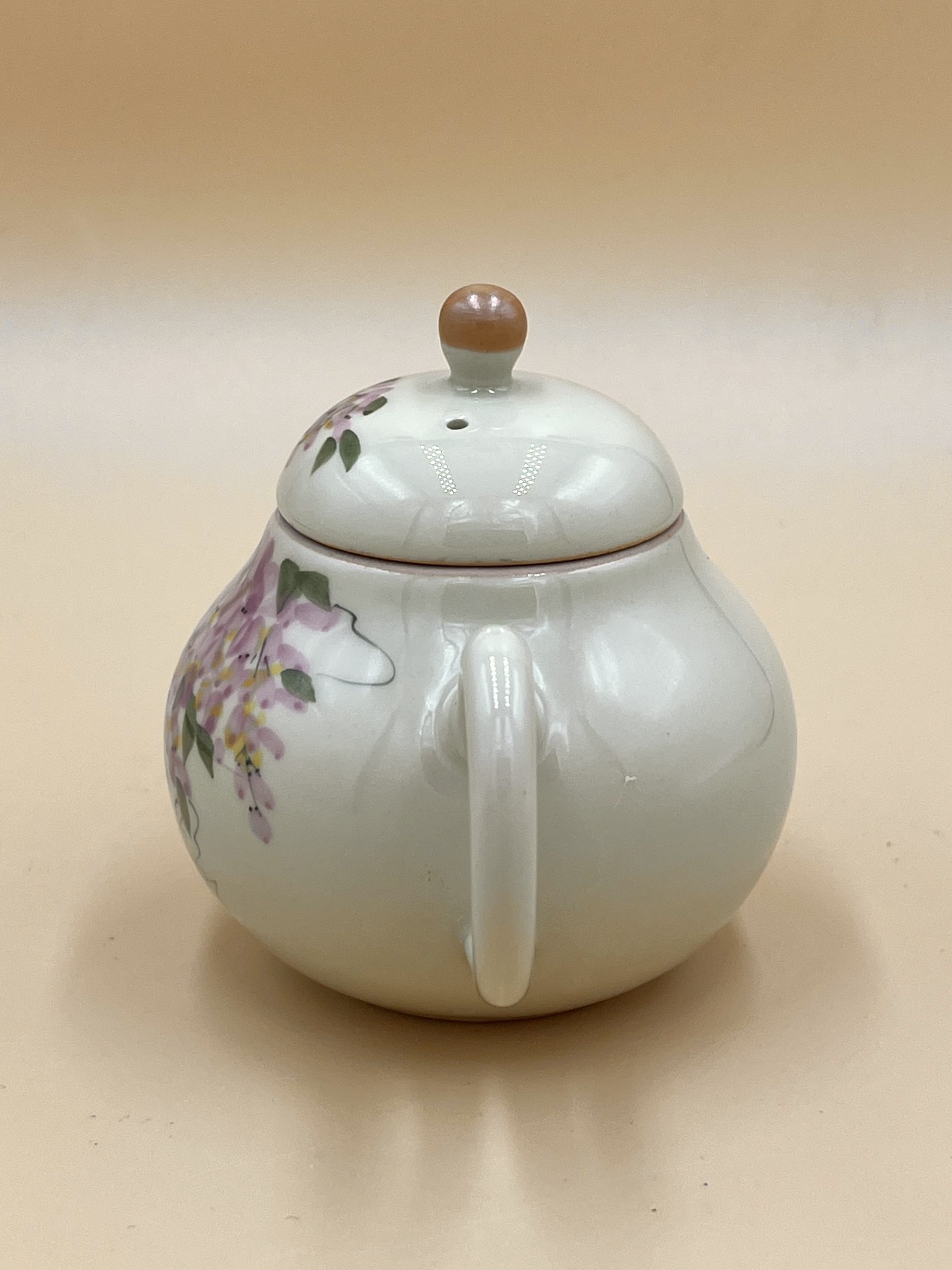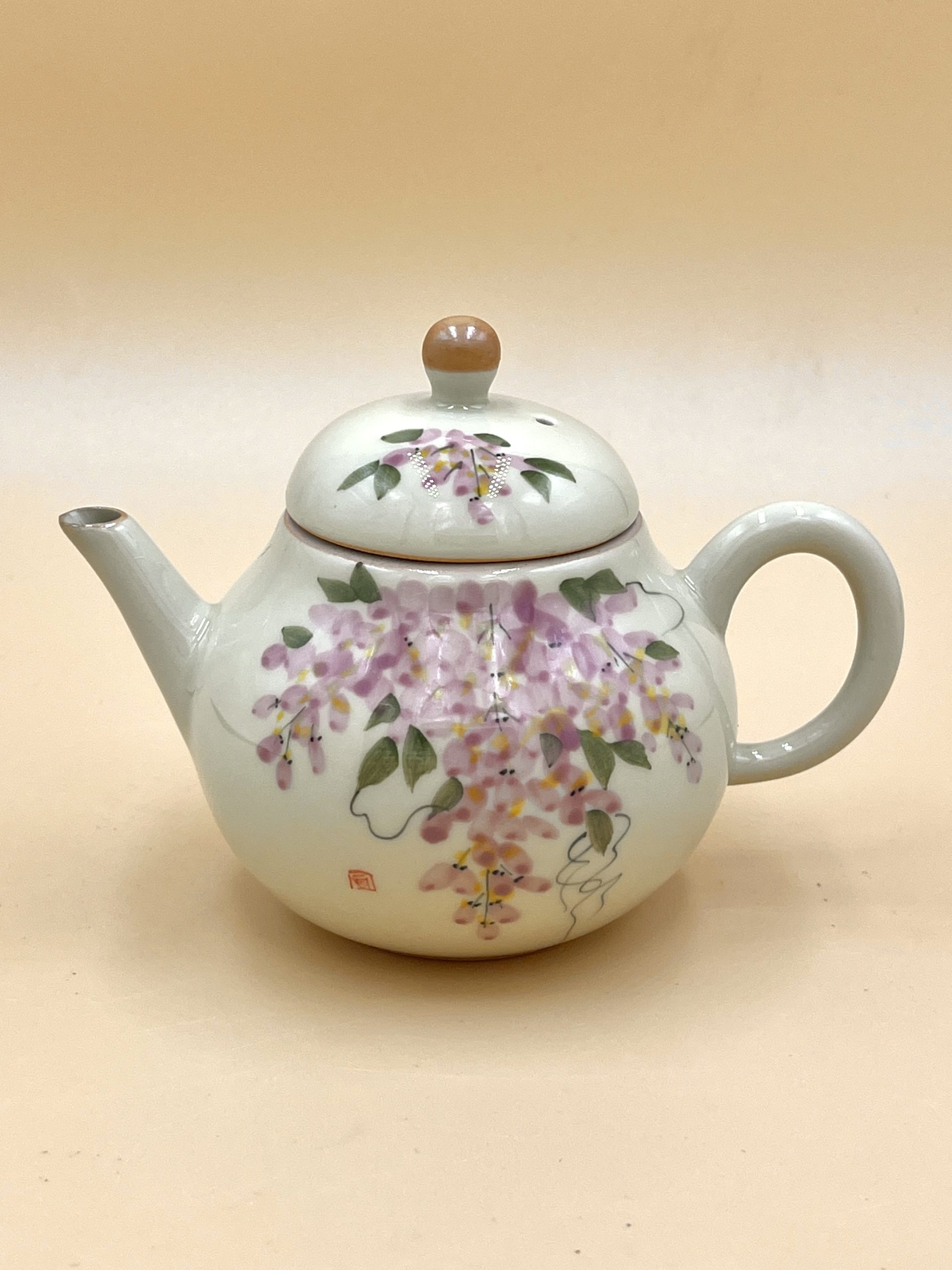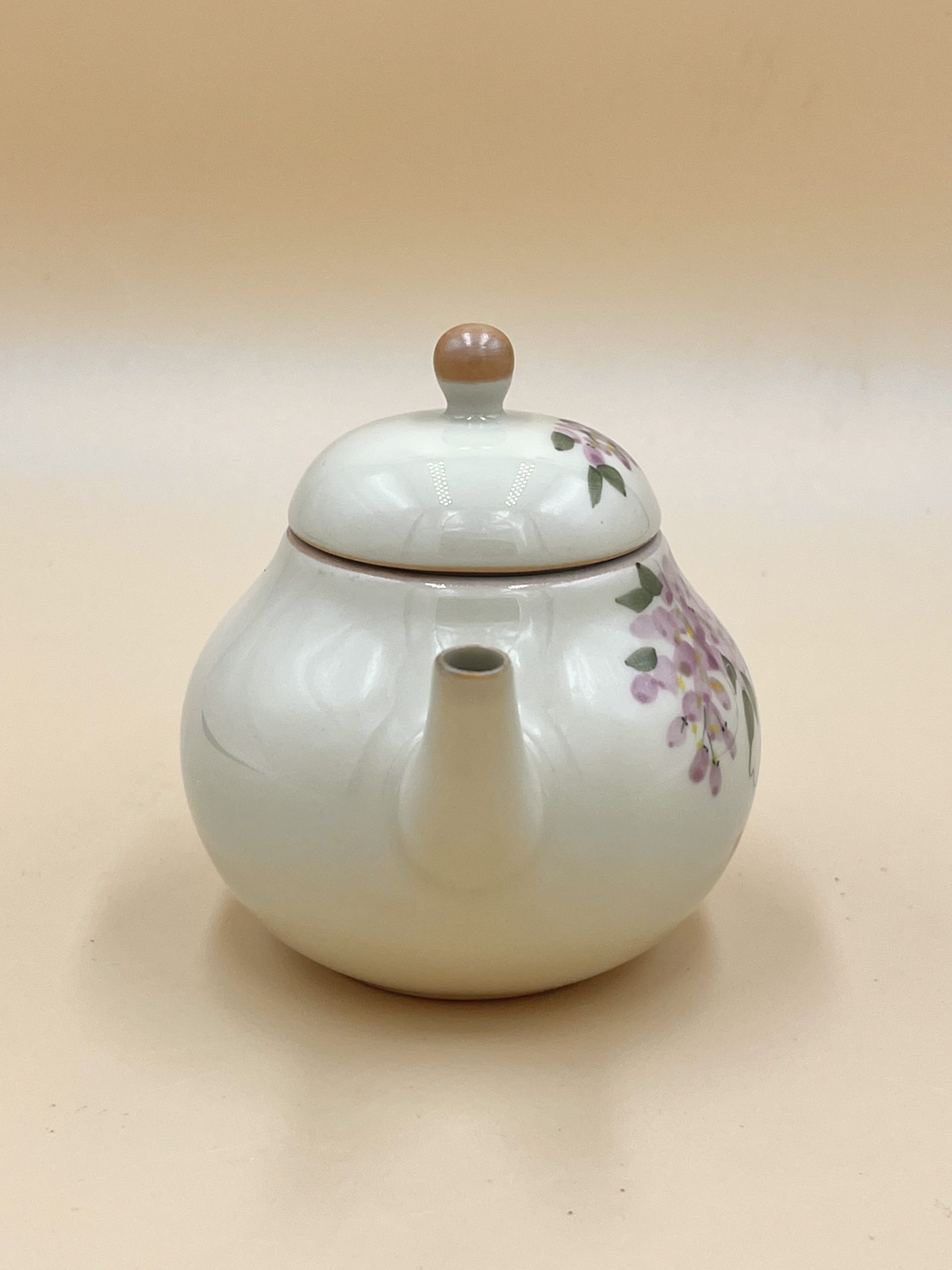Классический керамический чайник из Дэхуа формы Груша с глянцевой глазурью внутри и снаружи. Украшен ручной подглазурной росписью цветами Глицинии.