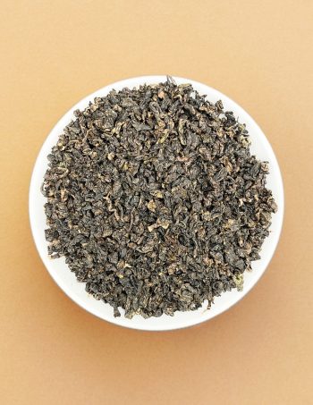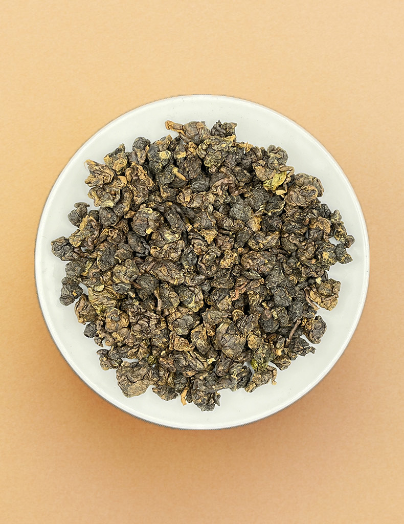 ▸ Улун среднего прогрева. Листья скручены в тугие небольшие сферы светло-коричневого оттенка.