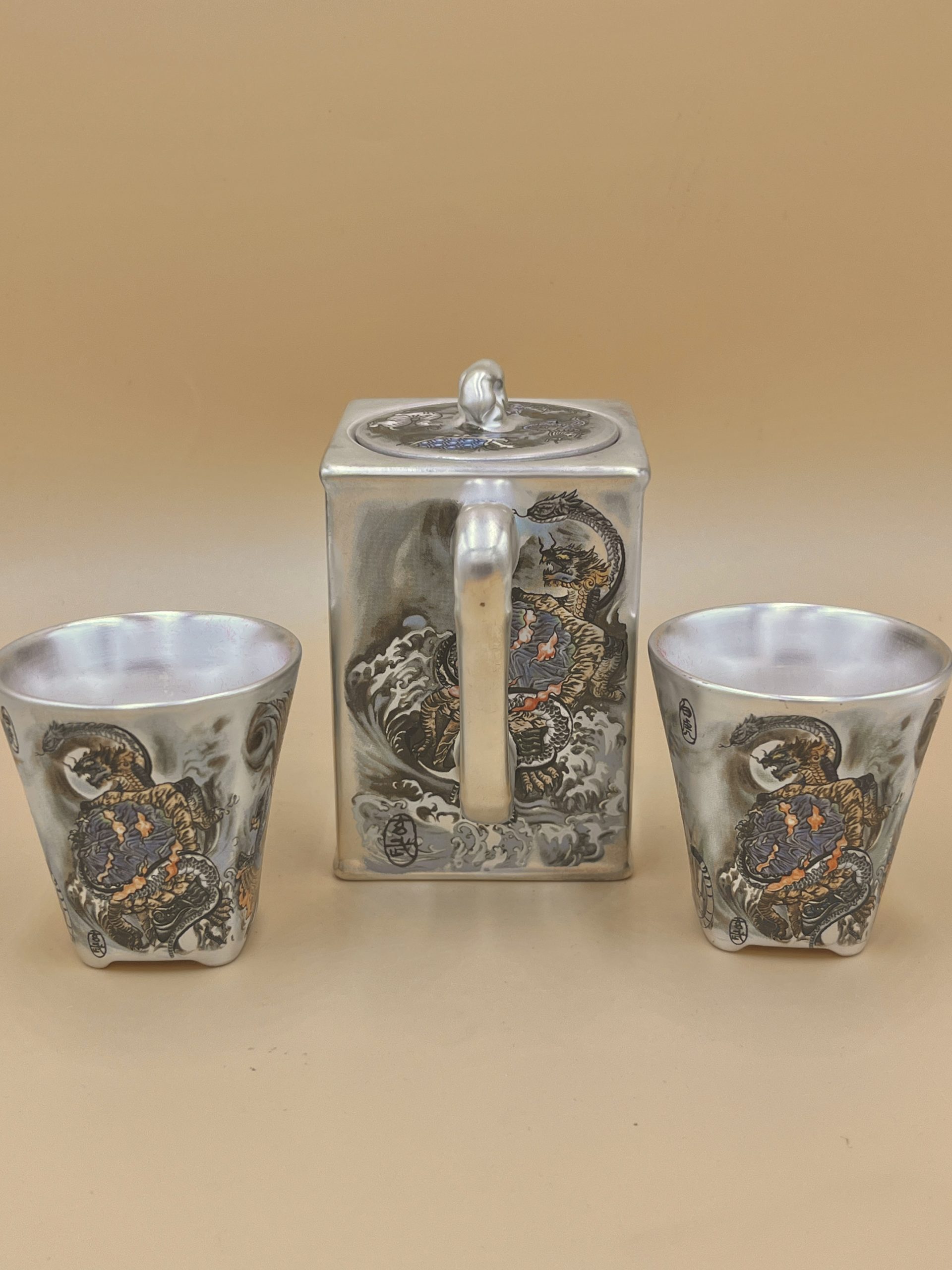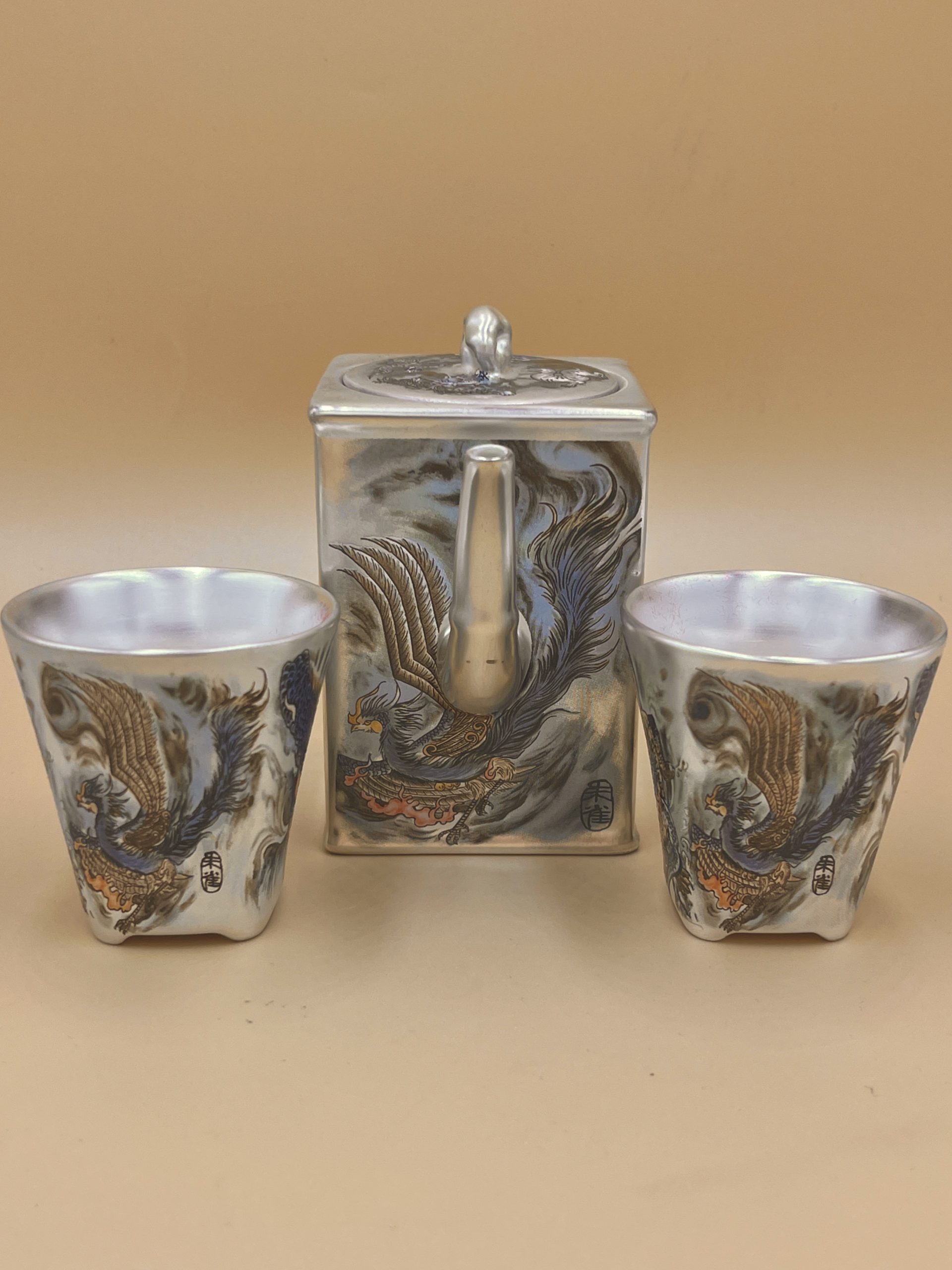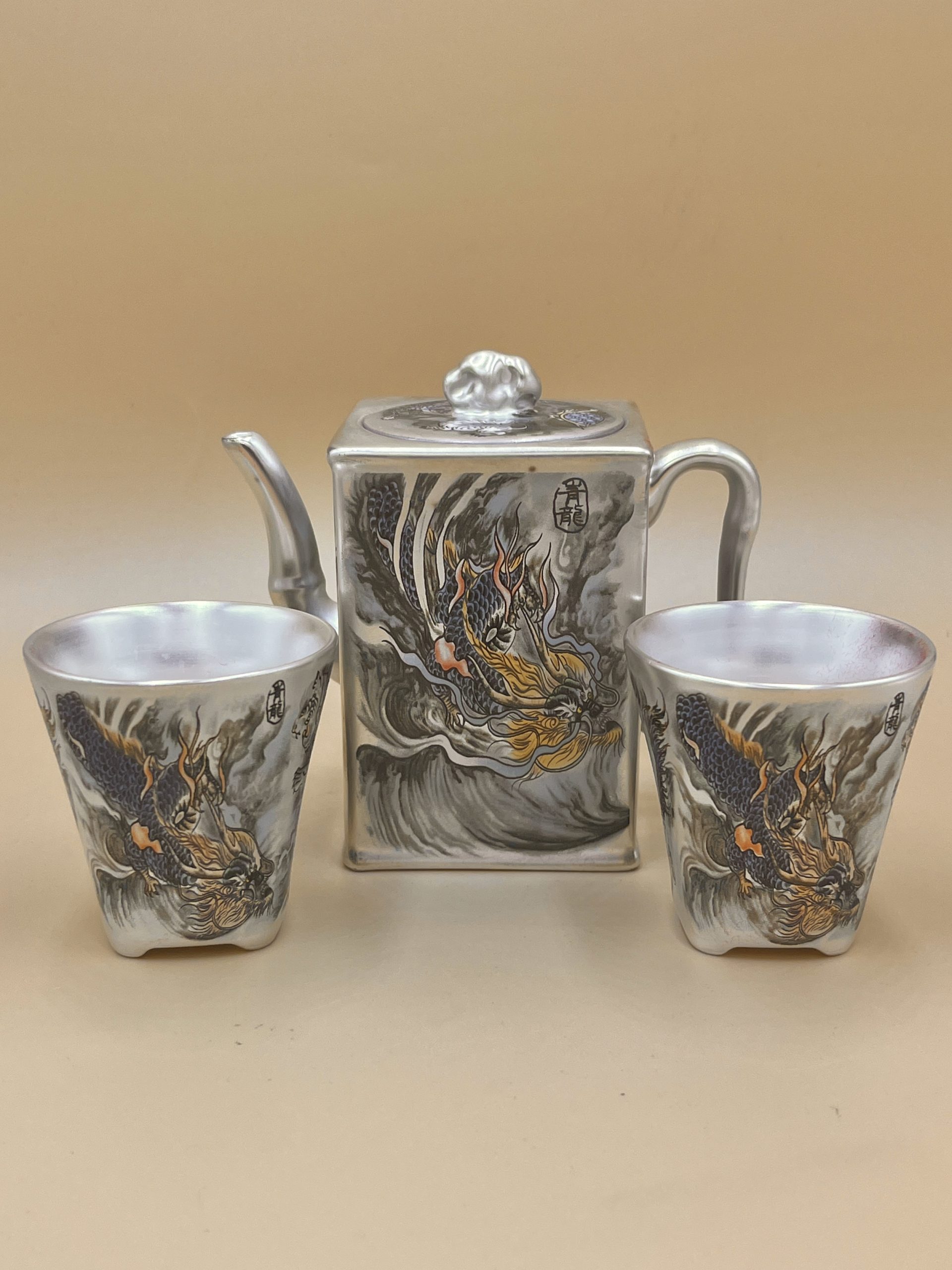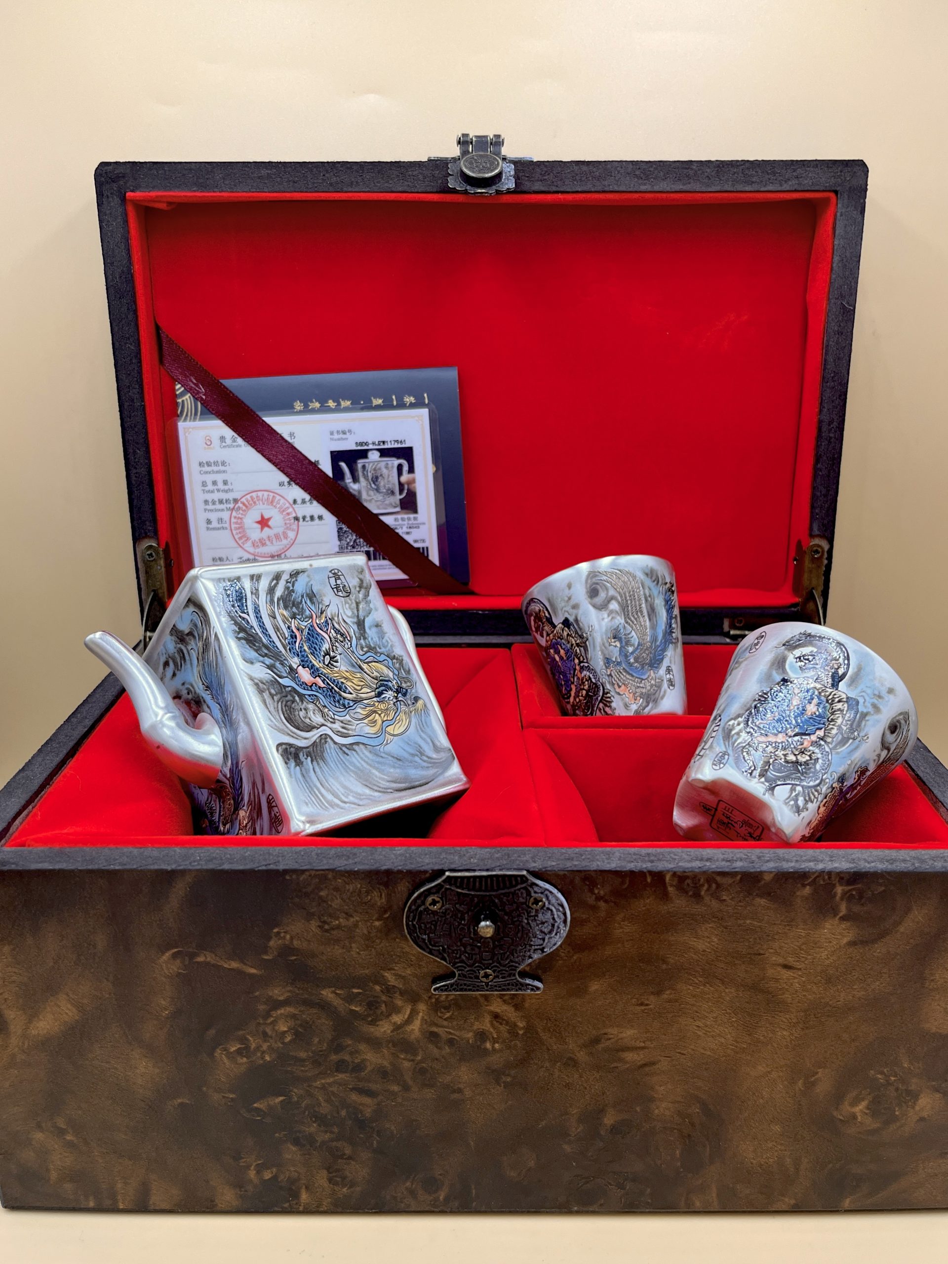 Величественный подарочный набор из посеребрённого фарфора с сертификатом подтверждения пробы. 2 пиалы по 50 мл., чайник 200 мл и подарочная бархатная коробка.