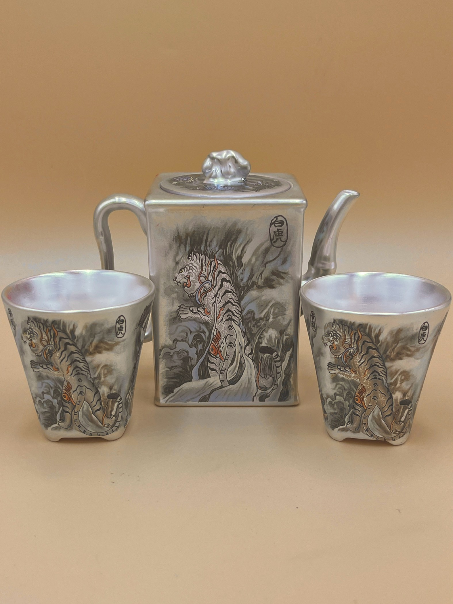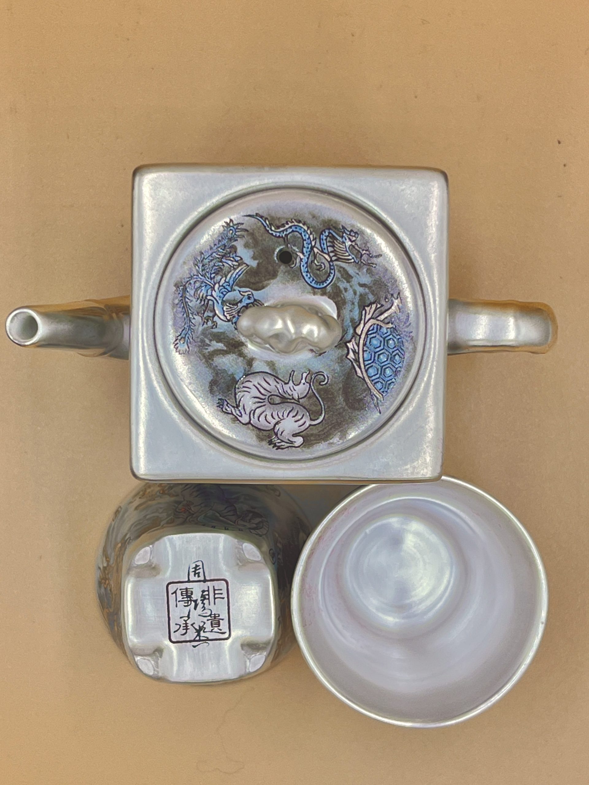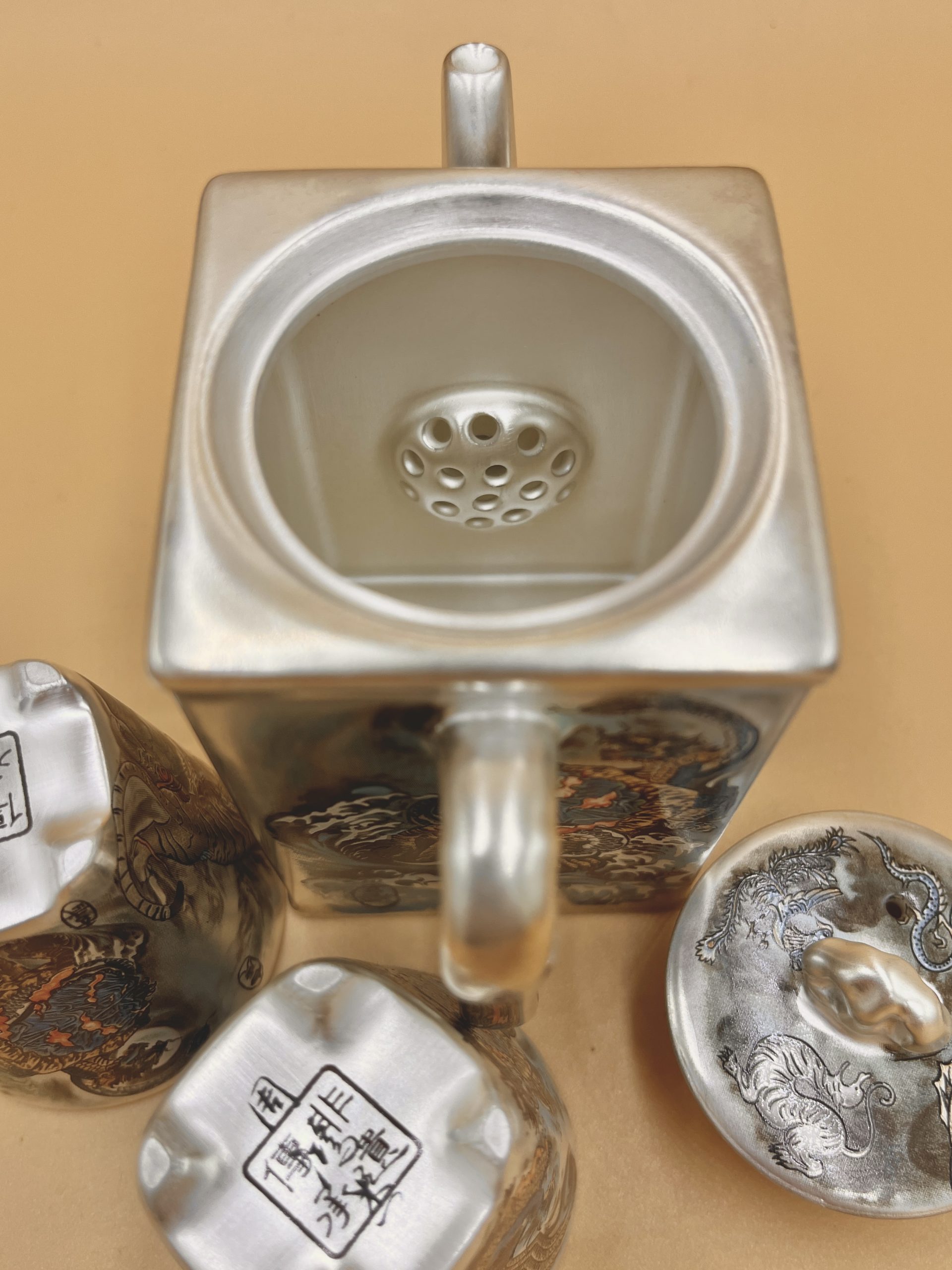 Серебро подчеркивает блеск настоя, а также создает новый тактильный опыт при чаепитие. Сочетание фарфора и серебра создаёт ощущение весомости и элегантности. Роскошный блеск, гладкость, классическая китайская символика.