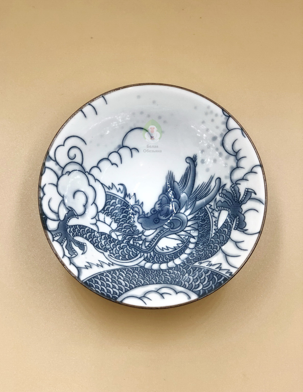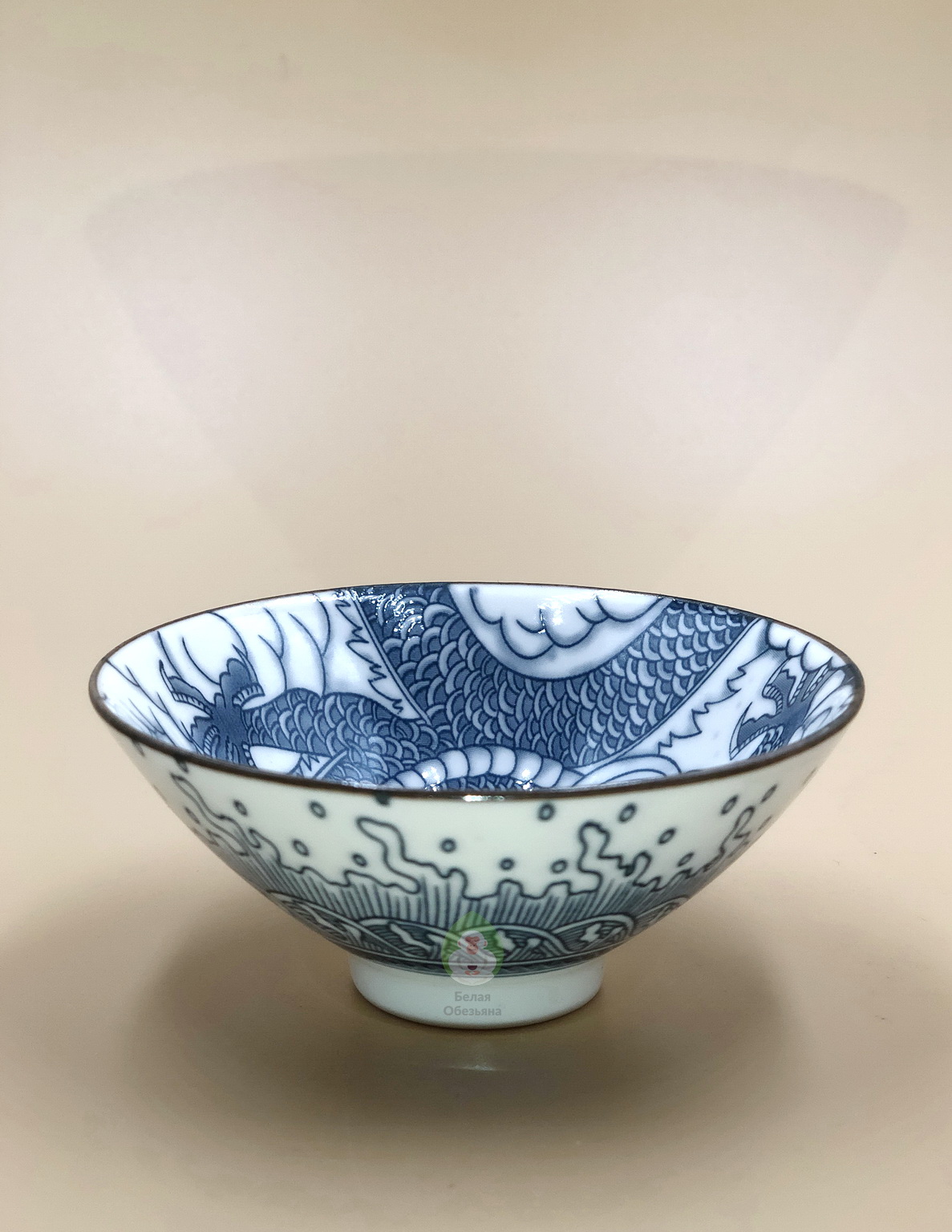 Классическая фарфоровая пиала средней толщины. Синяя печать изображения дракона в облаках внутри пиалы и узоры моря снаружи пиалы. Синий дракон считается символом высшей власти и статуса, олицетворяет мужскую Янскую энергию.