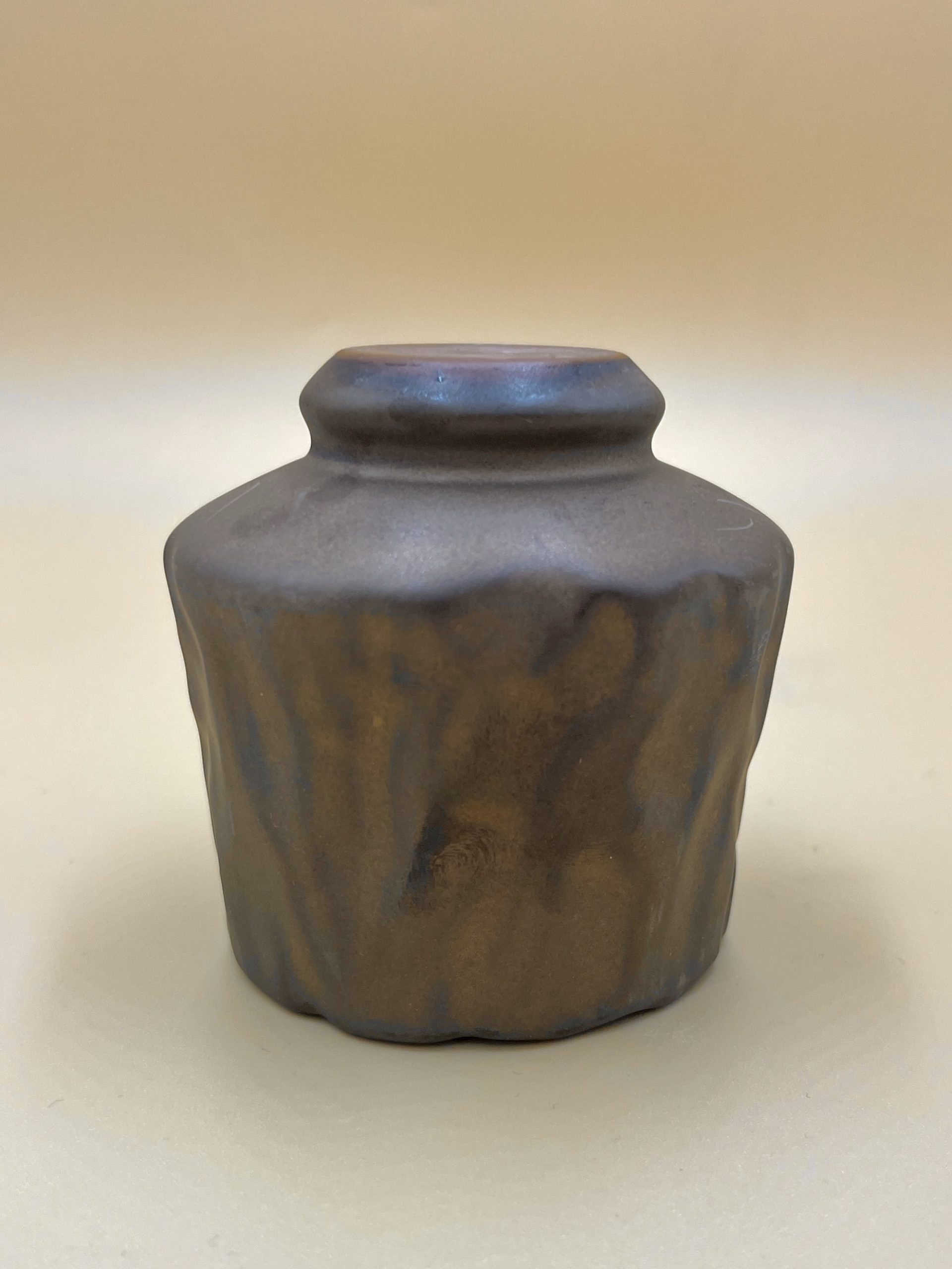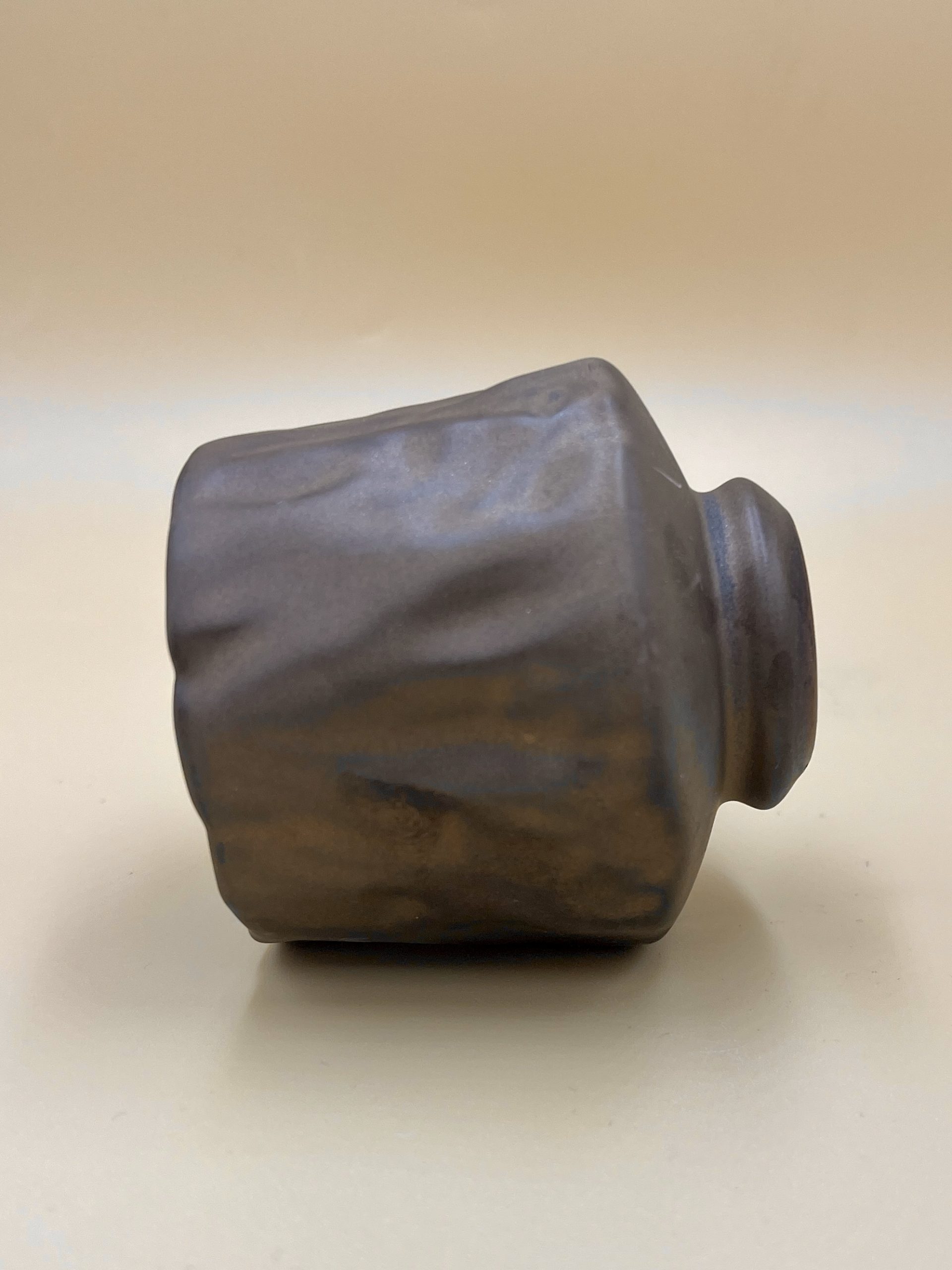 Бархатная матовая бронзовая толстостенная глазурь, красиво переливается на свету в бронзово-золотистый оттенок, мелкодисперсное матовое тёплое свечение.