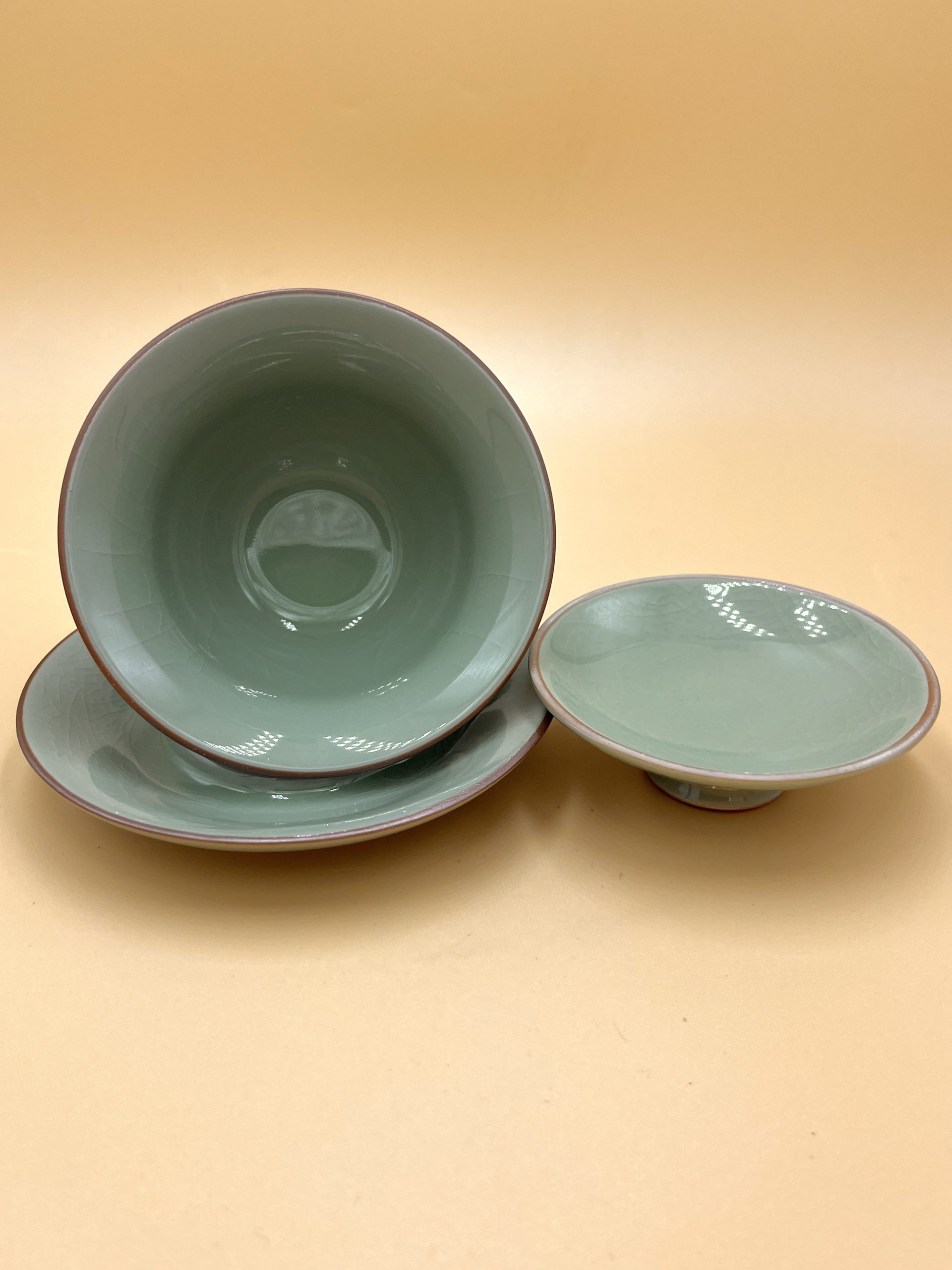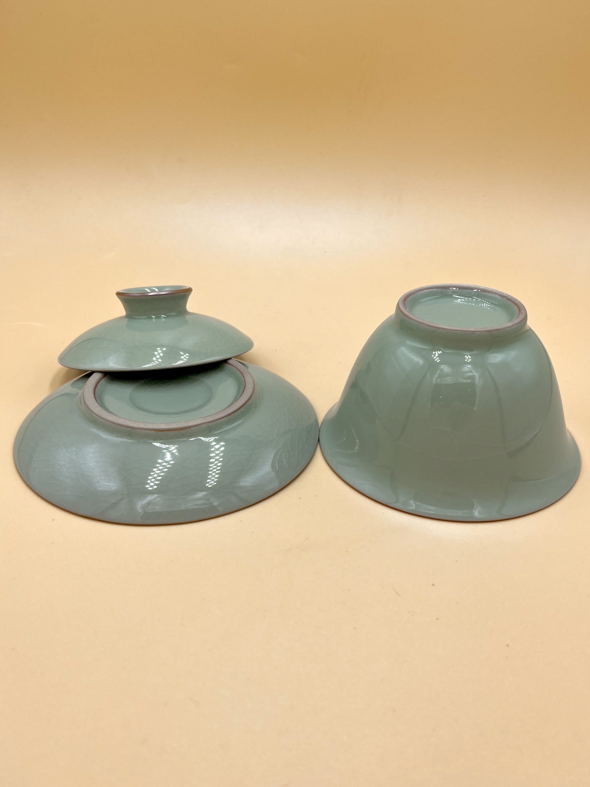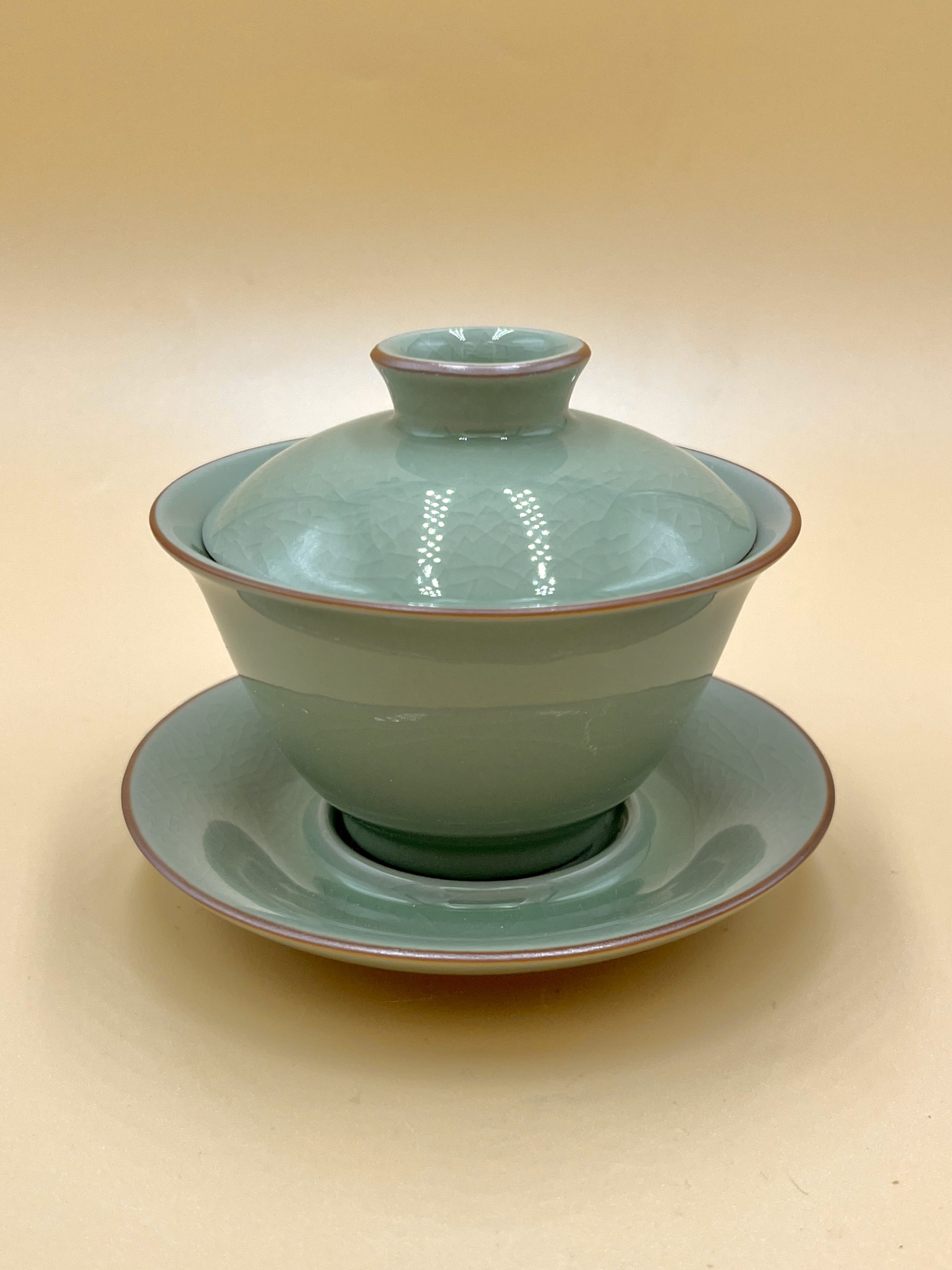 Классическая гайвань с блюдцем Императорской керамики Лунцуань. Зелено-серый припылённый классический оттенок, блеск и кракле на глазури.