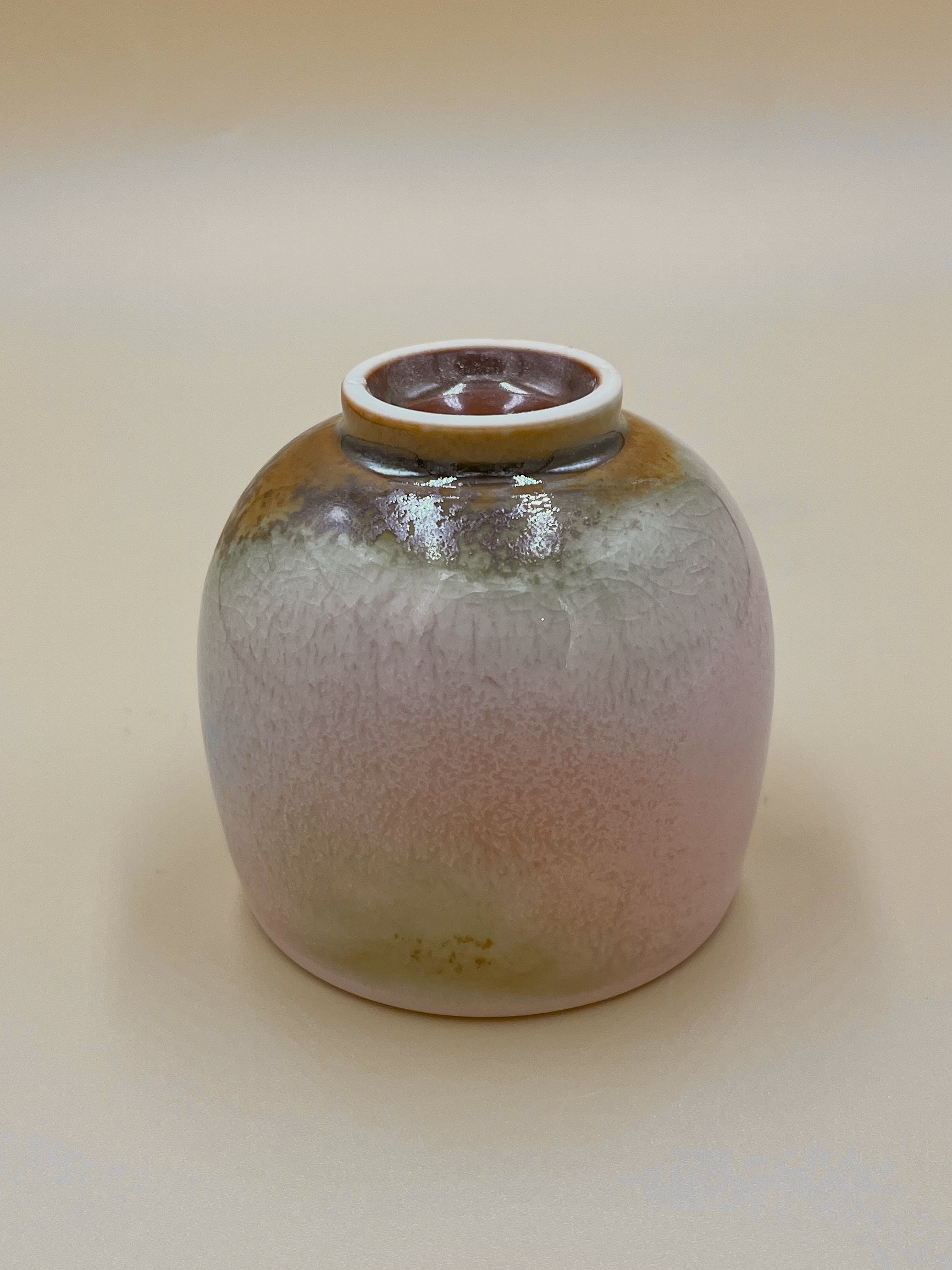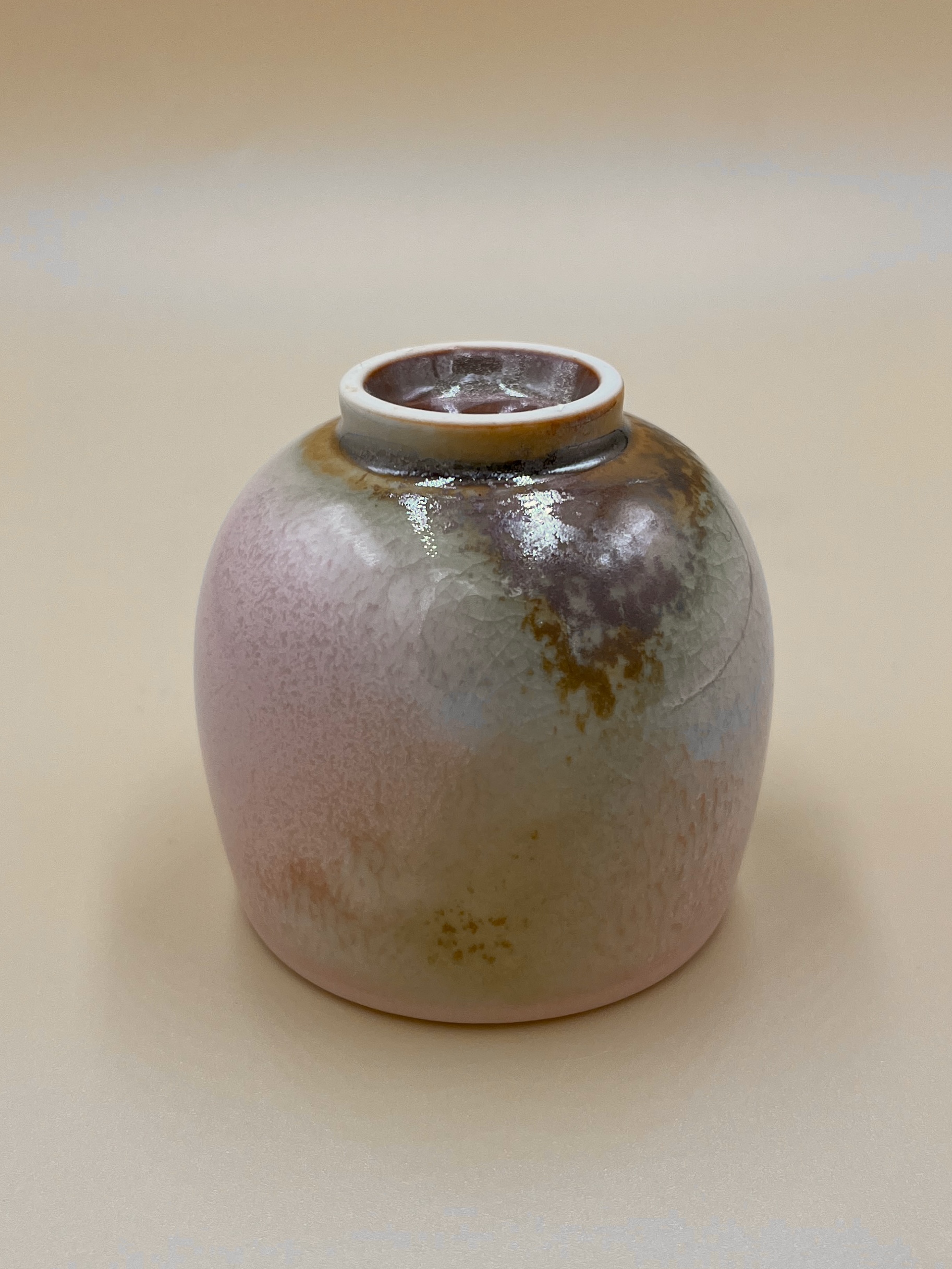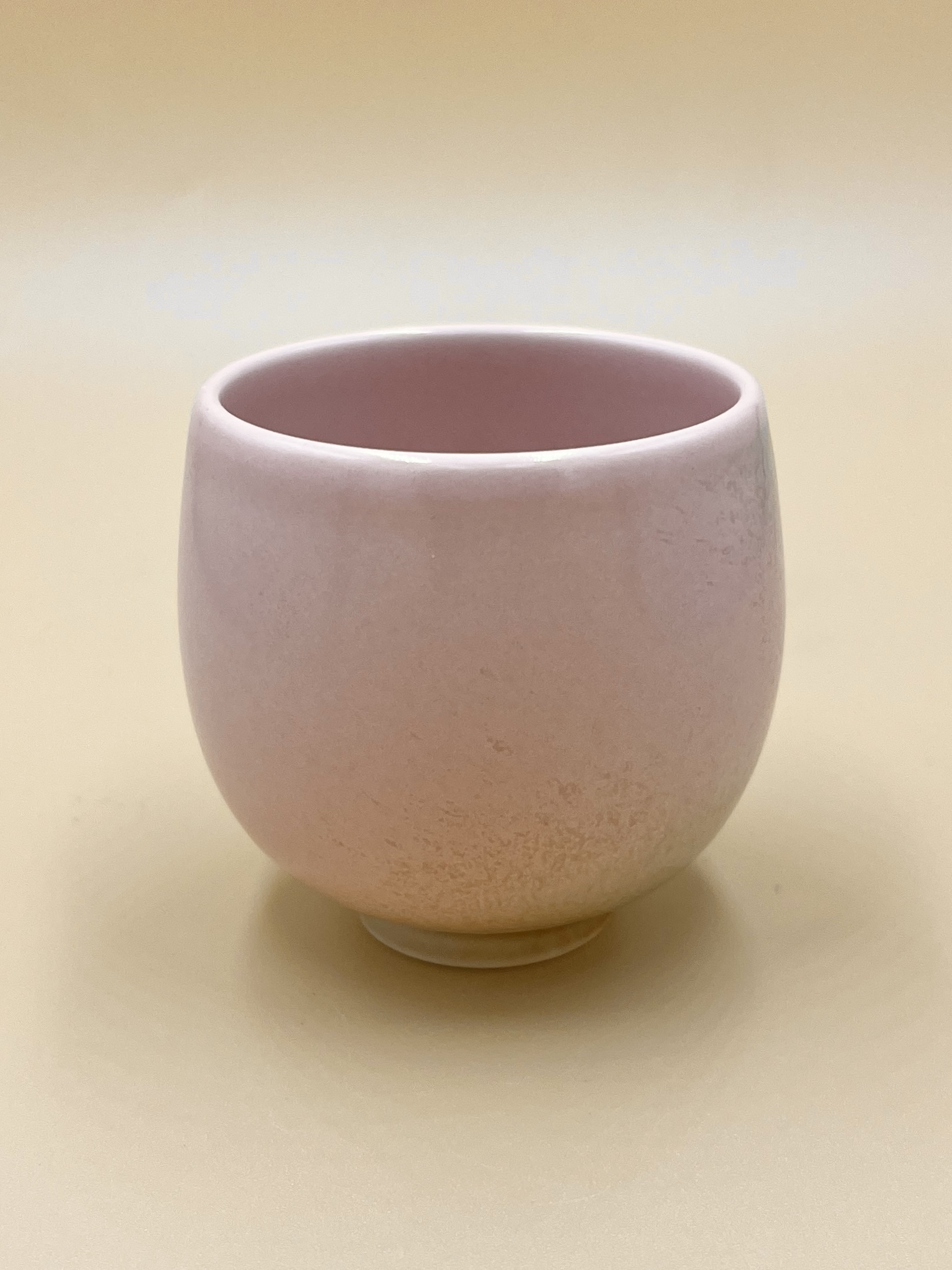 Глазурированная пиала керамики Цзиндечжень, тяжеловесная и устойчивая. Глазурь от пиалы к пиале имеет разный рисунок и оттенок. Нежный розовый цвет с салатово-коричневыми пятнами и мелким “ледяным” рисунком кракле.