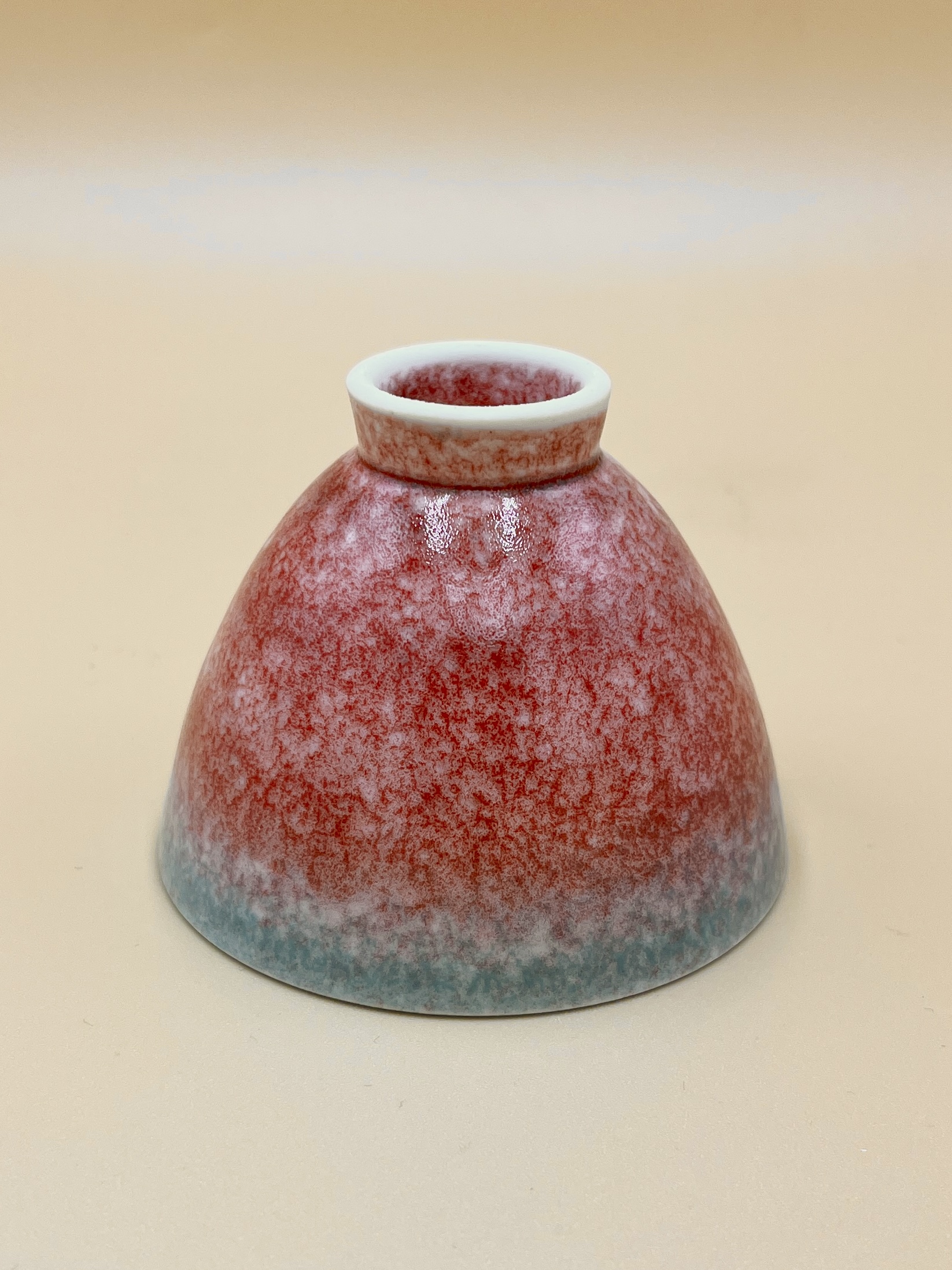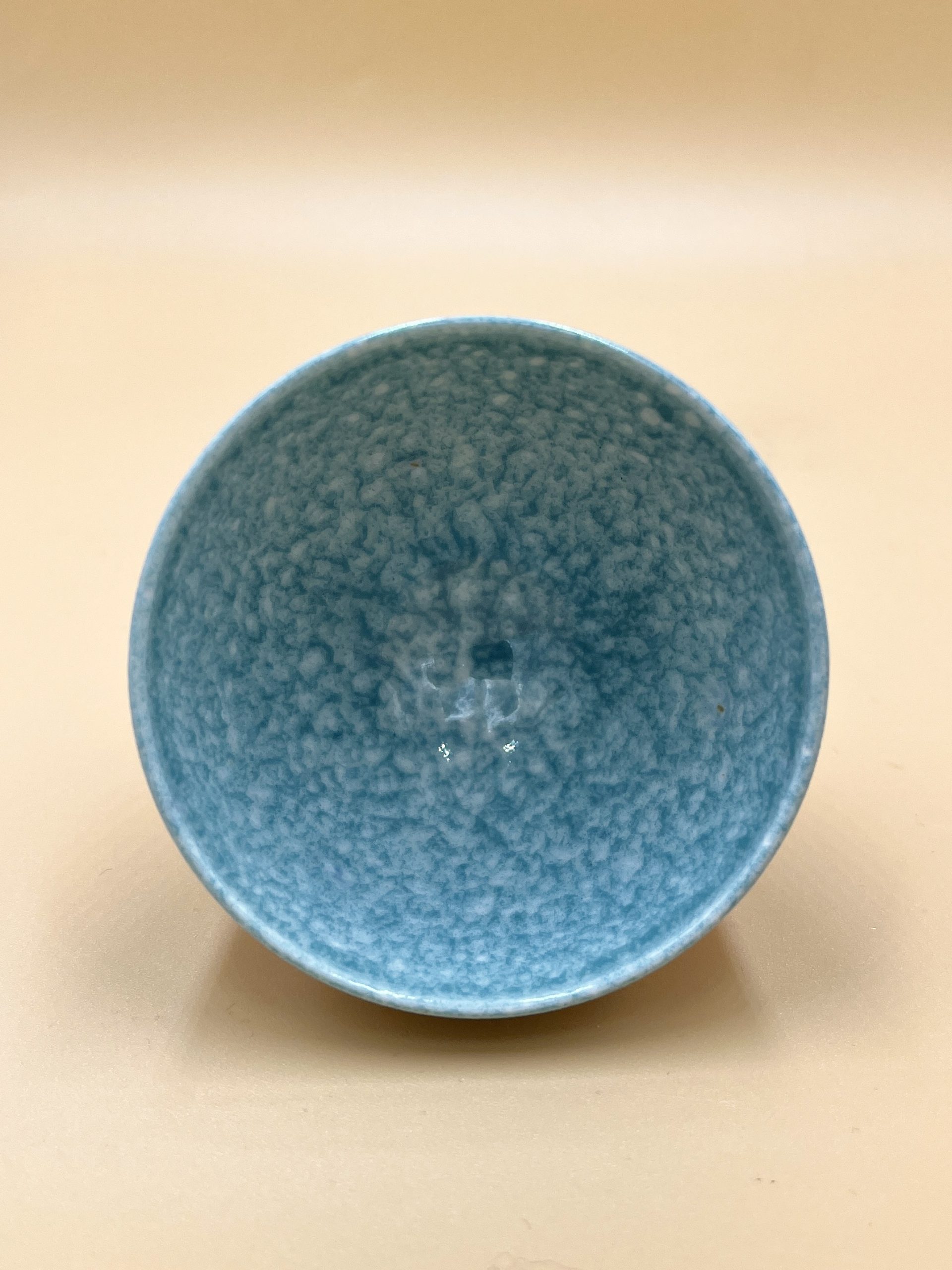 Великолепная пиала с прекрасным соединением цветов: небесно-голубое пушистое небо глазури внутри пиалы и “сосудистая” вишнёвая глазурь Куриное Сердце снаружи.