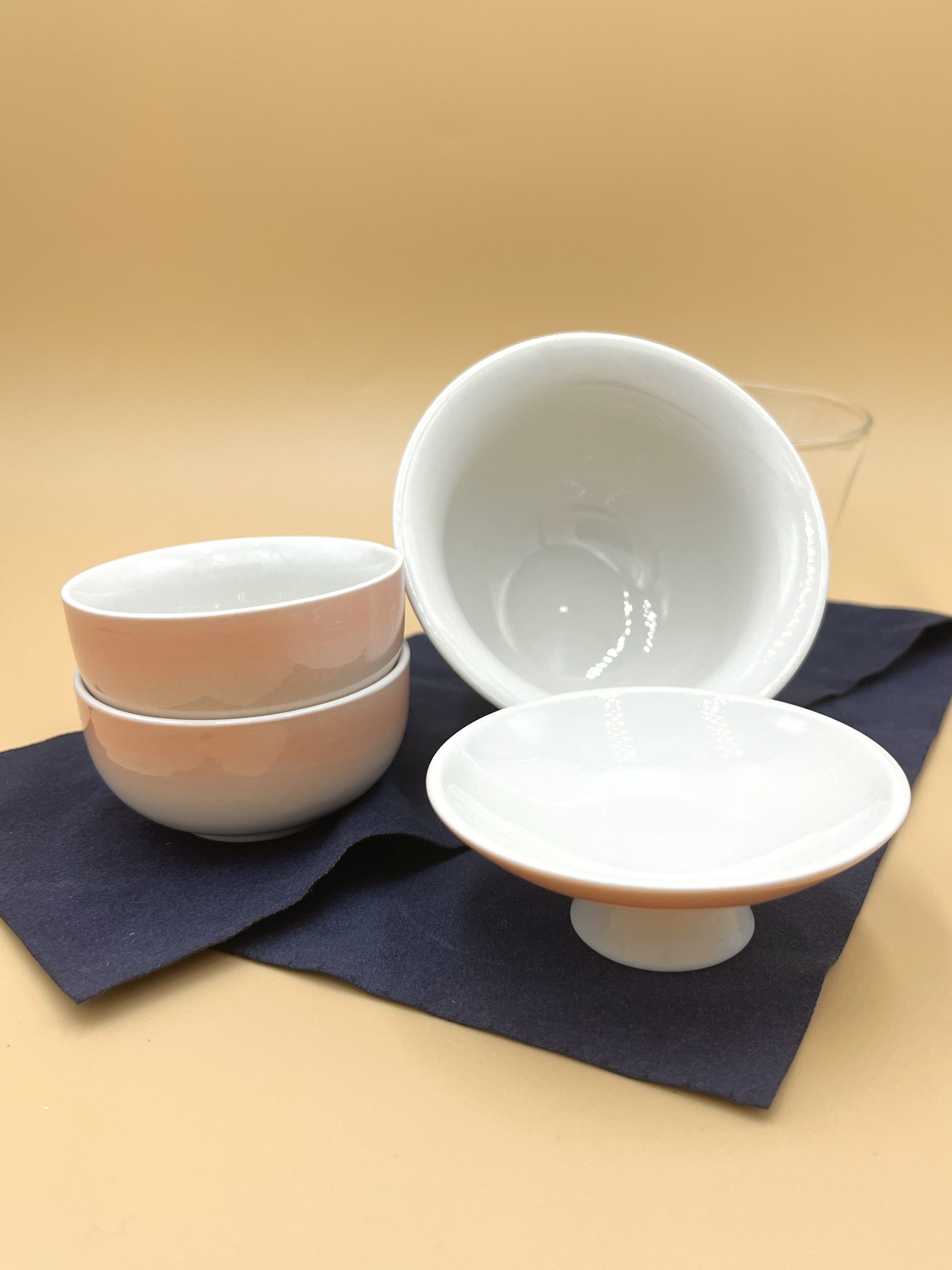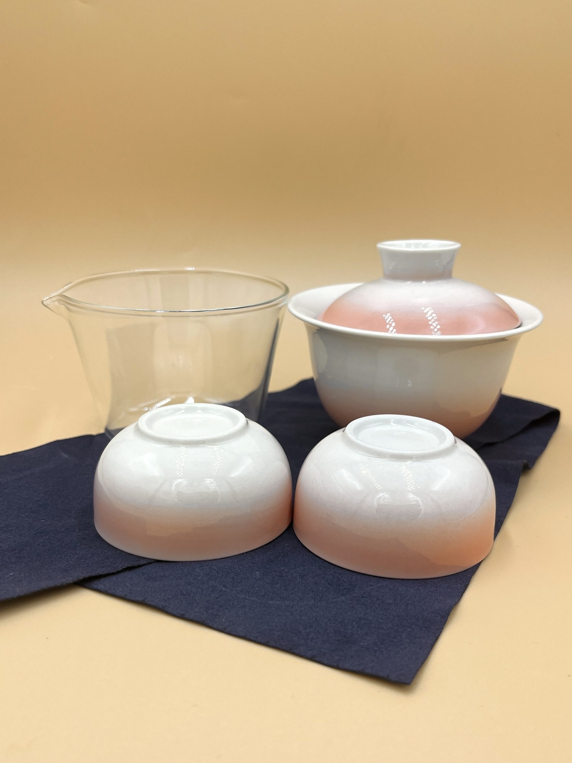 Милейший походный набор из глазурованного фарфора Дэхуа. Великолепное качество керамики и чайной сумки, нежный персикового-розовый градиент полу-гляцевой глазури.