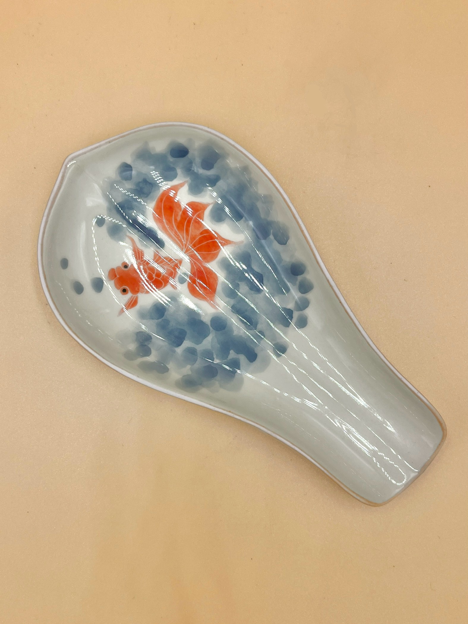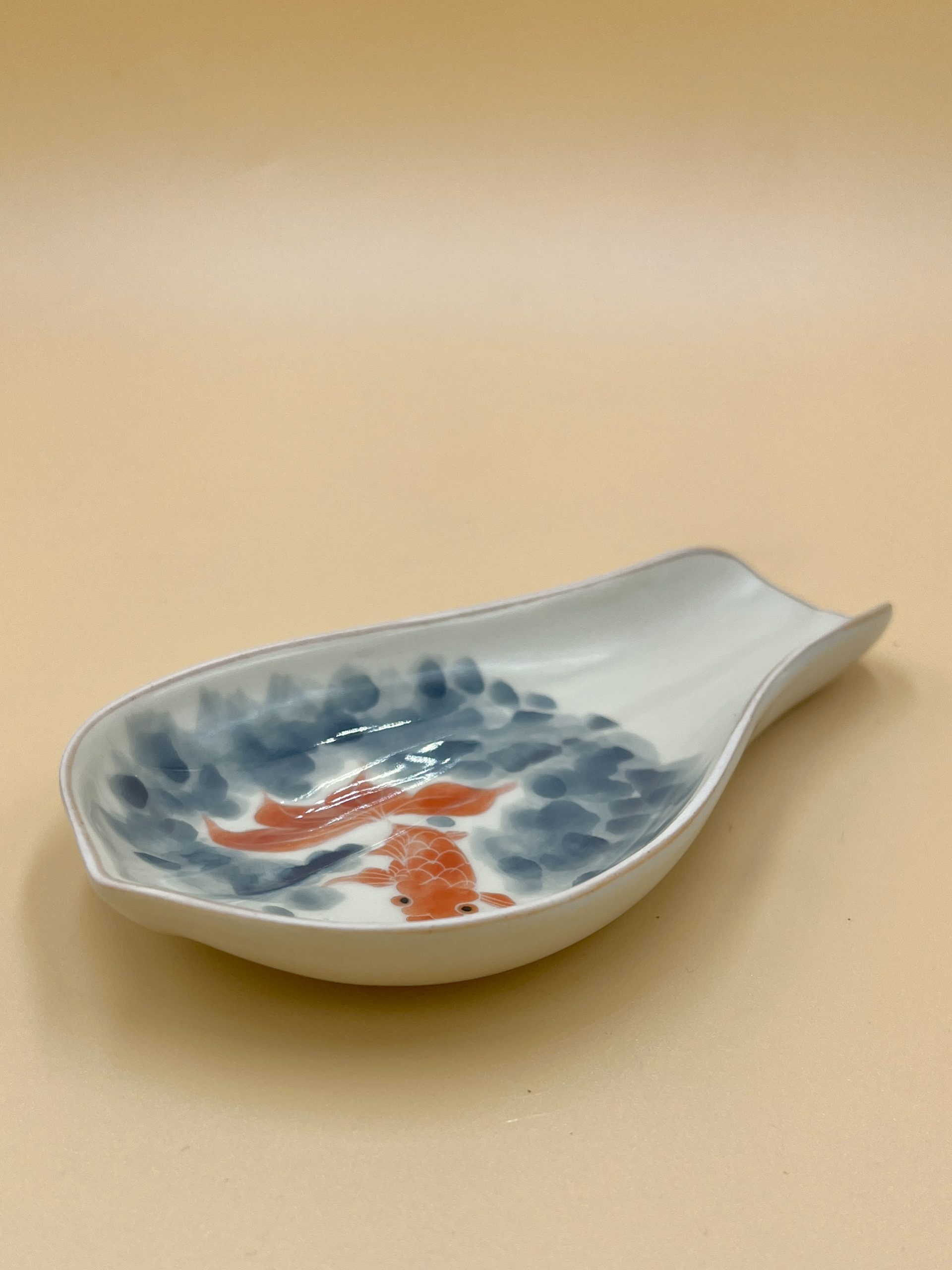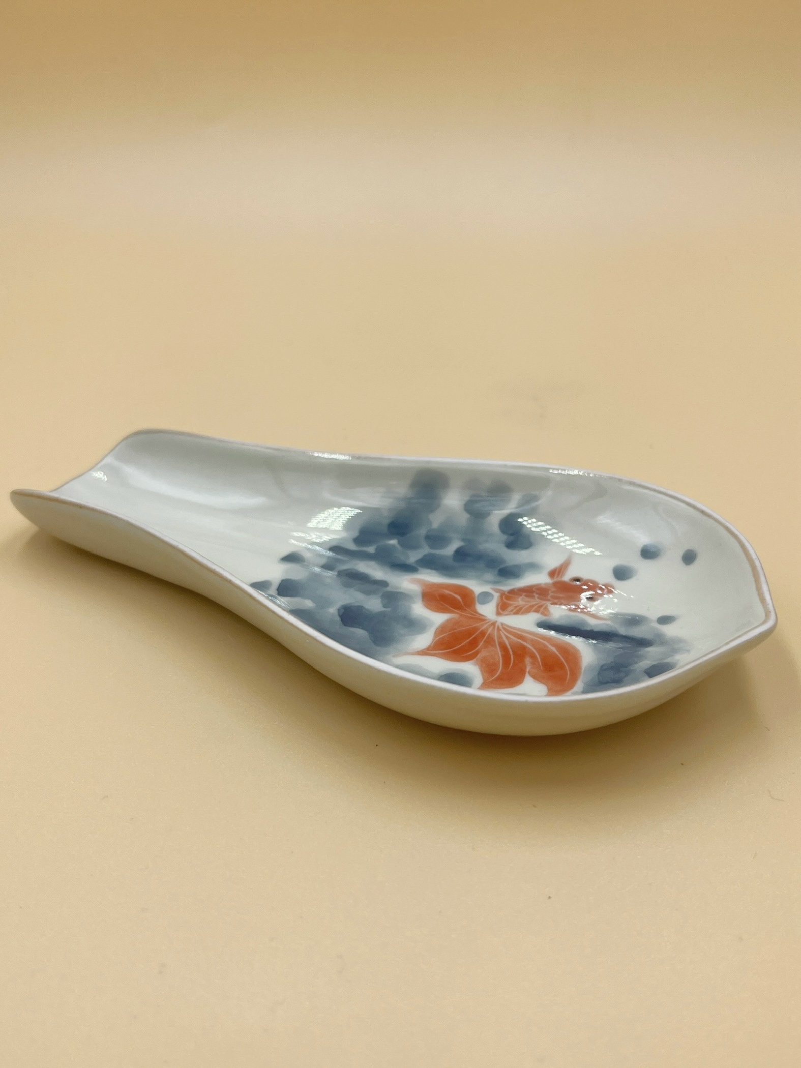 Плоское чахе из фарфора Дэхуа с синим и красным рисунком карпа. Ручная роспись.
