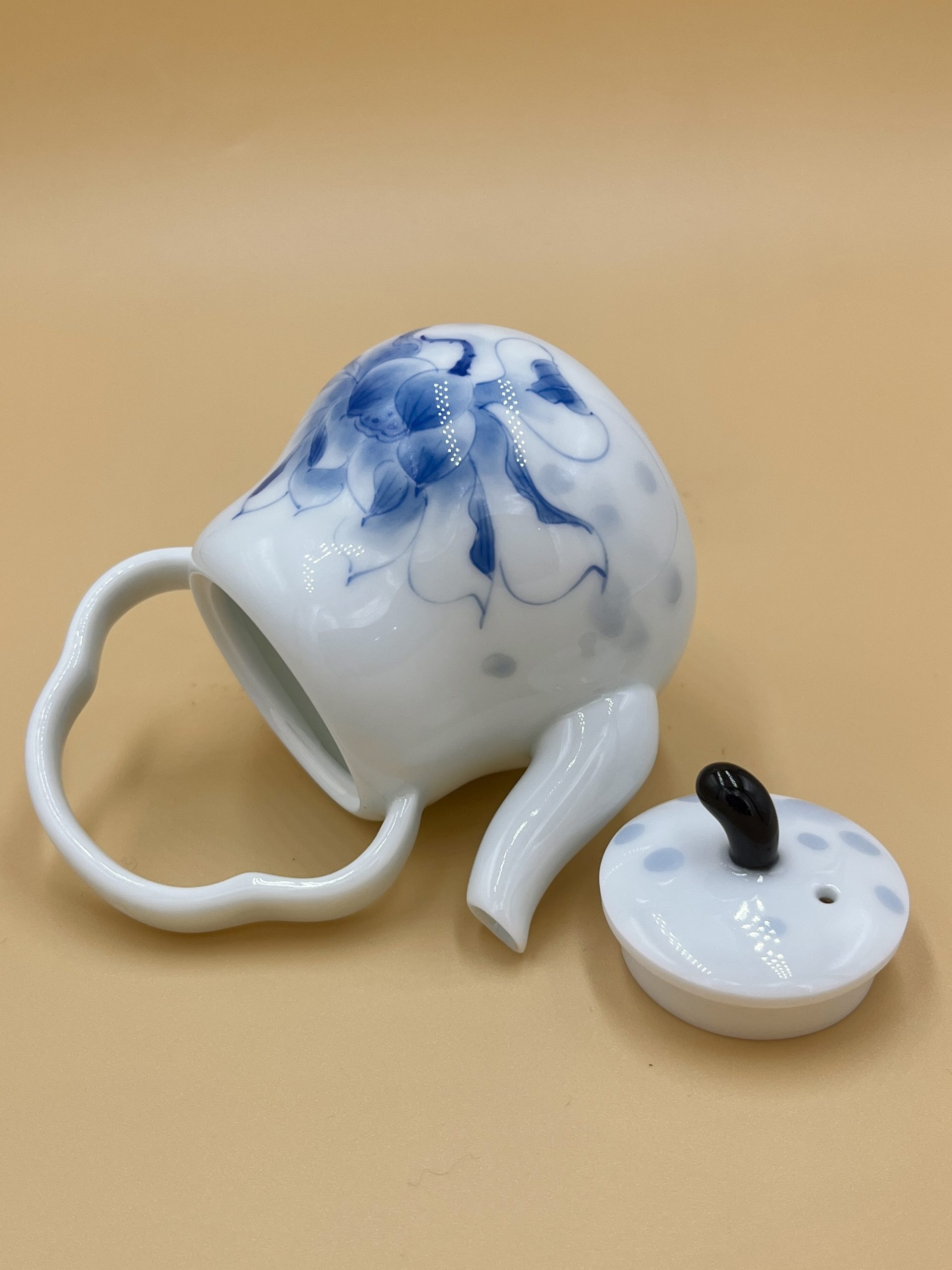 Невероятно эстетичный воздушный чайник с подглазурной ручной росписью кобальтом цветка Лотоса, символом чистоты и совершенства. Изящная грушевидная форма, элегантные изгибы.
