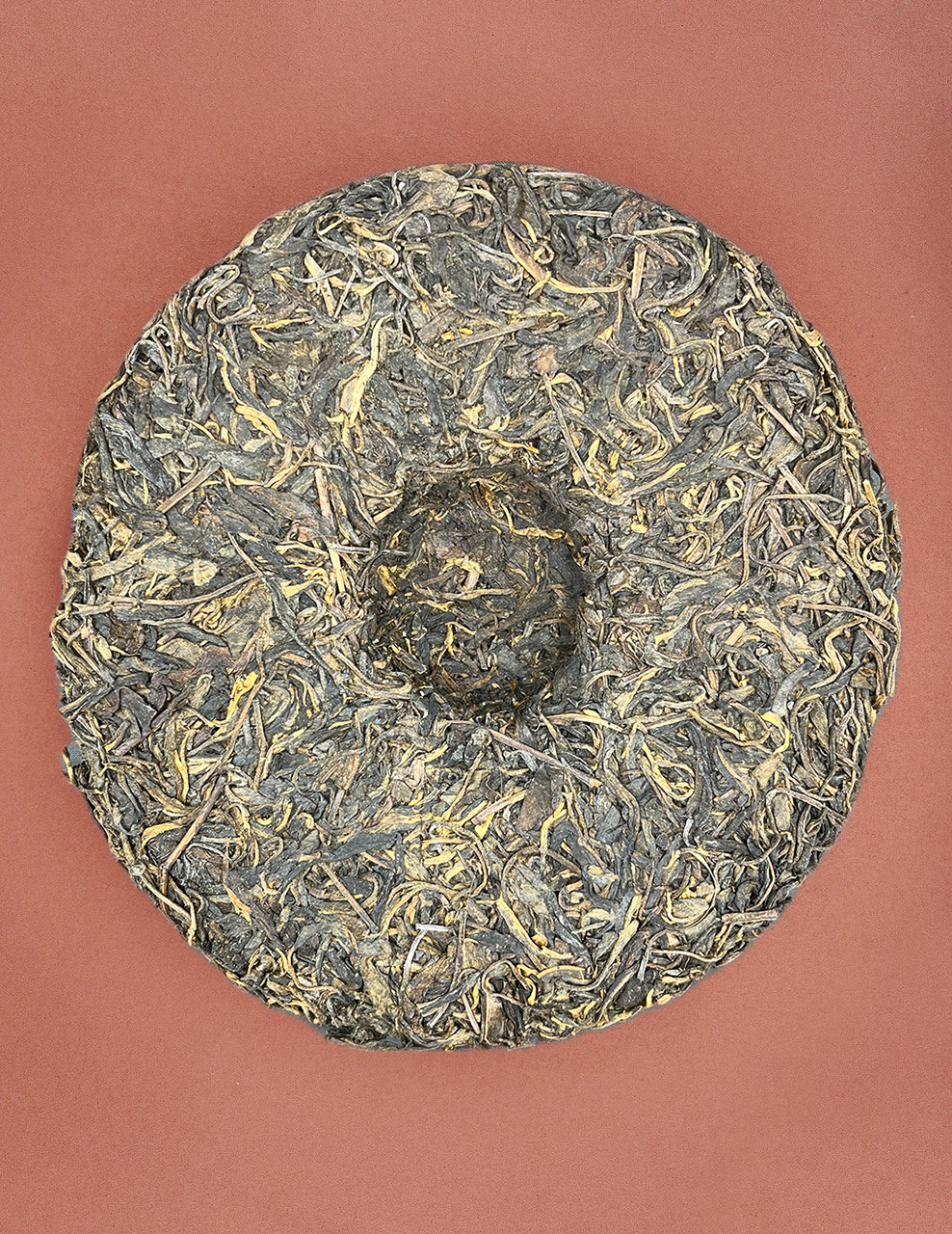 Видимо выдержанный шен: лист тёплого коричневого оттенка с минимальной зеленостью листа. Лист мелкого и среднего размера, около 20% почек, средняя плотность прессовки блина.