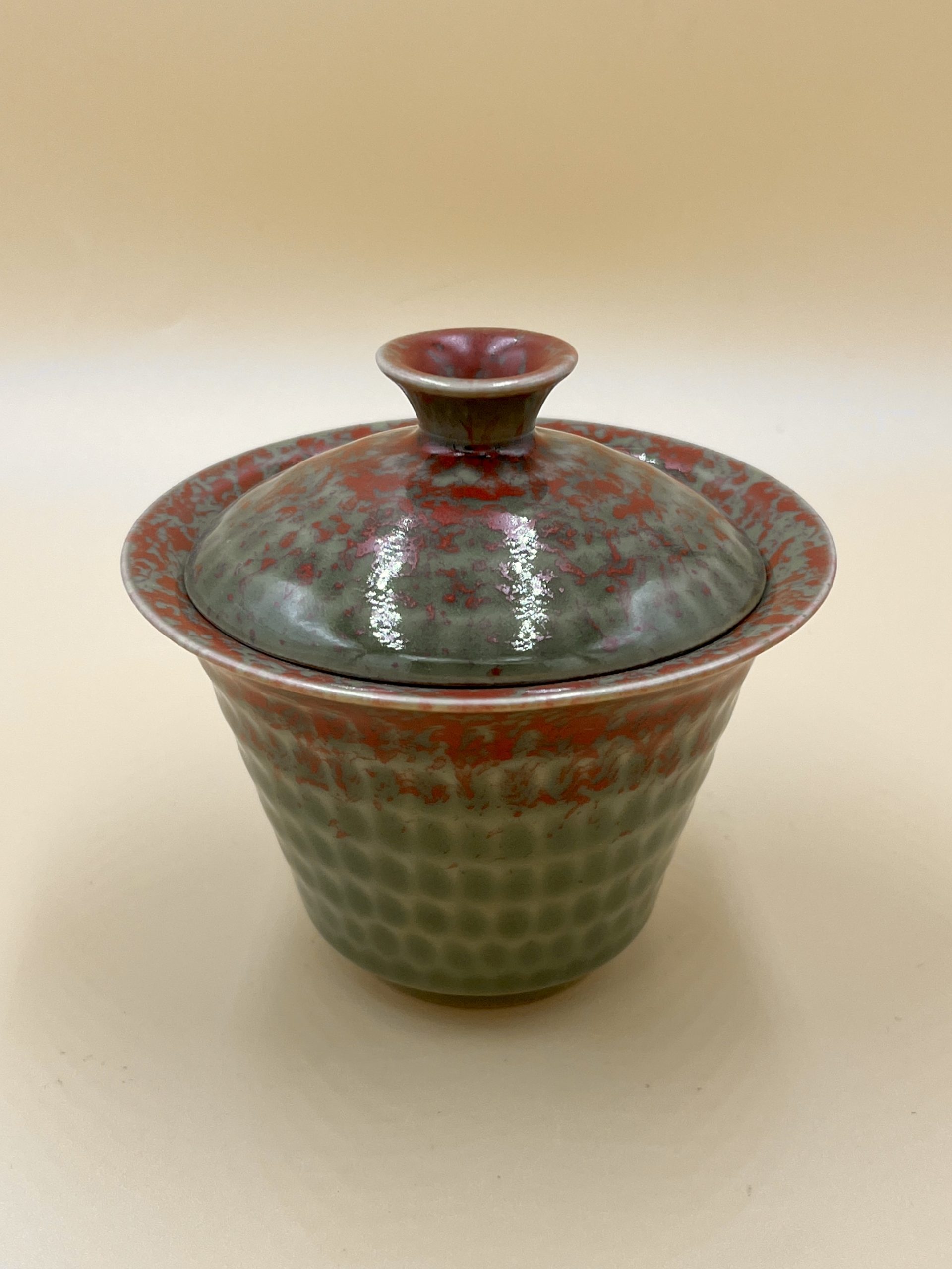 Вес гайвани 215 гр., высота 9 см, рабочий объем 120 мл. Яркая зеленая основа глазури и более матовые красные пятна. Гладкая глазурь имеет текстурный рельеф с выемками.
