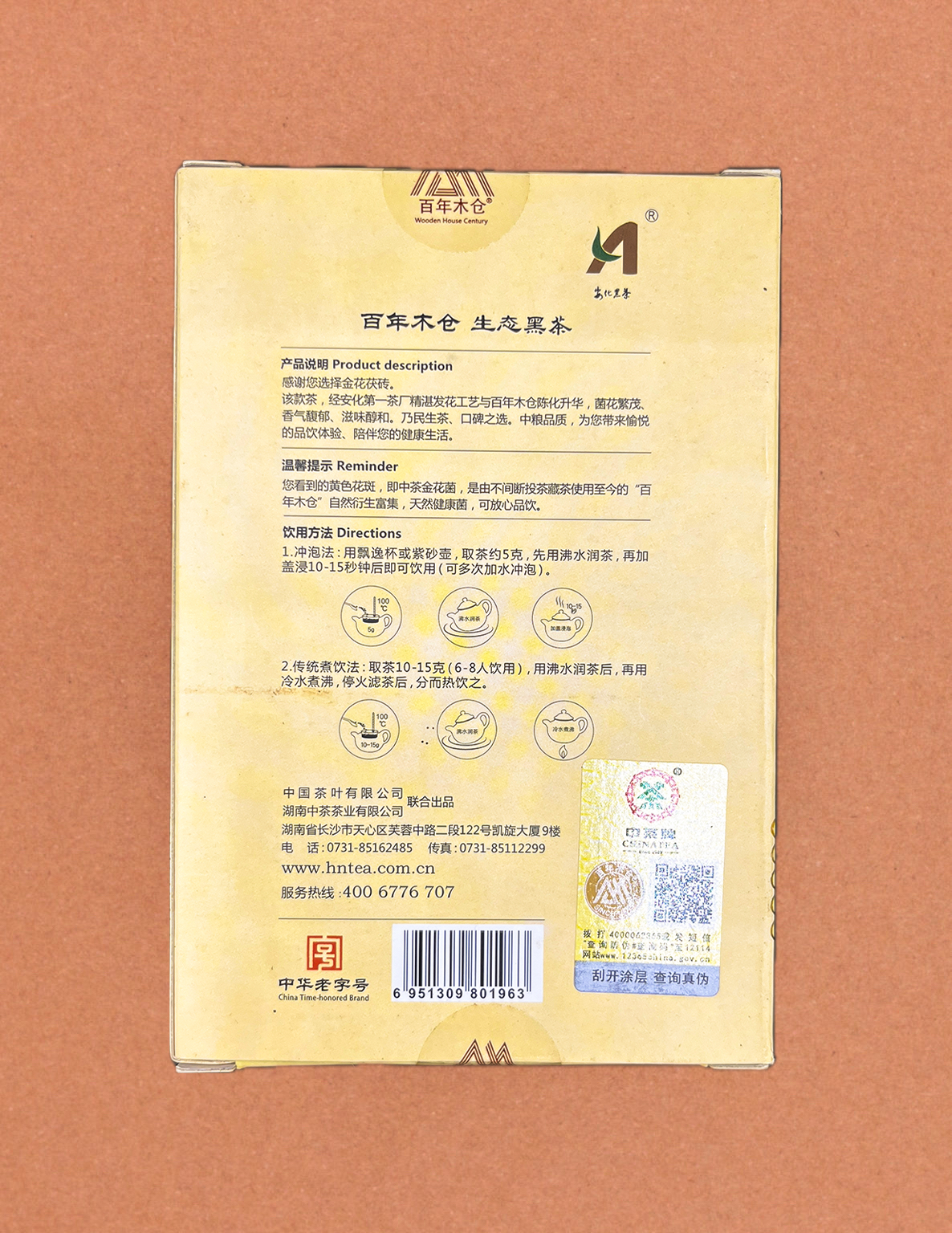 Этот чай был создан с помощью уникальной технологии Аньхуа на чайной фабрике Аньхуа № 1, созданной в 1902 году, и выдержан на вековом деревянном складе.