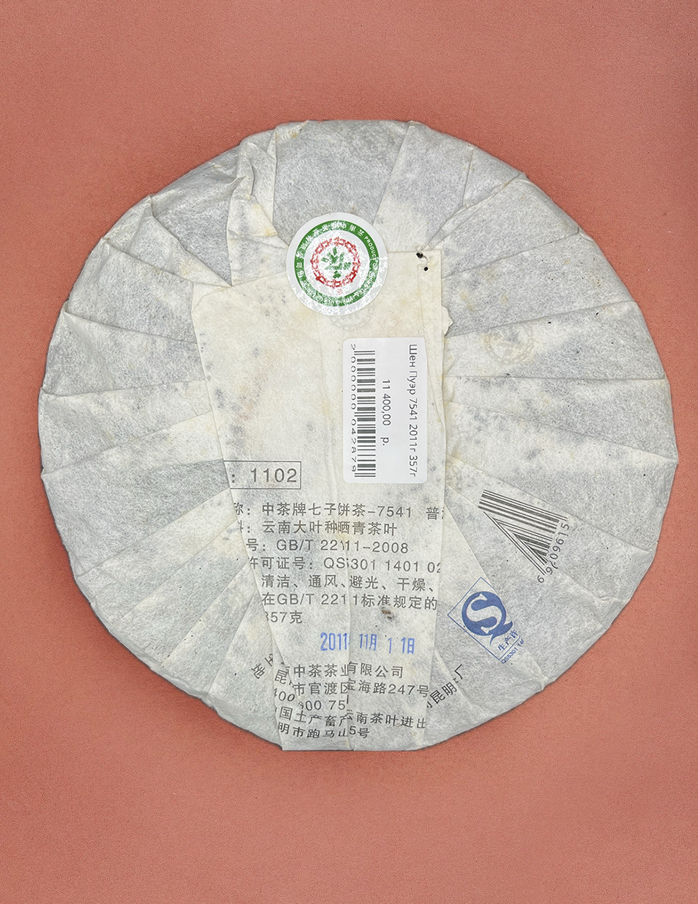 Выдержанный Шен Пуэр 2011 года от легендарной фабрики Чжун Ча (Zhong Cha, 中茶, Зелёная Печать), куплен напрямую у фабрики.