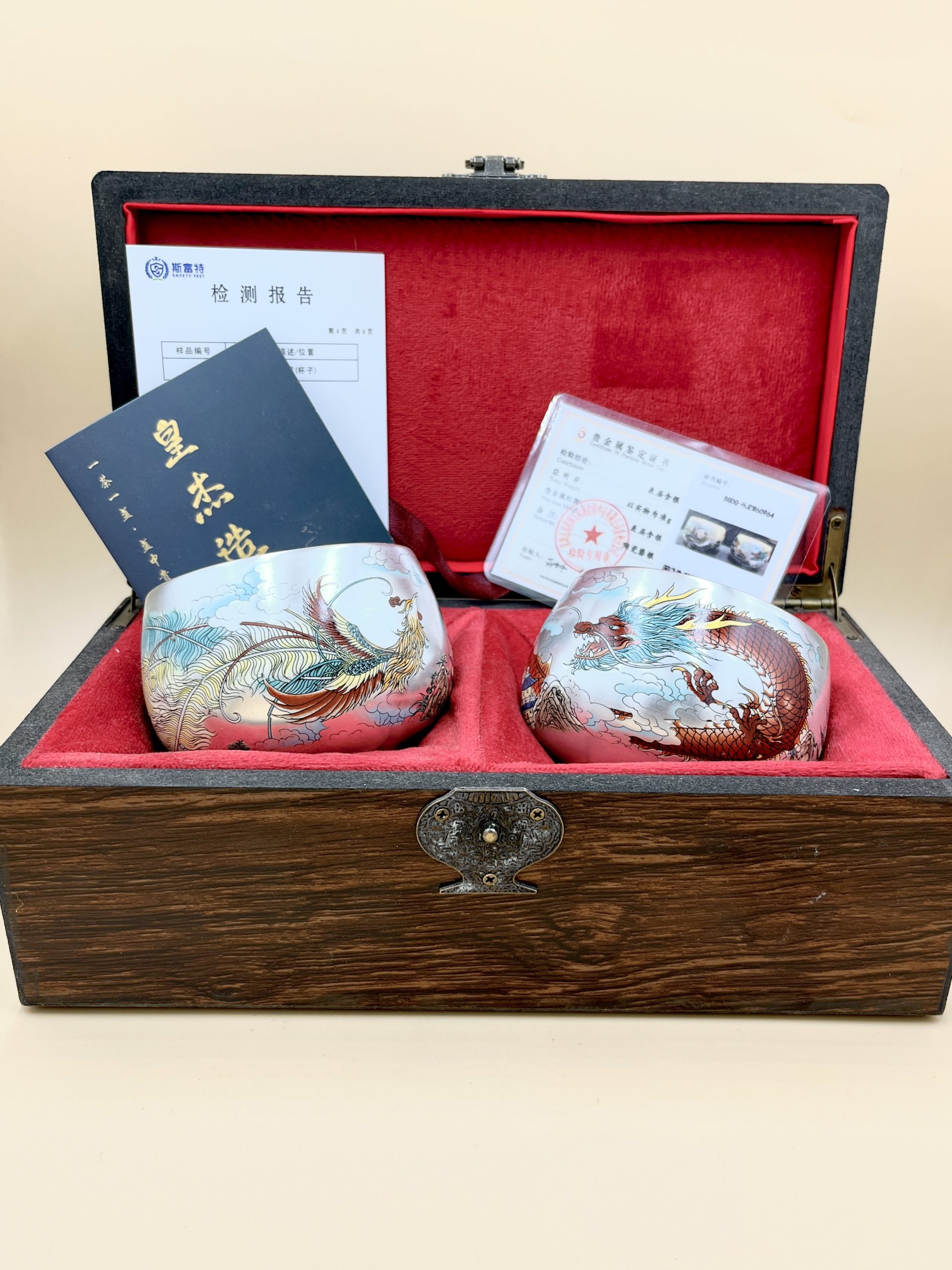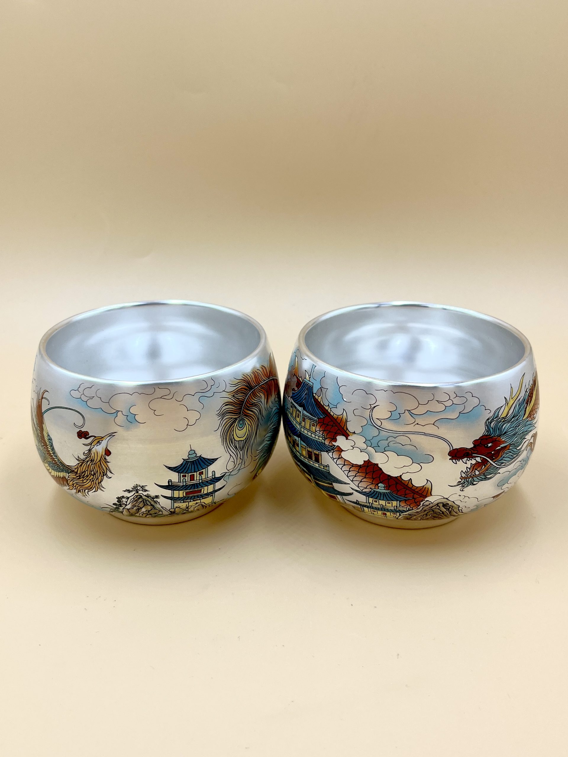 Яркие, светоотражающие, серебрянные с полу-матовым напечатанными рисунками дракона и феникса. Звонкие, глянцево-гладкие внутри, шероховатые из-за рисунков снаружи.