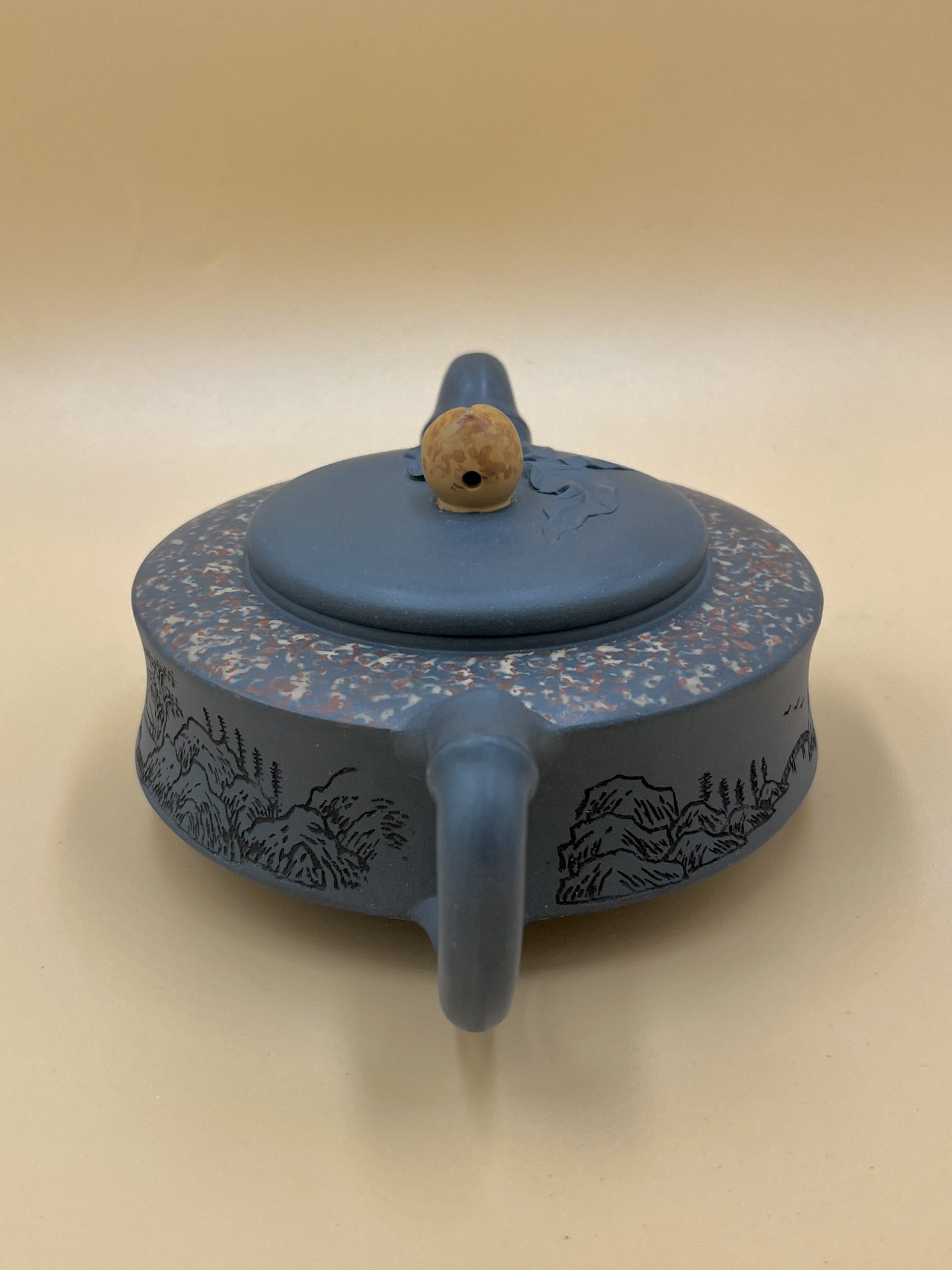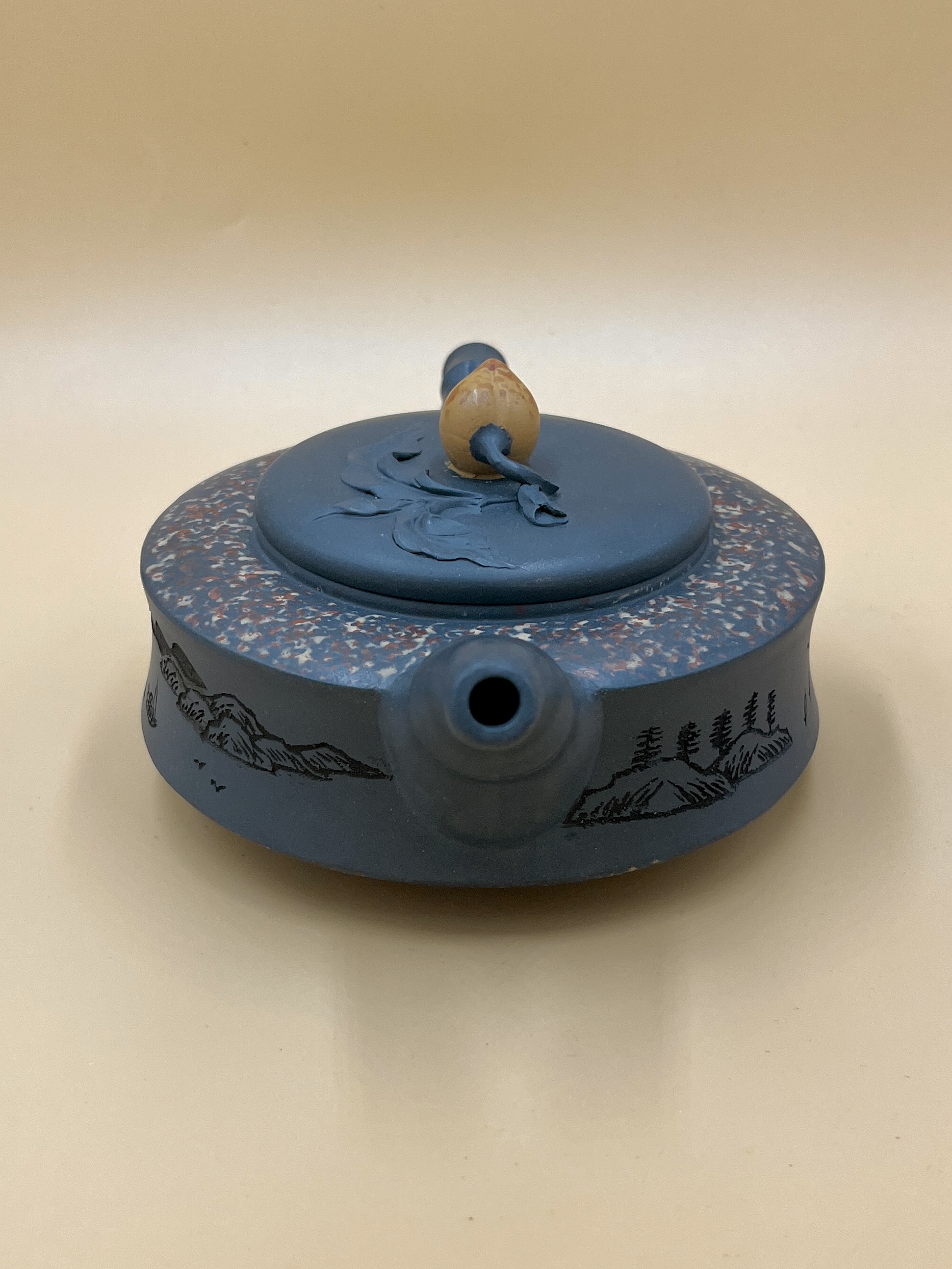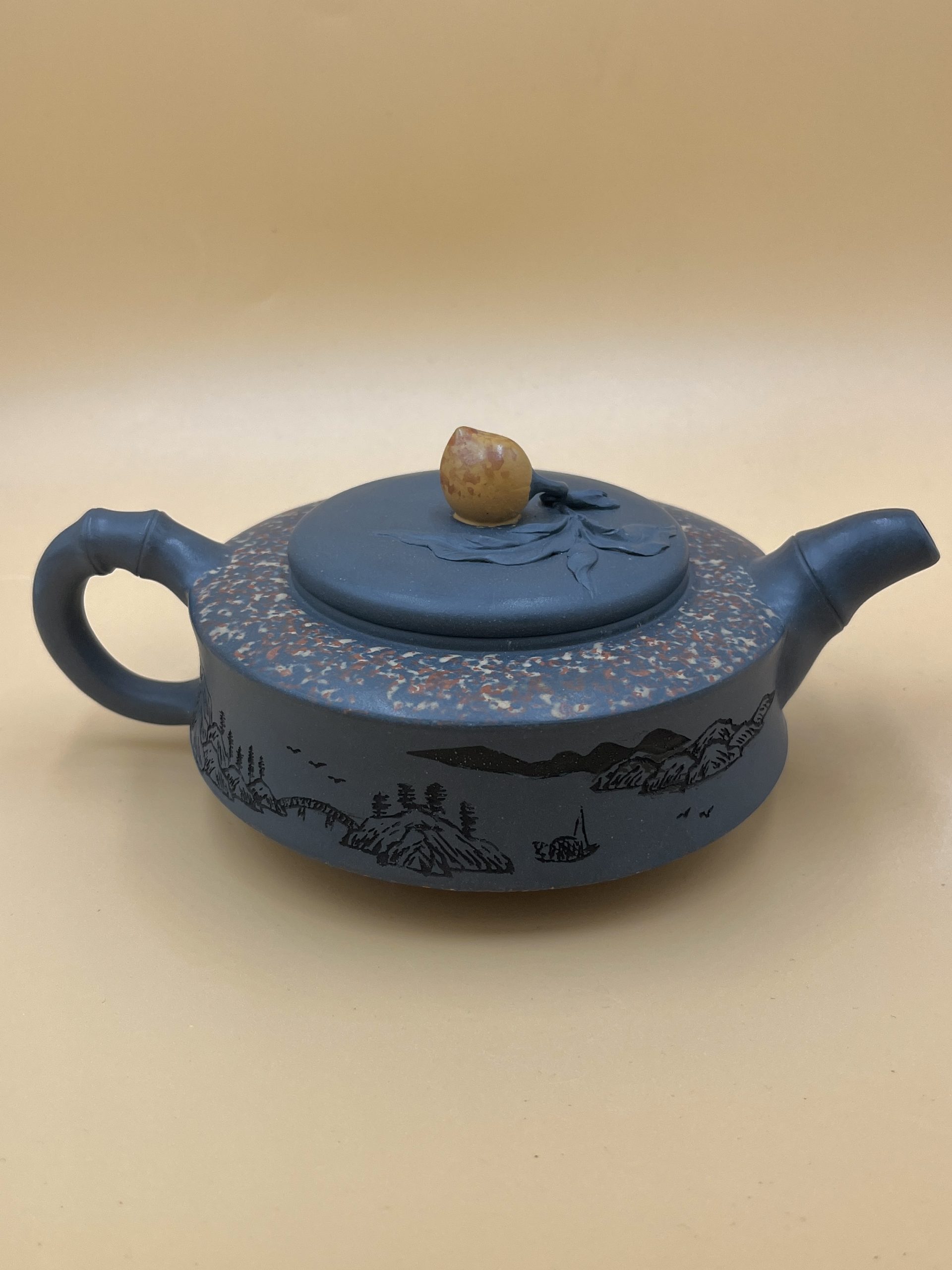 Авторский мастеровой полностью ручной исинский чайник. Форма близка к классическому Чжоу Пань 周盘 (Чжоуский Диск или Компас), но перетянутый “поясом”, образует чайник с талией. Сочетает в себе символику бамбука – стойкость и персика – бессмертие.