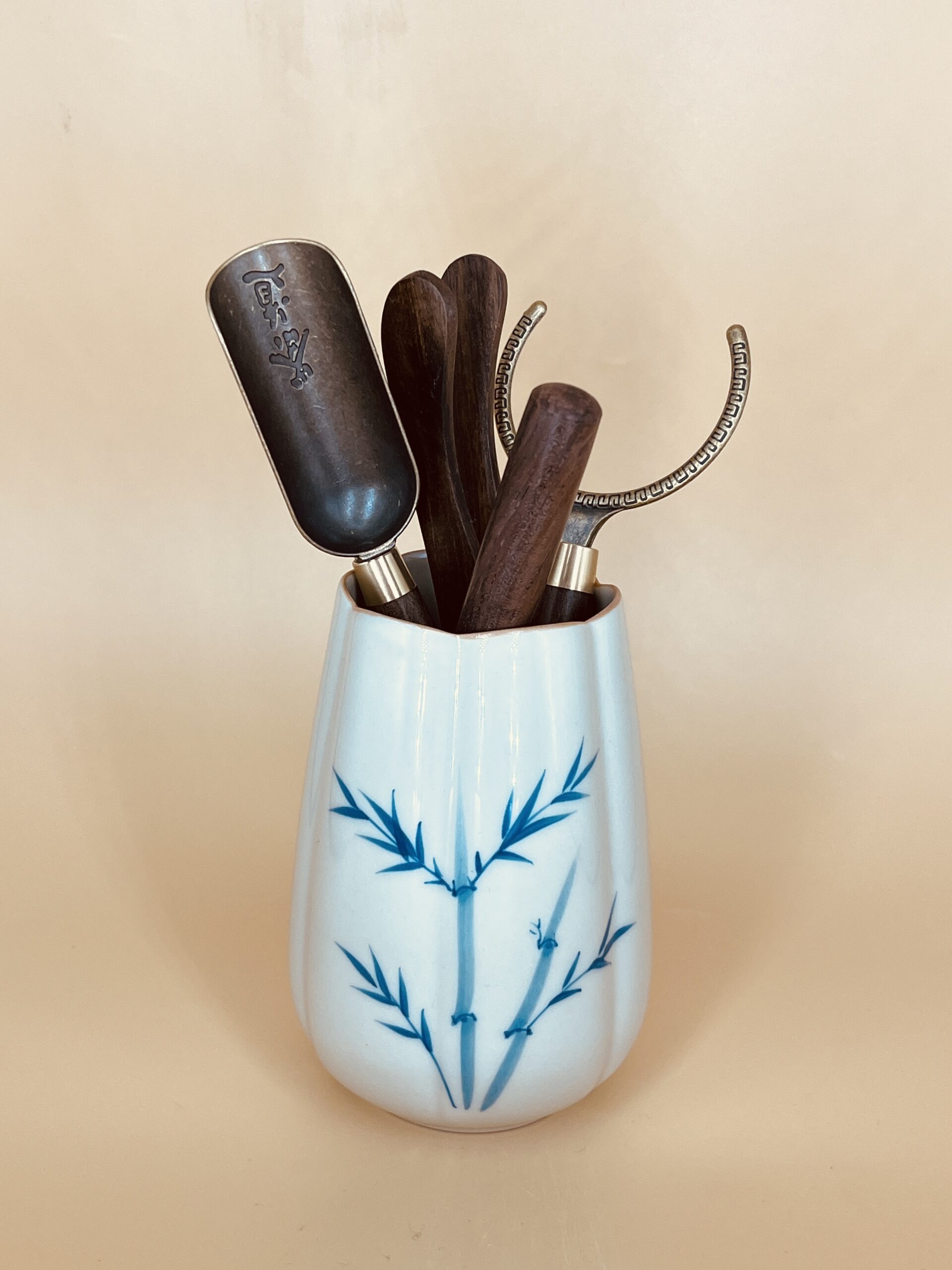 В набор входит: шило для спрессованных чаёв, ухват для подачи пиал, щипцы для пиал из бамбука, лопатка для чая, стакан из толстой керамики с ручной росписью ветки бамбука.