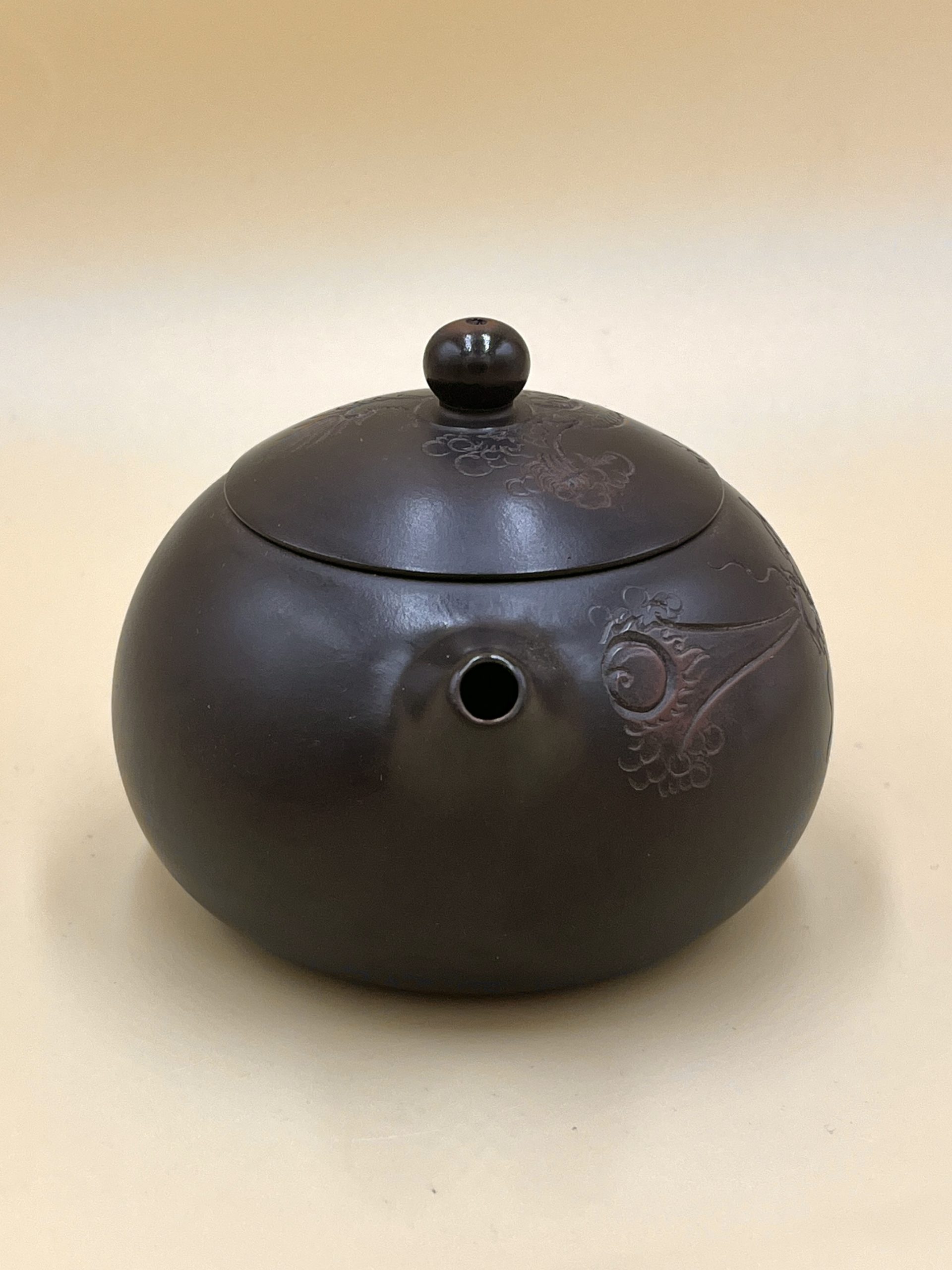 Увесистый, полуглянцевый, с ярким металлическим отзвуком при соприкосновении крышки с телом чайника. “Железистая” характерная для нисин глина с оттенками меди.