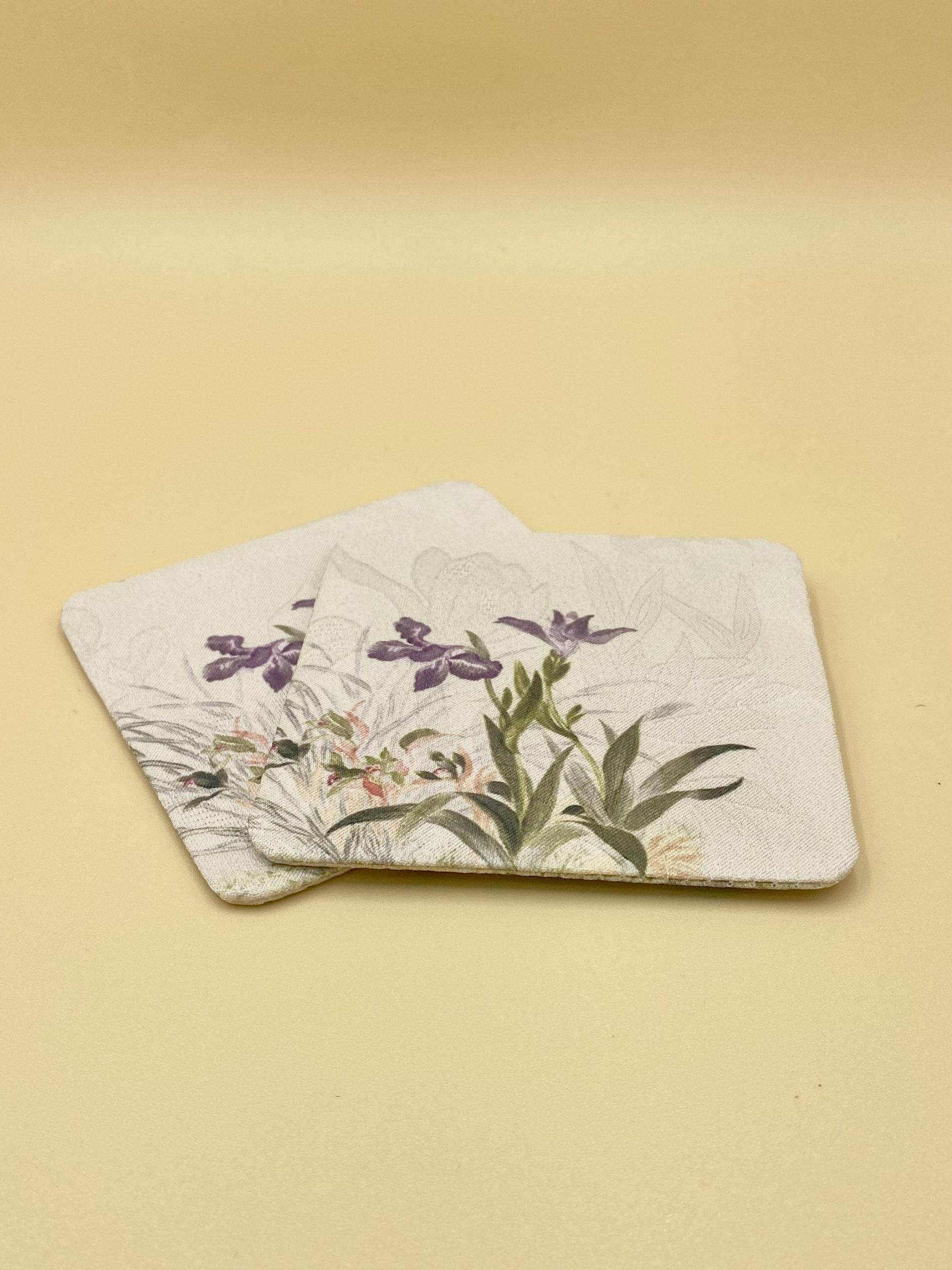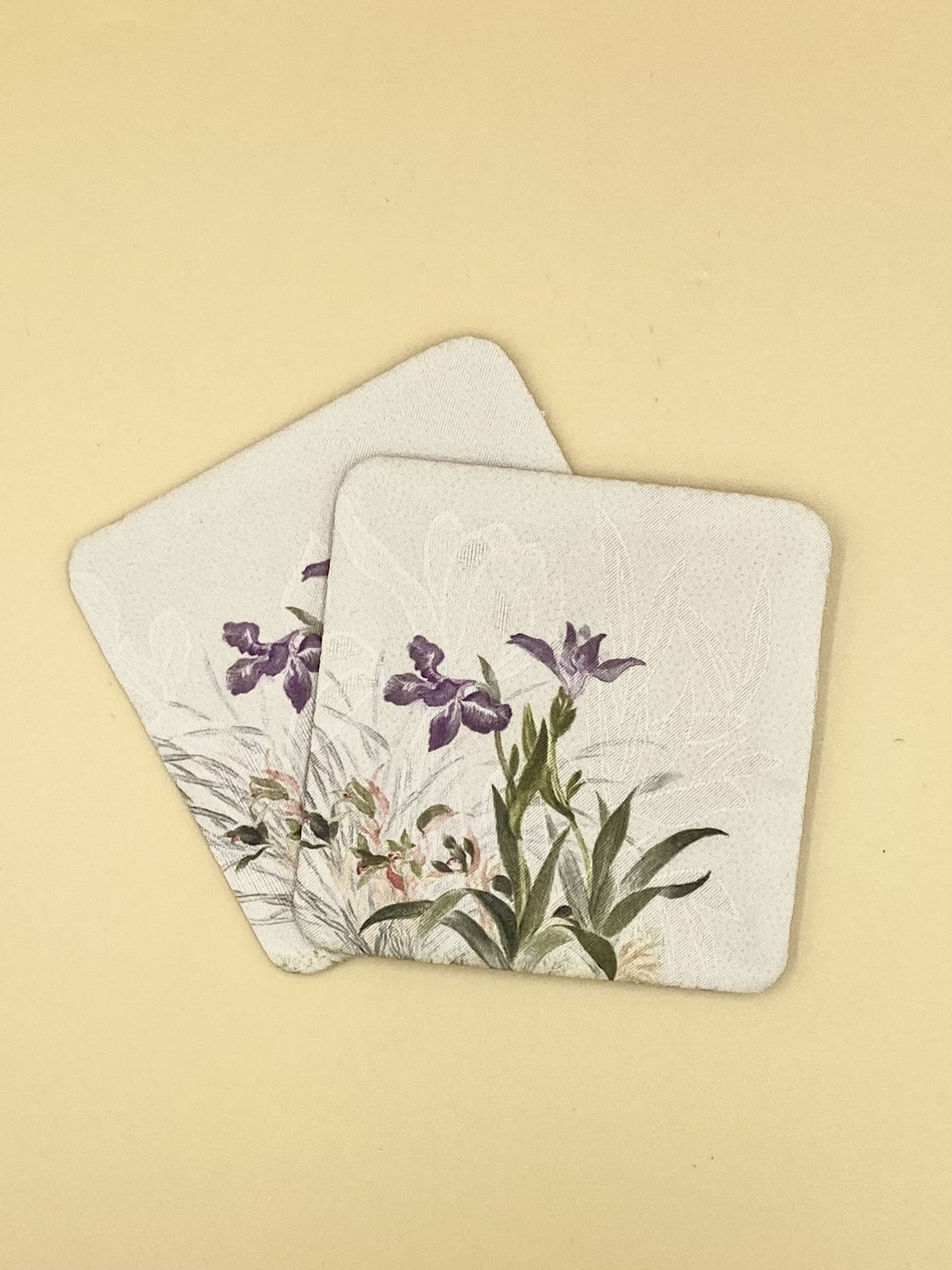 Классическая тканевая подкладка под пиалу с изображением цветов ириса. Сделана из двух слоев плотной ткани, отлично впитывает влагу, приятная визуально и на ощупь.