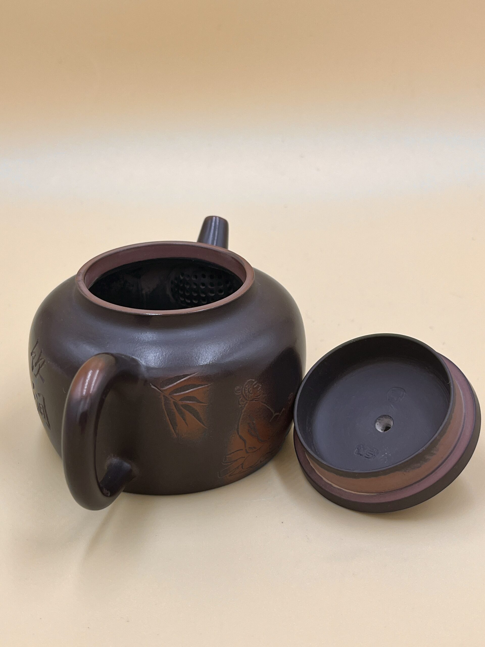 Классический по форме, но не по содержанию чайник из Исинской и Нисинской керамик, ручная работа с ручной резьбой птички на ветке. Полное название чайника “Плоский ковш для медитации” 静心扁瓢.