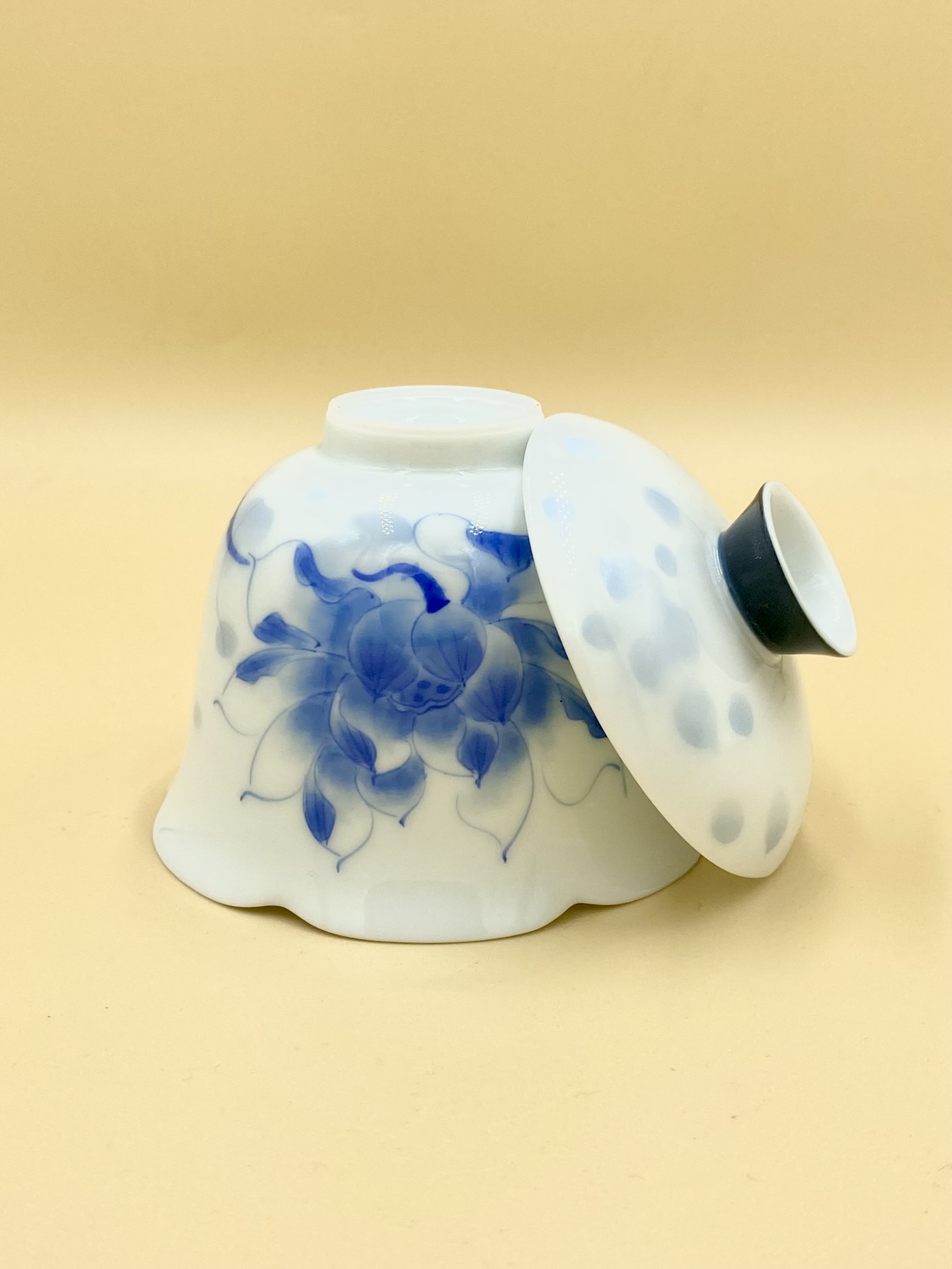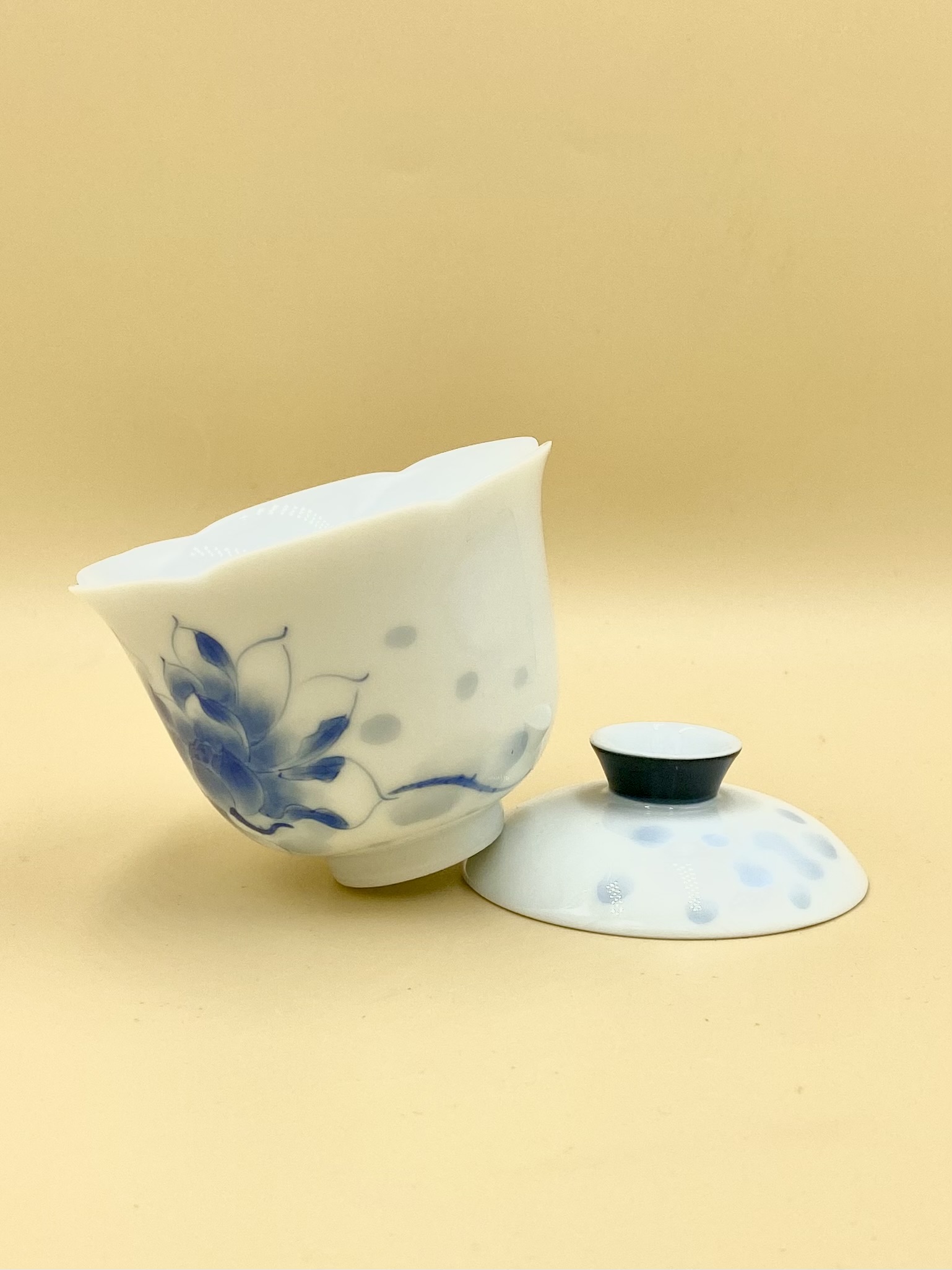 Изящная гайвань с подглазурной ручной росписью кобальтом цветка Лотоса, символом чистоты и совершенства.