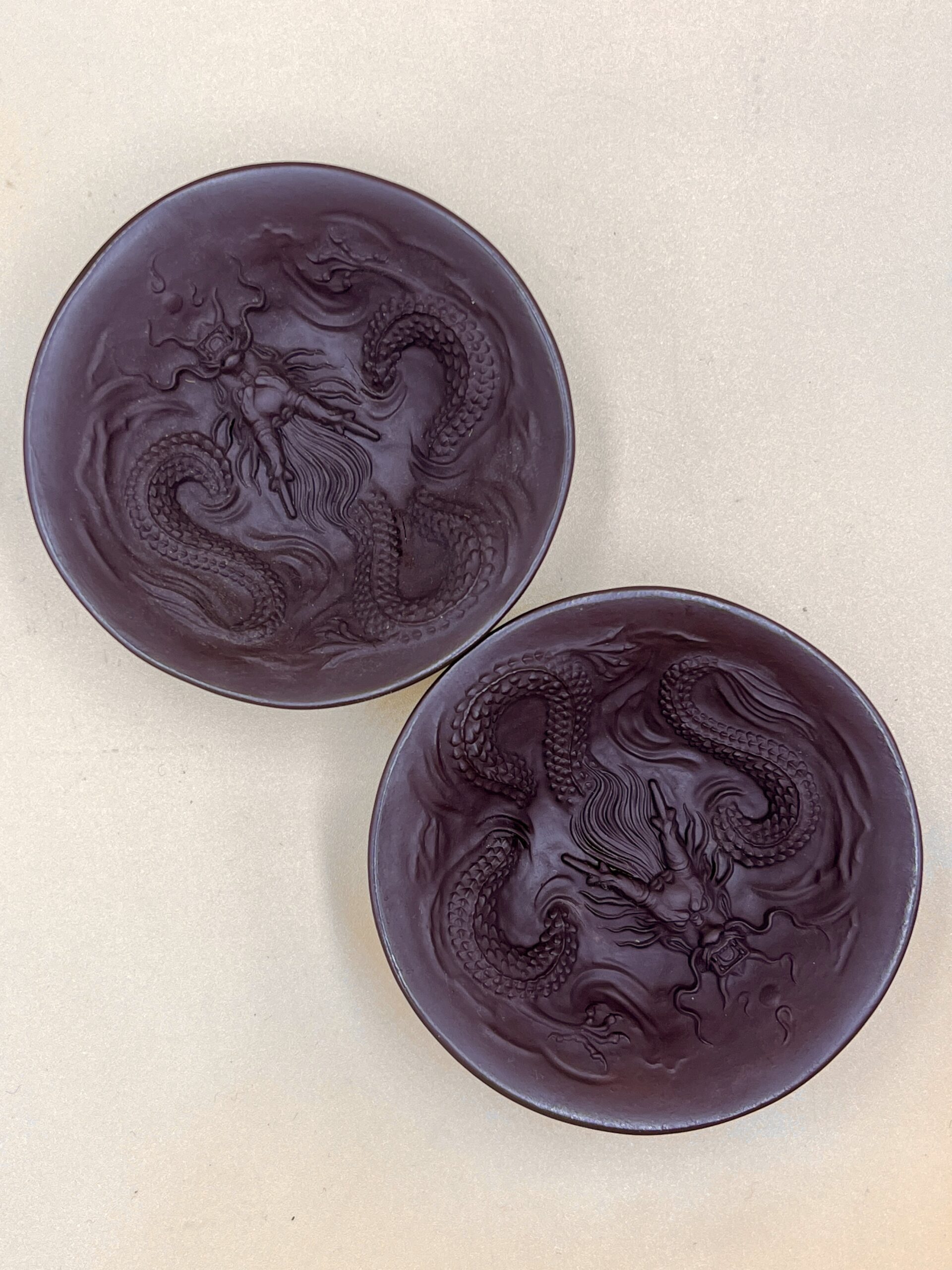 Классические правильные для глазури Жу Яо оттенки. Разный рисунок кракле в зависимости от состава (цвета) глазури. Полу-гляцевая глазурь. Имитация старинной технологии заливки глазурью – каёмка коричневого цвета под цвет глины.