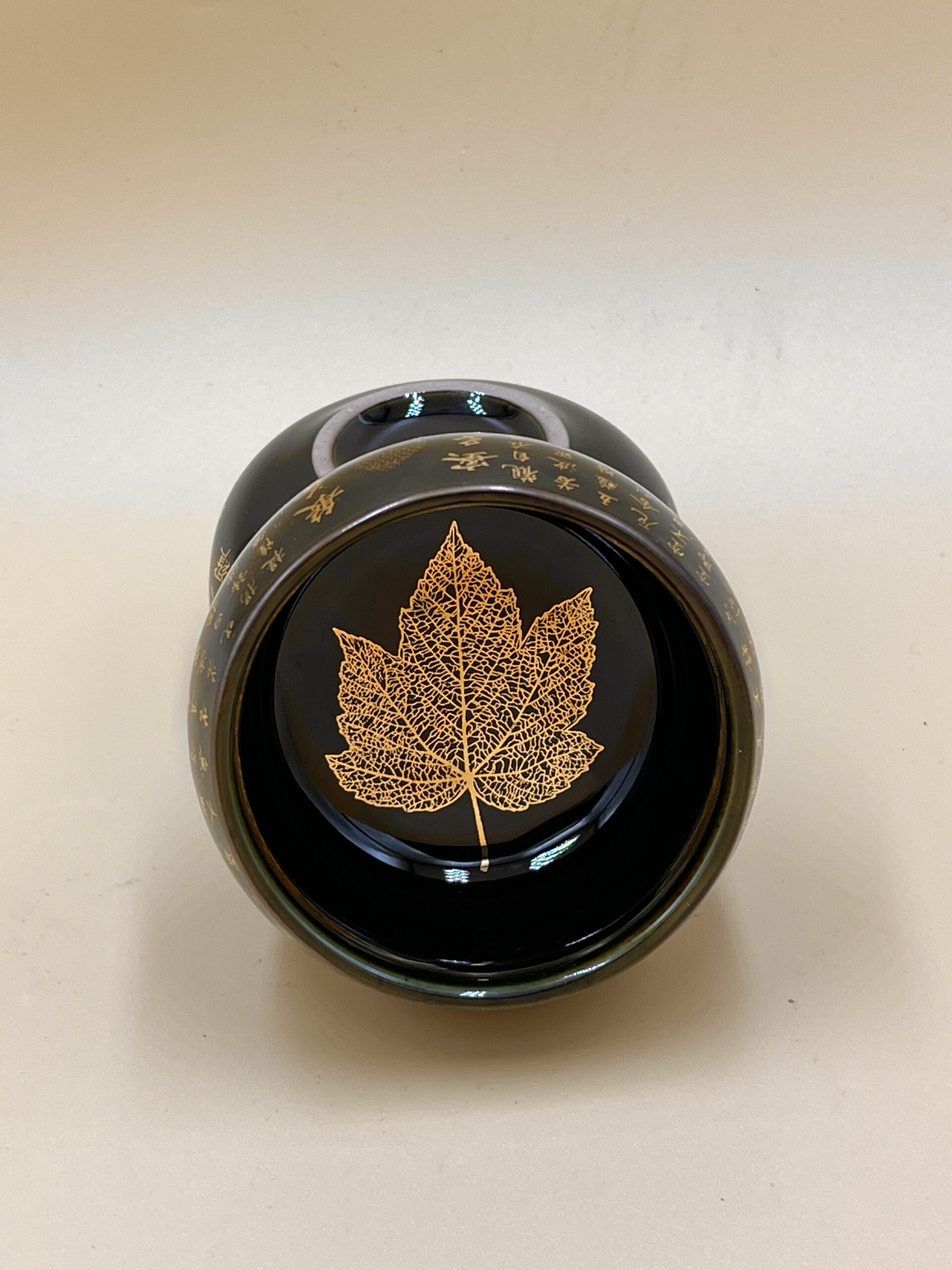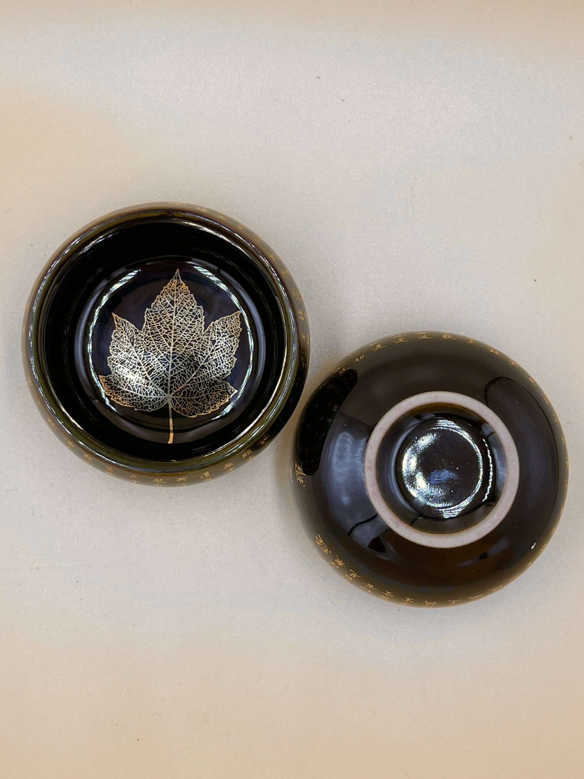 Глянцевая яркая пиала с имитацией оттиска листа клёна на дне. Чёрно-синий оттенок и желтый оттенок сусального золота.