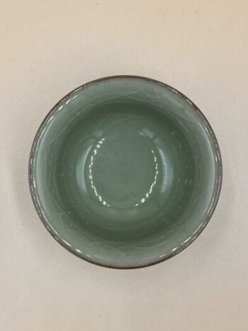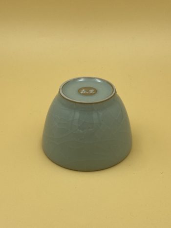 Конусообразная пиала керамики Лунцюань с невероятным мелким снежно-ледяным окрасом глазури. Приглушённый изумрудный оттенок с белыми узорами глазури.