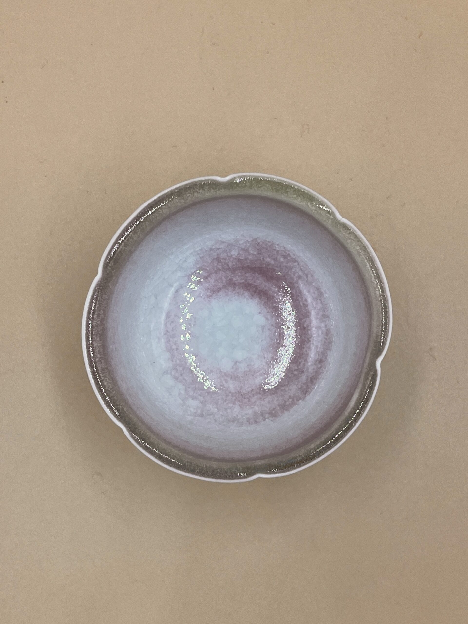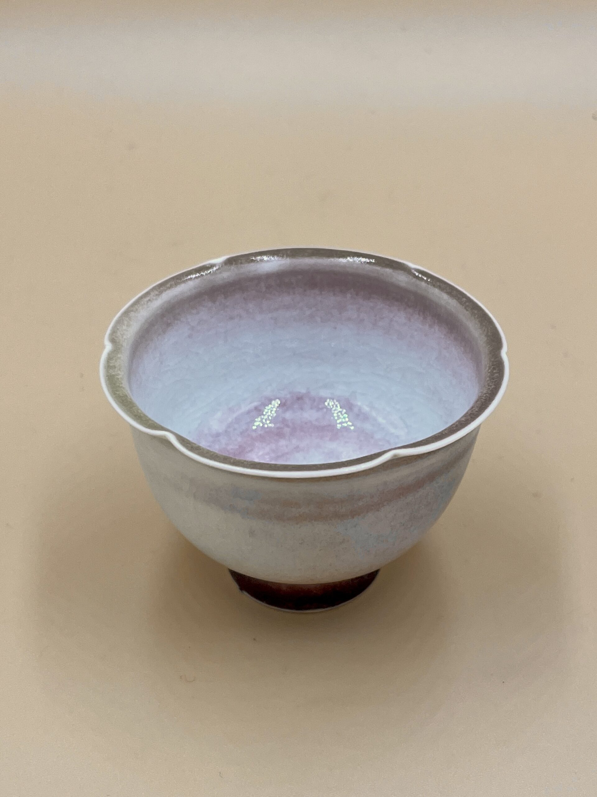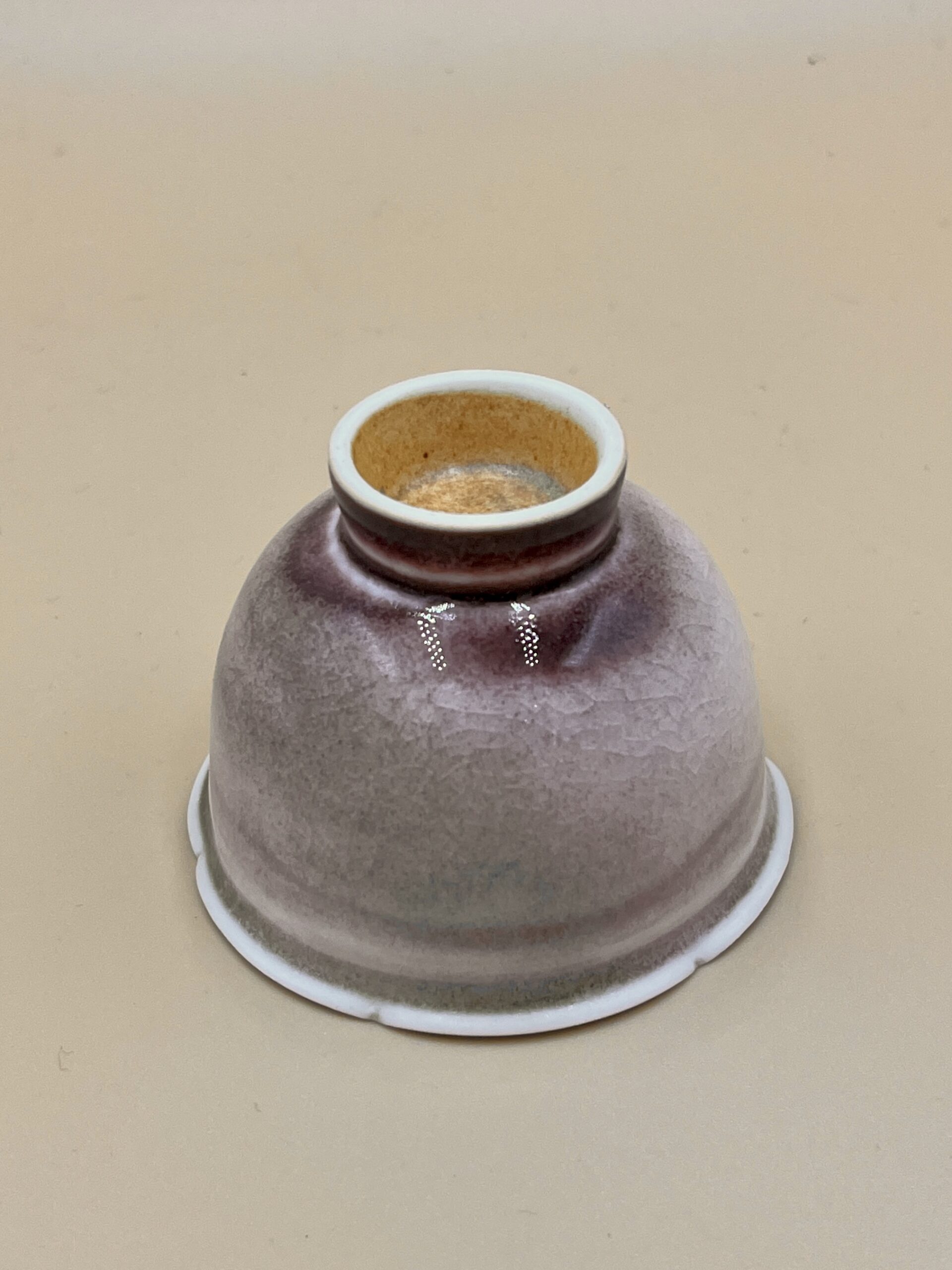 Элегантная тонкая пиала с мелким рисунком краклэ, напоминающим “битое стекло”. Красивейший бордовый градиент глазури, тонкая стенка.