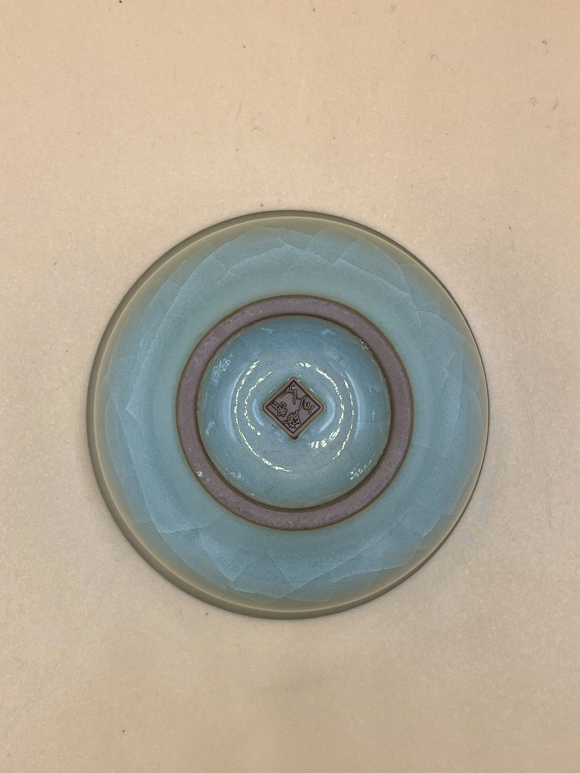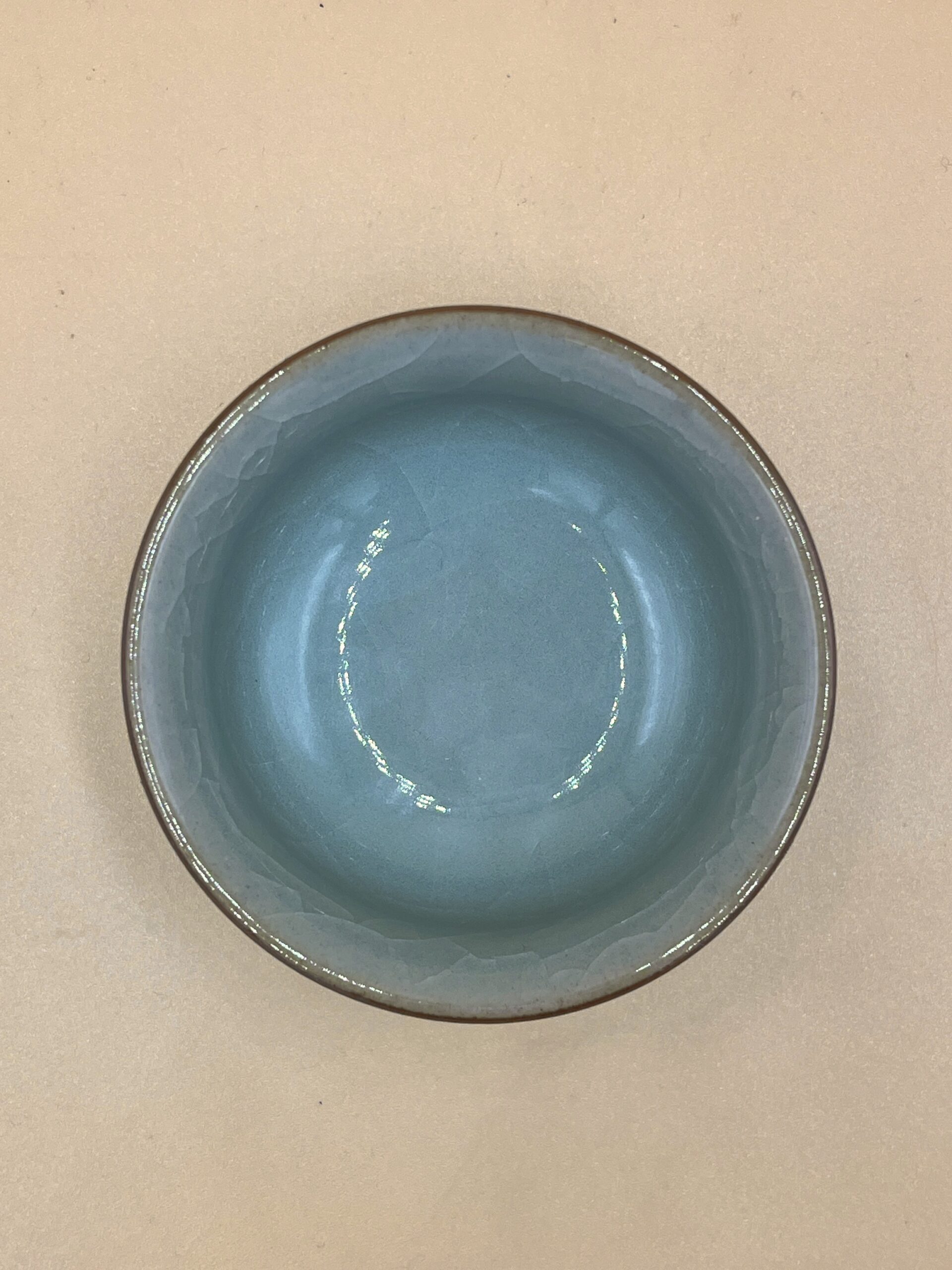 Невероятно красивая бежевая пиала с двумя пурпурными разливами глазури снаружи и на внутренней стенке. Неповторимый рисунок глазури. Покатое яйцеобразное скруглённое основание требует аккуратной постановки пиалы на стол.