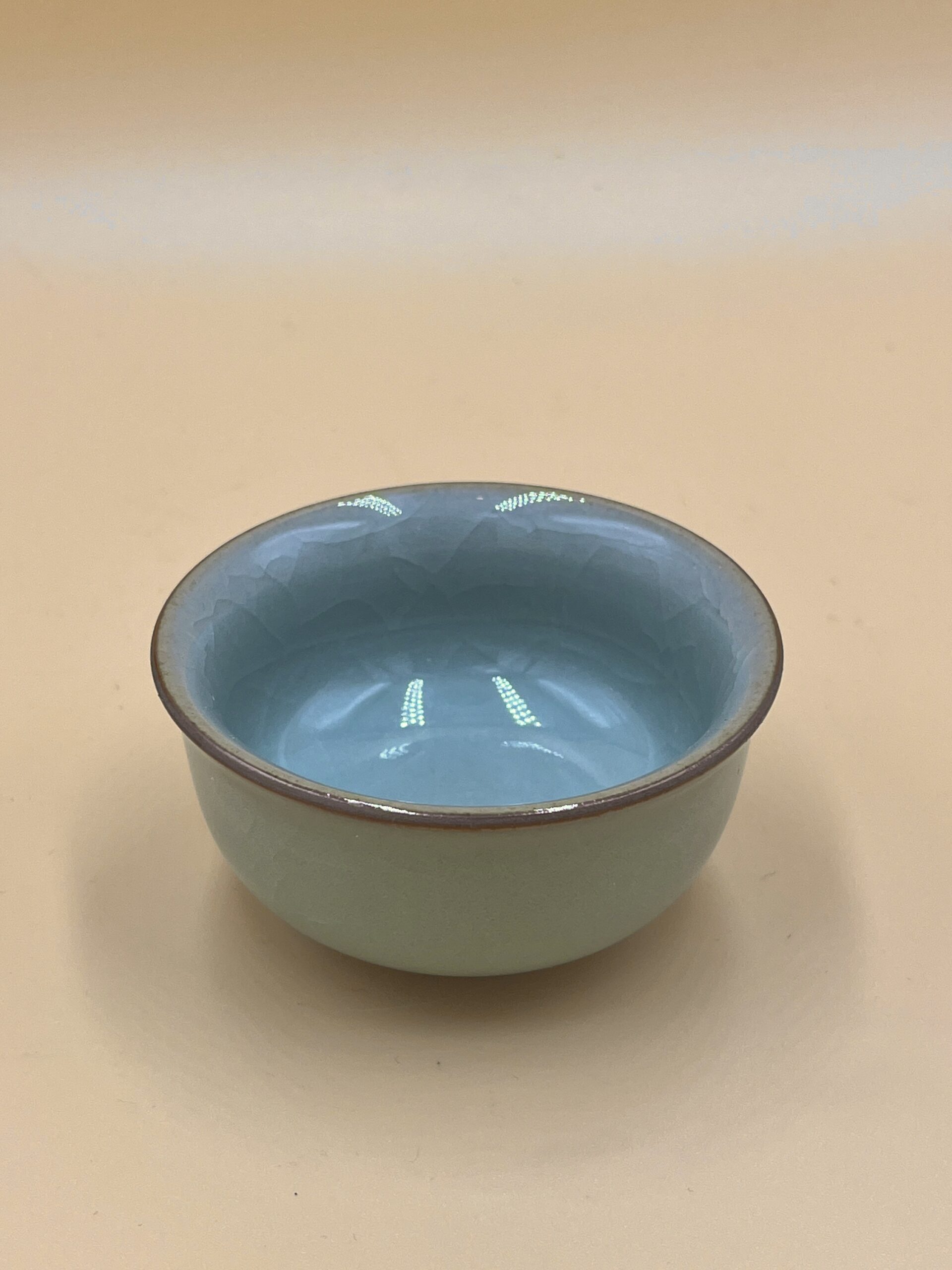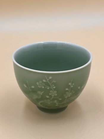 Зеленая пиала со средней толщиной стенки. Вес 115 гр., объем 220 мл., рабочий объем 200 мл. Градиент от тёмно-зеленого до светлого, имеет голубой оттенок.
